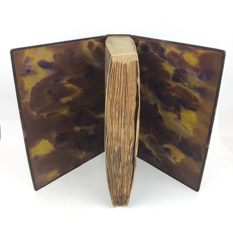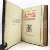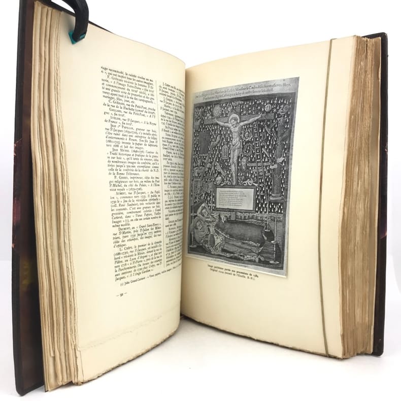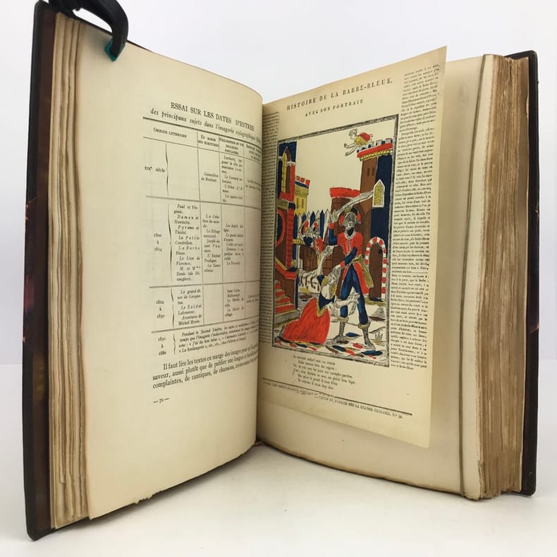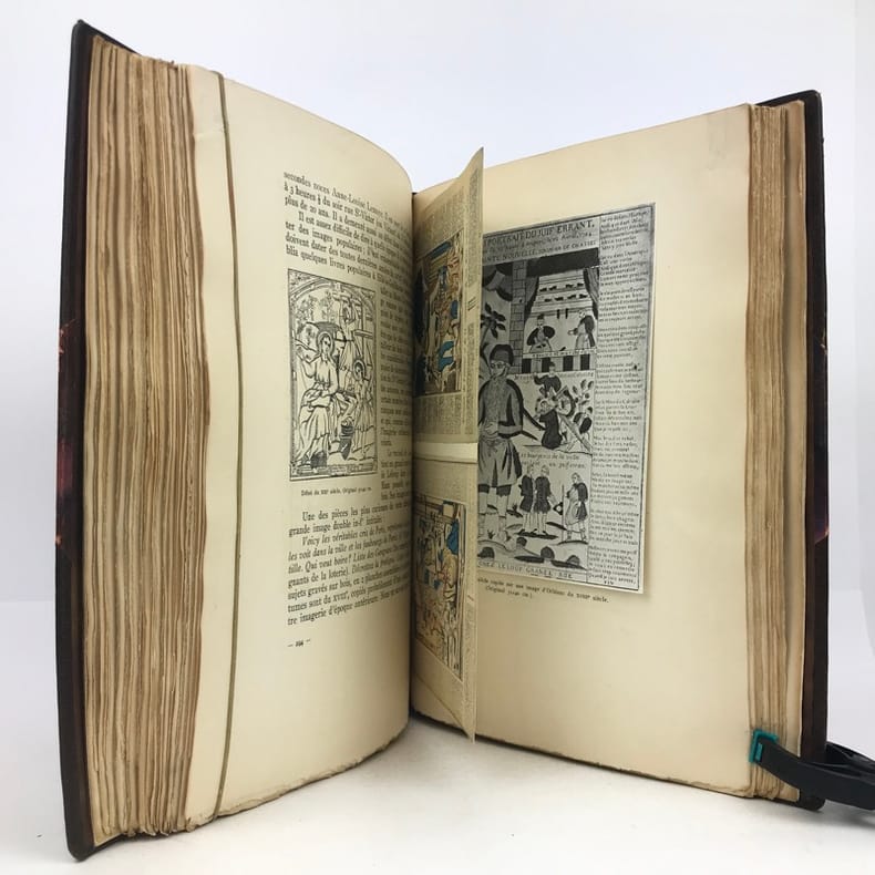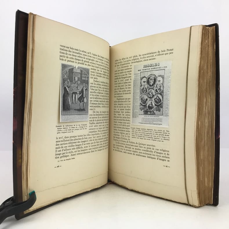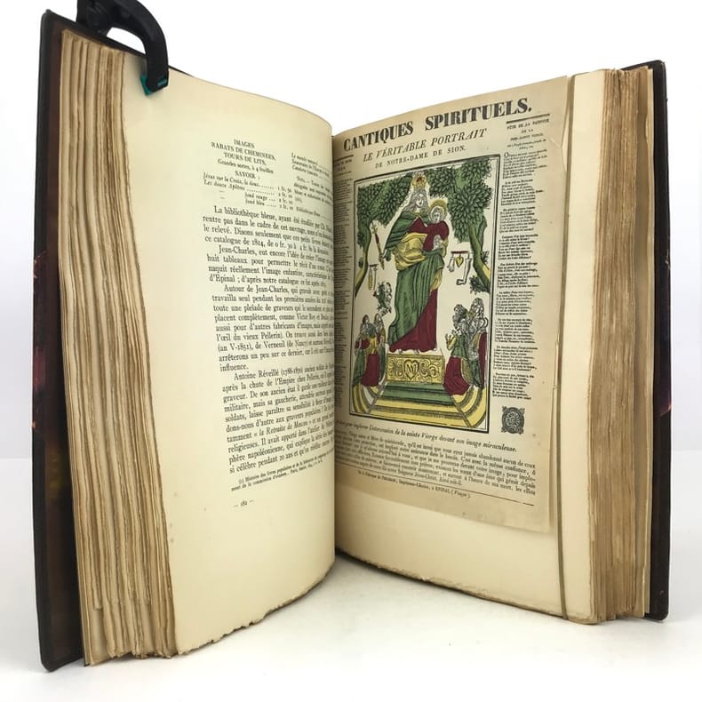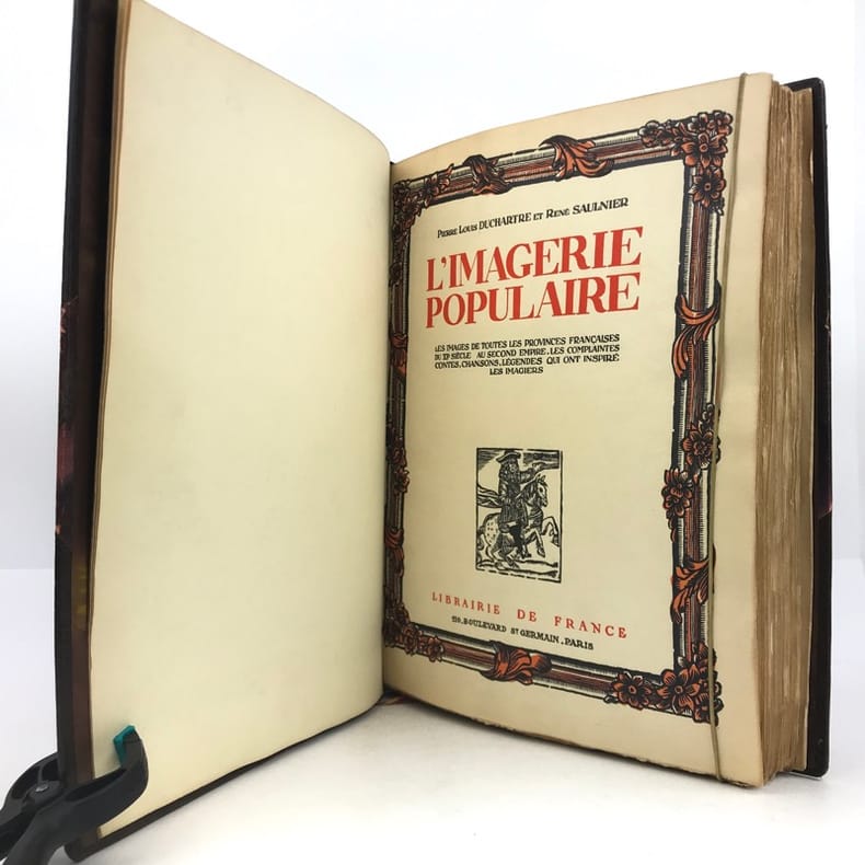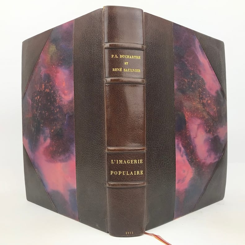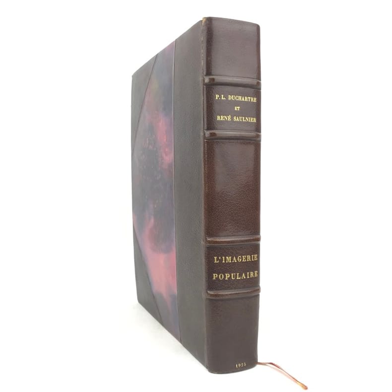 1 volume in-4 grand de marge (31 x 23,5 cm), demi-maroquin brun à coins (reliure de l’époque, signée J. Van West) , dos à nerfs, tête dorée, couverture illustrée et dos conservés. 448-[2] pages (complet). Petits frottements au dos de la reliure. Bon état. ÉDITION ORIGINALE illustrée de 34 planches en couleurs reproduisant des images populaires des 4 coins de la France, sur papier teinté, de nombreux bois gravés in-texte, certains à pleine page, et petites vignettes reproduisant des documents, et contrecollées in-texte. 1/156 exemplaires sur papier de Hollande Pannekoek, celui-ci un des 5 de tête comportant une suite complète des 34 hors-texte en couleurs sur papier ancien, (n°4). Les auteurs : Pierre-Louis Duchartre (1894-1983) conservateur de musée français, spécialiste de l'histoire de l'imagerie populaire, de l'histoire de la chasse et agent de la récupération artistique en Allemagne après la Seconde Guerre mondiale; et son collègue et ami, le collectionneur René Saulnier. Très bel exemplaire.