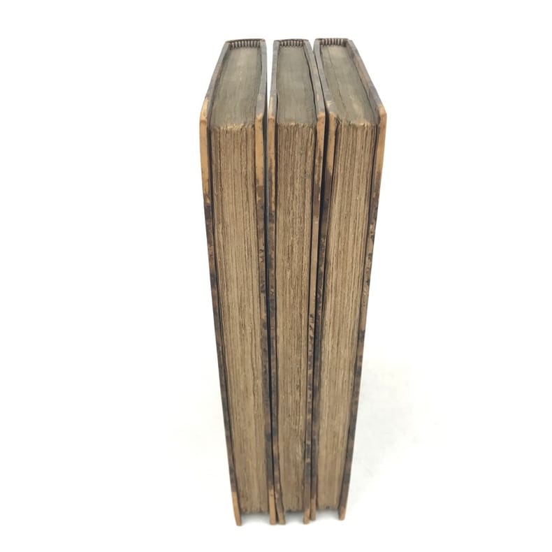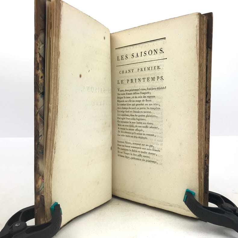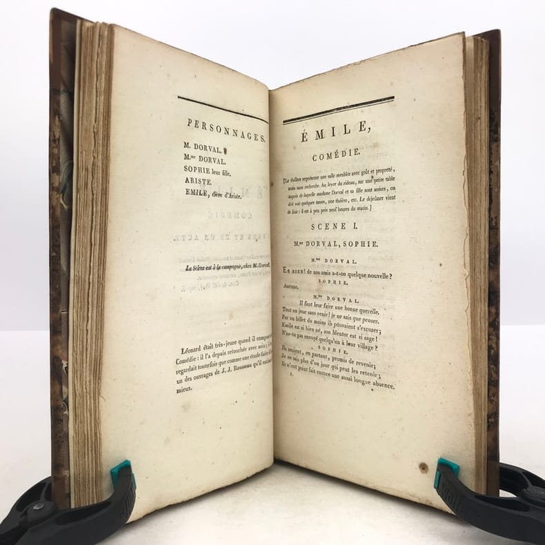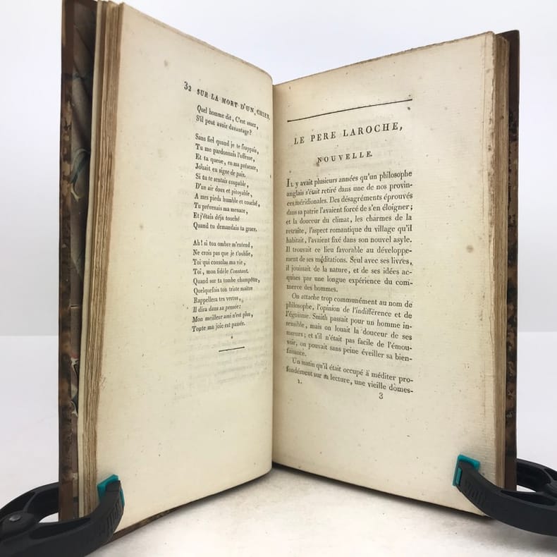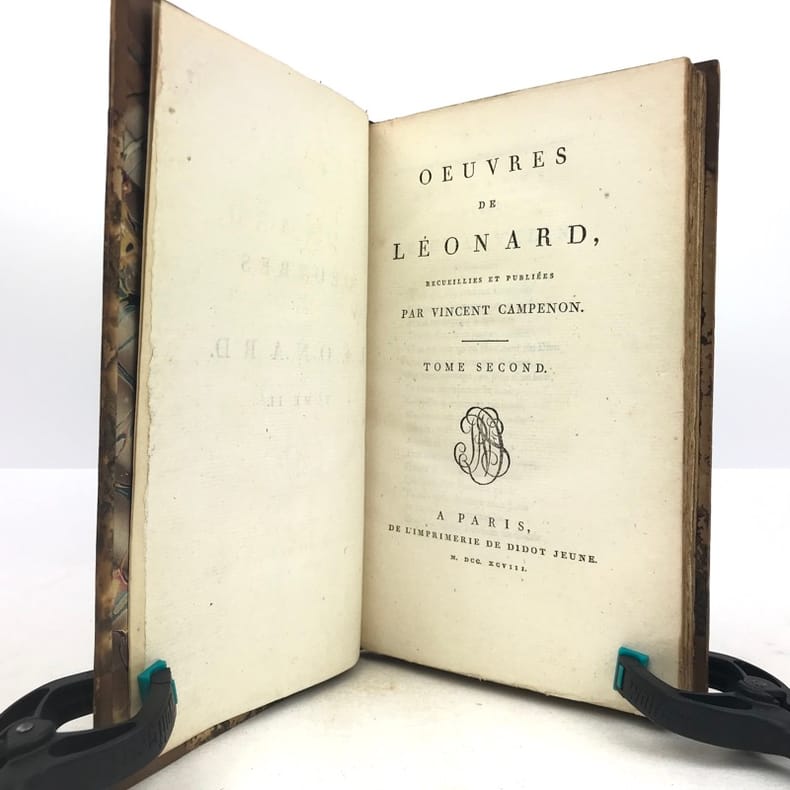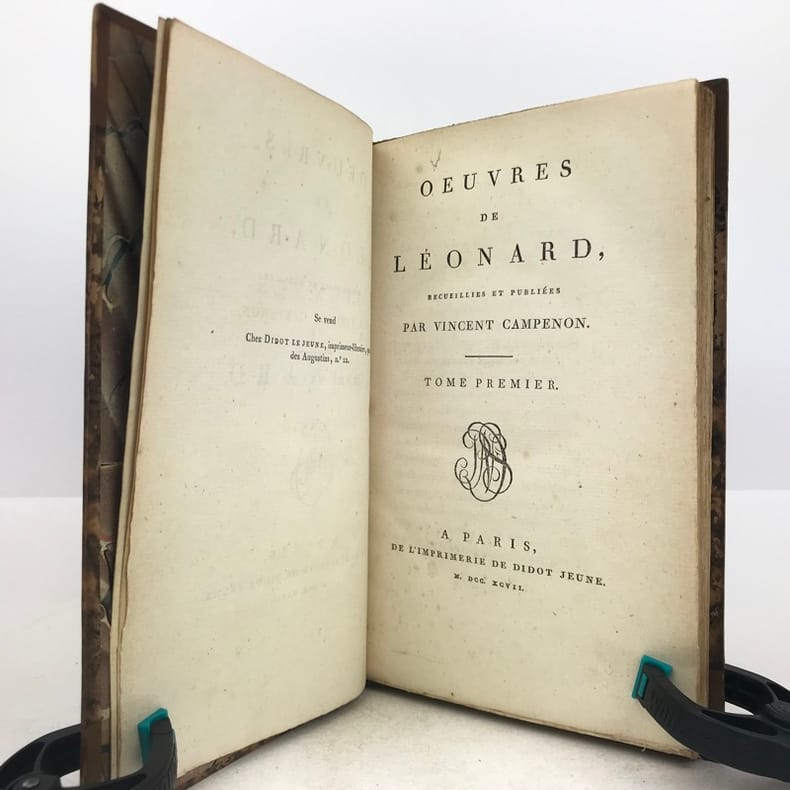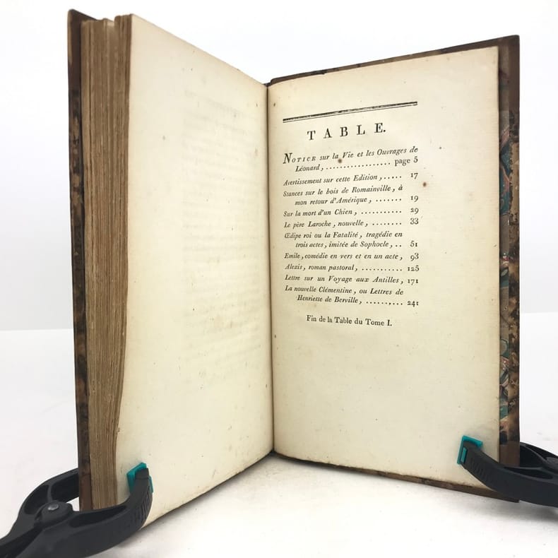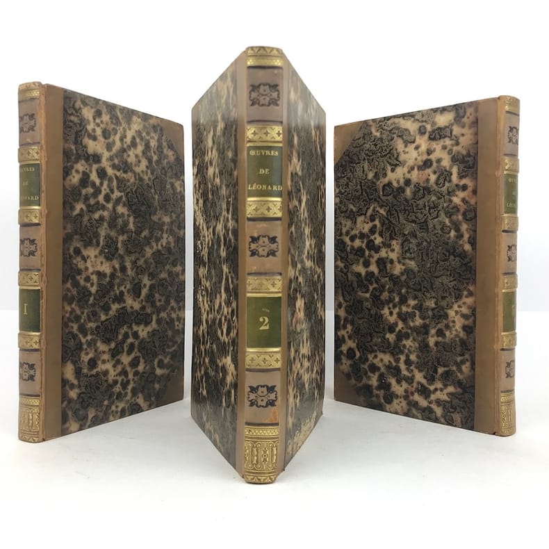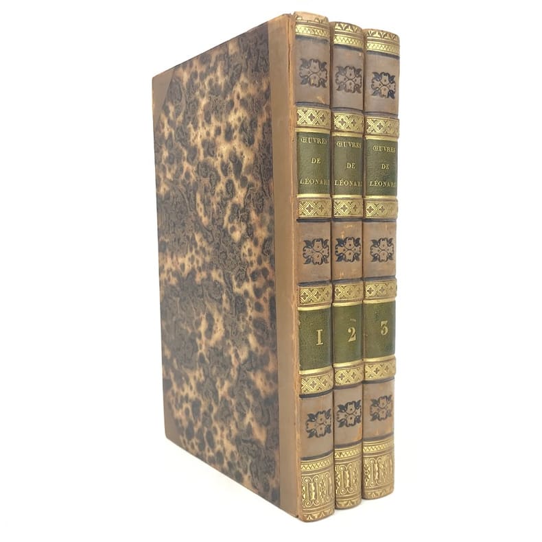 3 volumes in-8 (21,5 x 13,5 cm), demi-veau fauve à coins (reliure de l’époque), dos à nerfs orné, pièces de titre et de tomaison en maroquin vert, ex-libris aux armes sur le contreplat [Tenant de la Tour ?]. 313-[3] ; 292 ; 352 pages (complet). Coins et mors frottés, dos légèrement insolés, rousseurs. État correct tout de même. Nouvelle édition des œuvres de Nicolas-Germain Léonard (1744-1793), poète né en Guadeloupe et couronné dès ses 18 ans par l’Académie de Rouen pour ses vers. Ses œuvres sont ici mises en forme par Vincent Campenon (1772-1843), également originaire de Guadeloupe et correspondant de Bernardin de Saint-Pierre. Bon exemplaire.