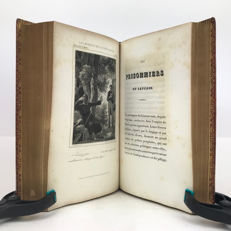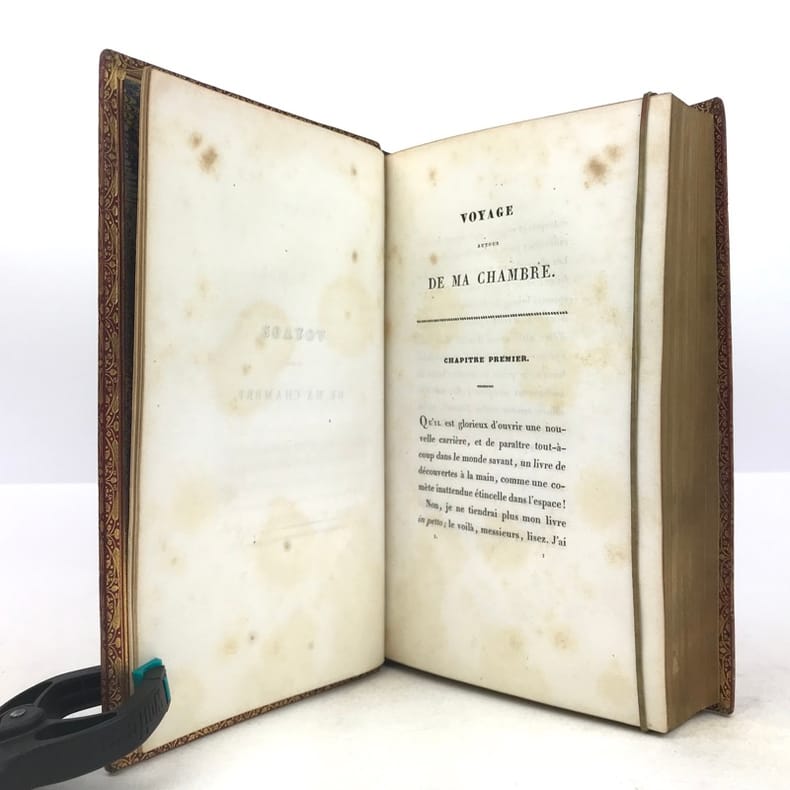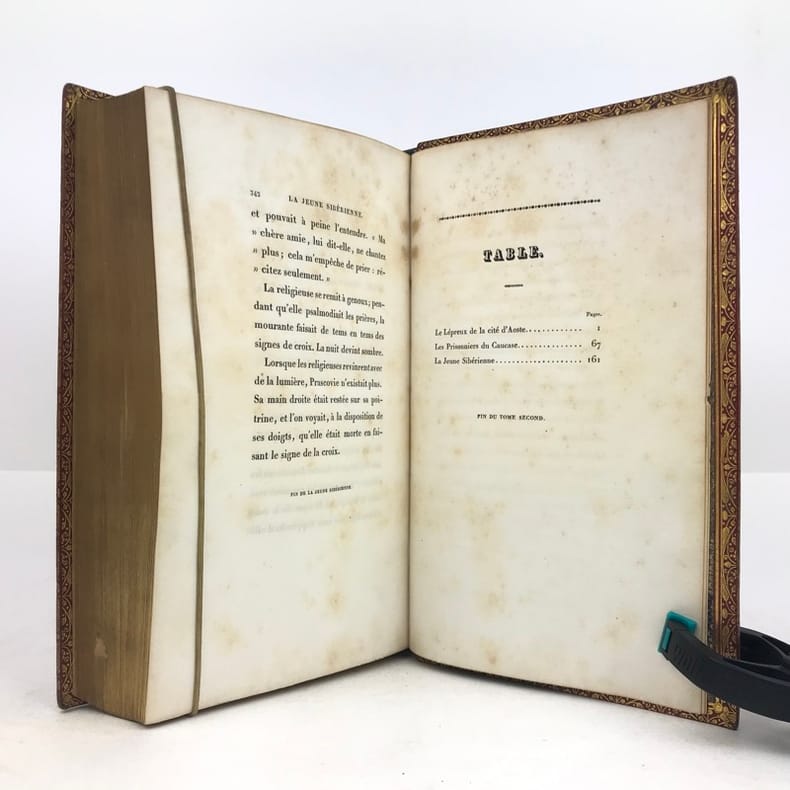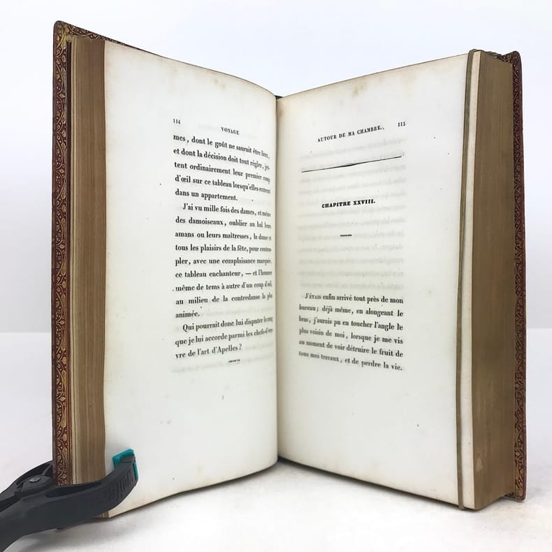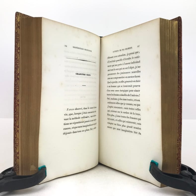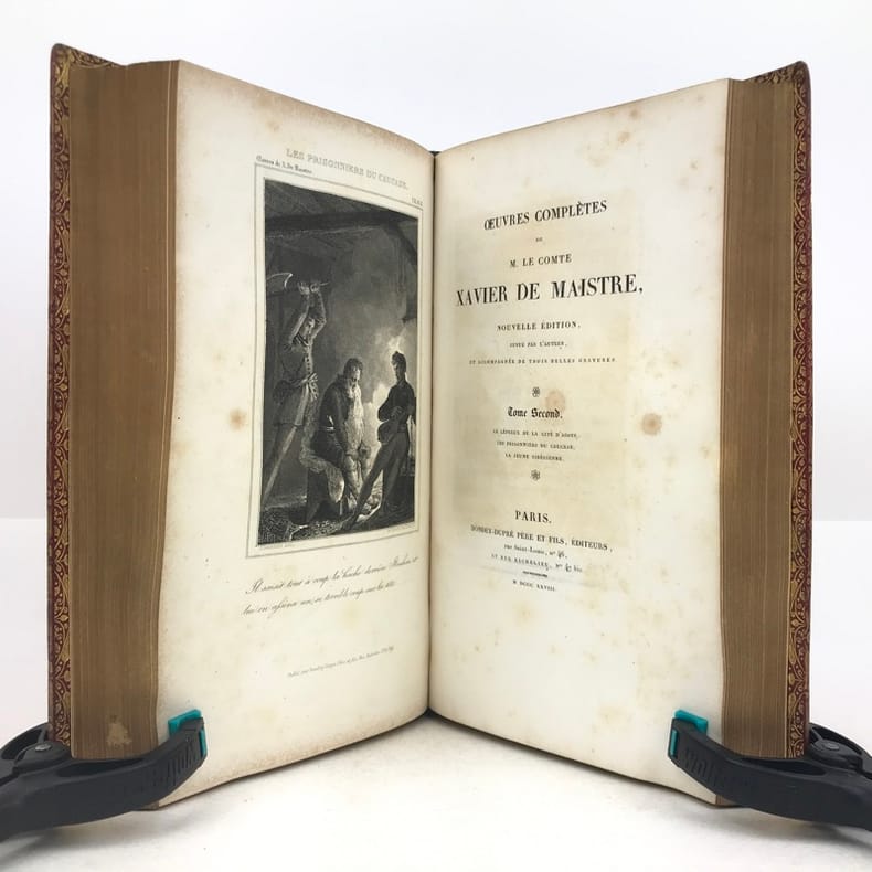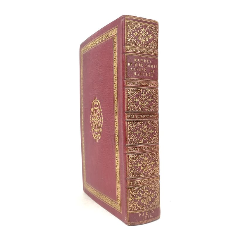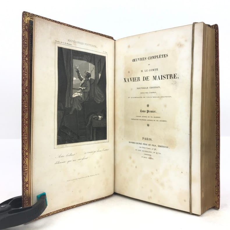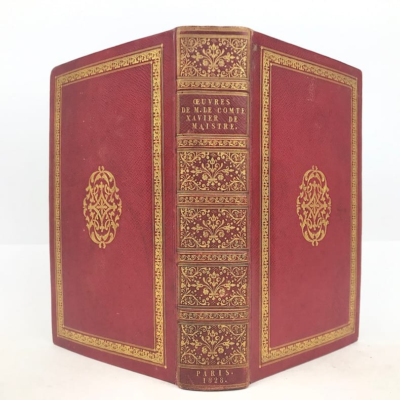 2 tomes en 1 volume in-8 (20,5 x 12,5 cm), chagrin rouge (reliure de l’époque), dos à nerfs joliment orné, médaillon doré au centre des plats avec roulette dorée en encadrement, roulette dorée sur les coupes et sur les chasses, tranches dorées, [6]-399-[7]-342-[2] pages (complet). Légers frottements aux coins et à la coiffe de tête, rousseurs éparses. État correct tout de même. Nouvelle édition, illustrée de 2 frontispices et d’une gravure hors-texte. Xavier de Maistre (1763-1852) est un écrivain savoyard de langue française, un peintre et un général au service du tsar Alexandre Ier de Russie. Il supervise cette nouvelle édition de ses œuvres, comprenant le célèbre Voyage autour de ma chambre, mais aussi Expédition nocturne autour de ma chambre, Le Lépreux de la Cité d'Aoste, Les Prisonniers du Caucase, et enfin La Jeune Sibérienne. Agréable exemplaire.