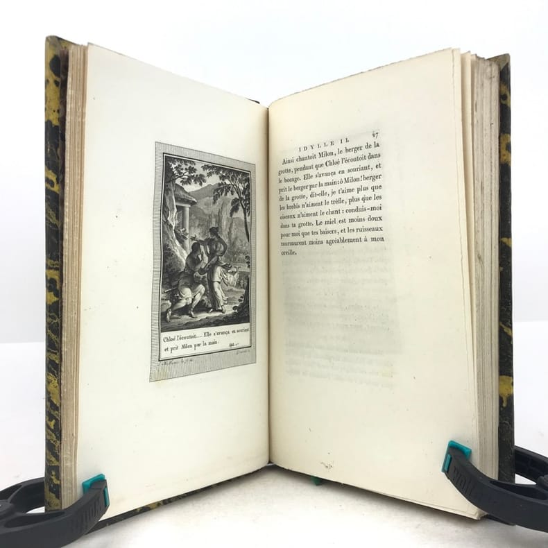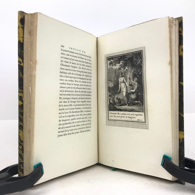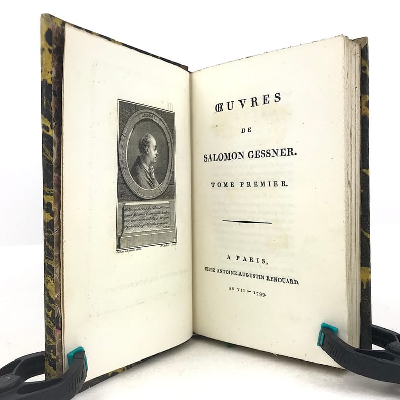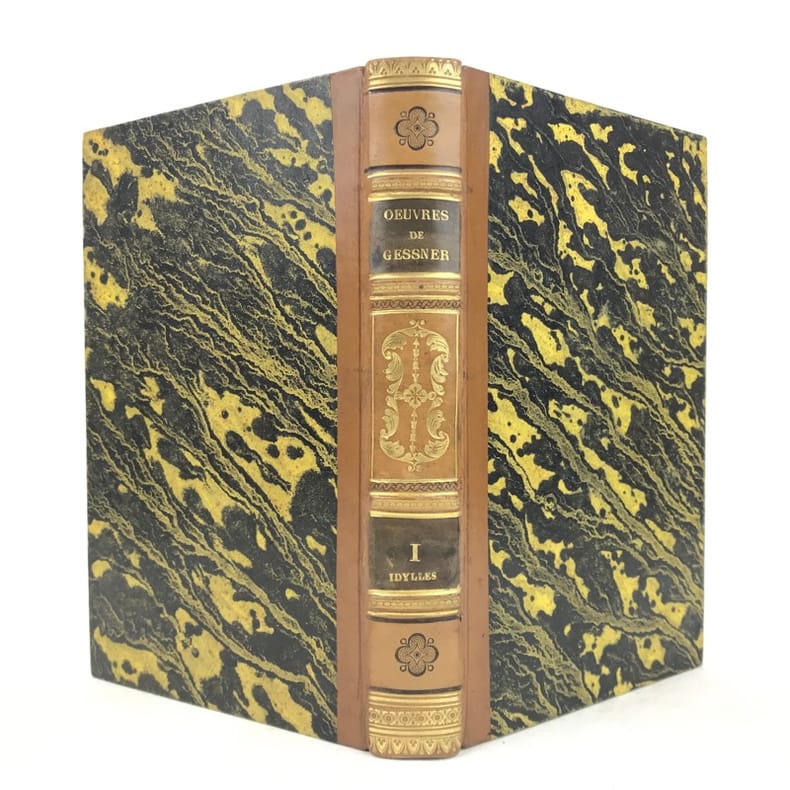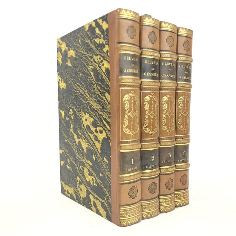 4 volumes in-8 (20 x 13 cm), demi-veau fauve (reliure de l’époque), dos à nerfs orné, pièces de titre et de tomaison en basane brune, xii-319-[1] ; [4]-282 ; [4]-264-[2] ; [4]-295-[1] pages (complet). Quelques feuillets brunis, rousseurs éparses. État très correct tout de même. Nouvelle édition, illustrée de 3 portraits et de 48 gravures hors-texte, réalisées par Moreau. Salomon Gessner (1730-1788) est un poète suisse, considéré au XVIIIe siècle comme le nouveau Théocrite. Nous avons ici le recueil de quatre de ses œuvres : des Idylles, Daphnis, La mort d’Abel, et enfin des pastorales. Plaisant exemplaire.