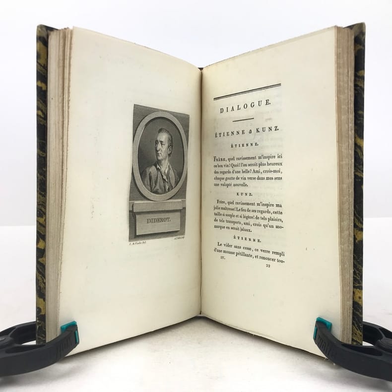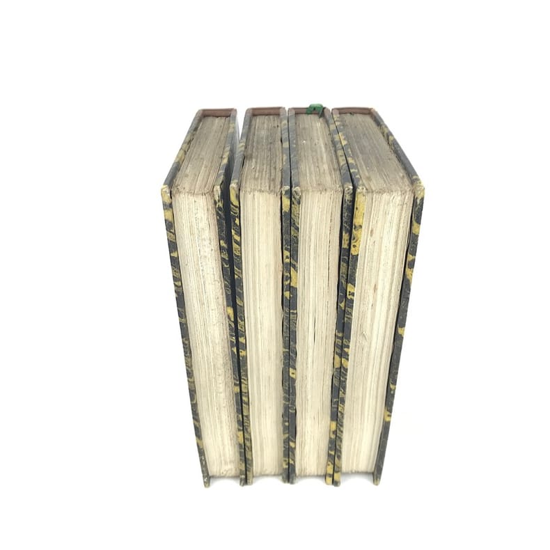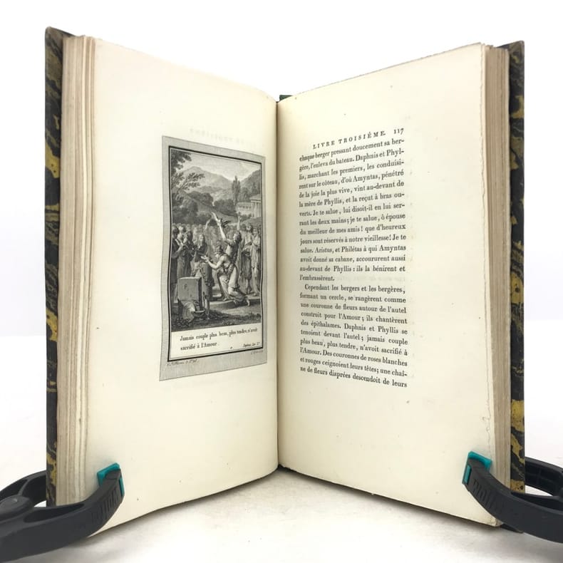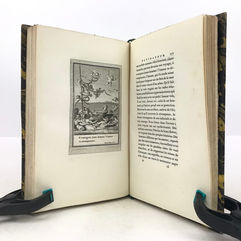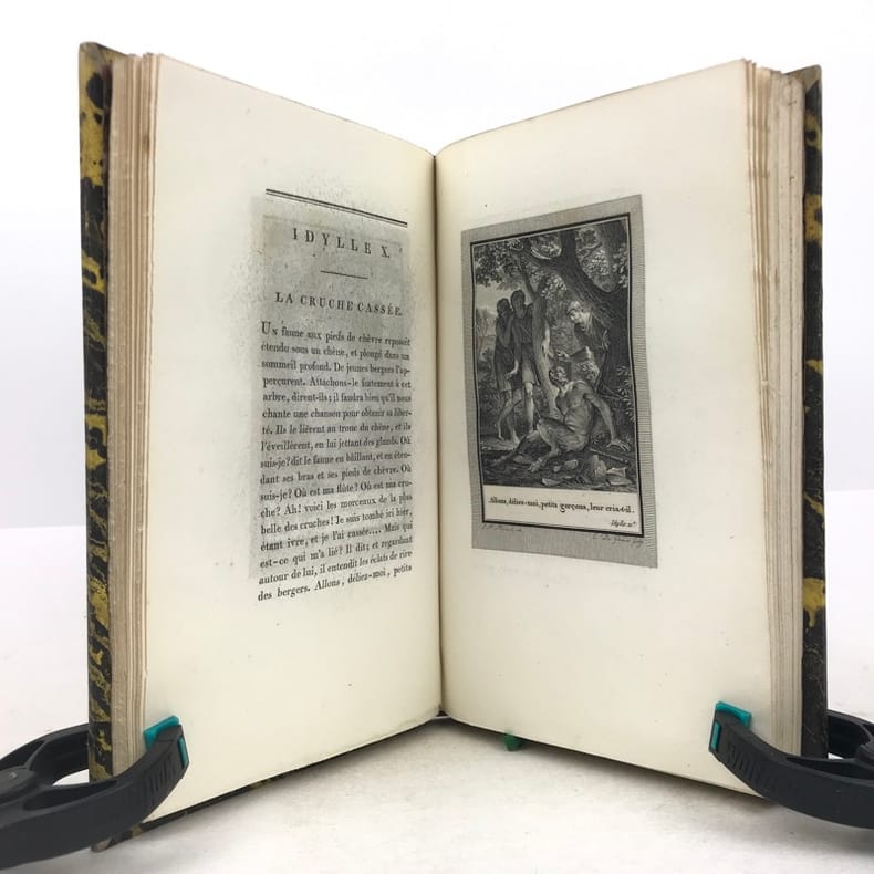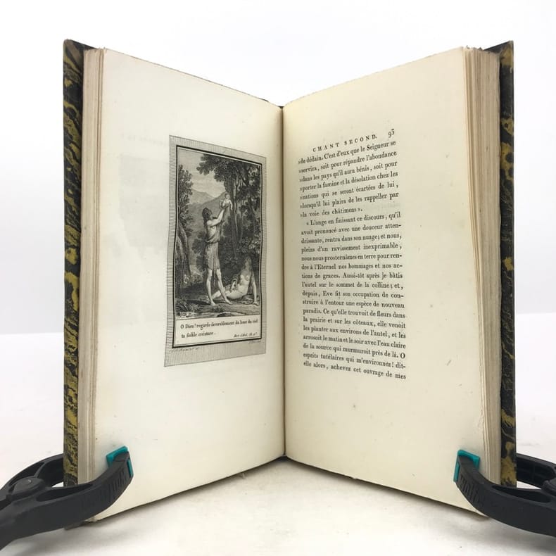 4 volumes in-8 (20 x 13 cm), demi-veau fauve (reliure de l’époque), dos à nerfs orné, pièces de titre et de tomaison en basane brune, xii-319-[1] ; [4]-282 ; [4]-264-[2] ; [4]-295-[1] pages (complet). Quelques feuillets brunis, rousseurs éparses. État très correct tout de même. Nouvelle édition, illustrée de 3 portraits et de 48 gravures hors-texte, réalisées par Moreau. Salomon Gessner (1730-1788) est un poète suisse, considéré au XVIIIe siècle comme le nouveau Théocrite. Nous avons ici le recueil de quatre de ses œuvres : des Idylles, Daphnis, La mort d’Abel, et enfin des pastorales. Plaisant exemplaire.