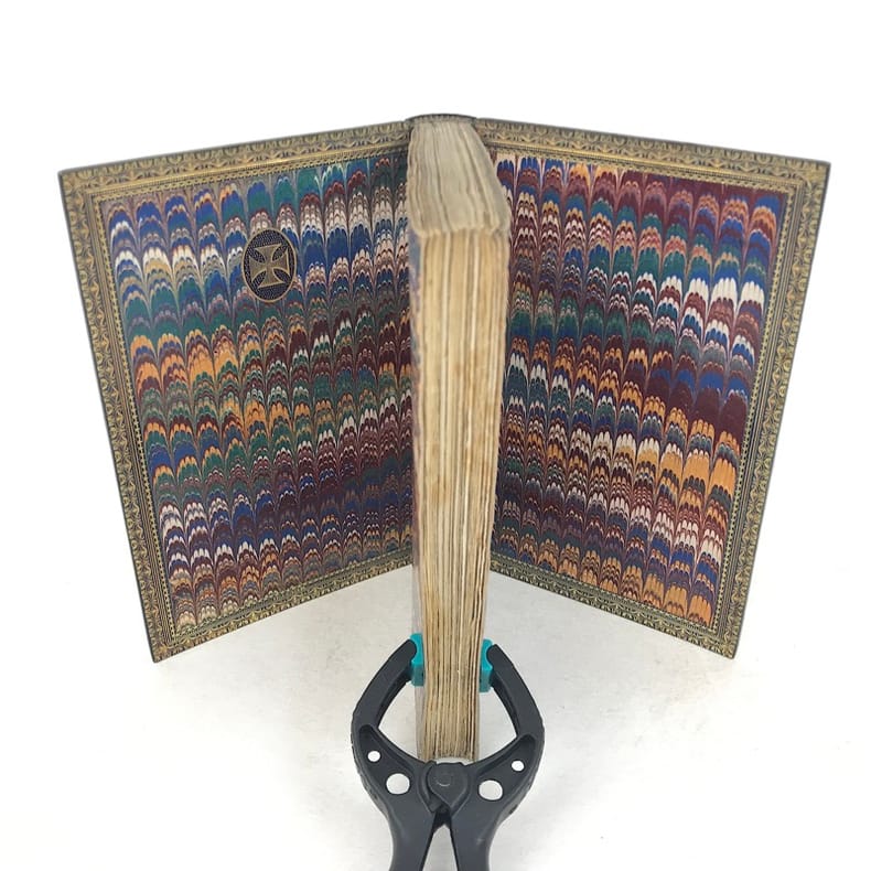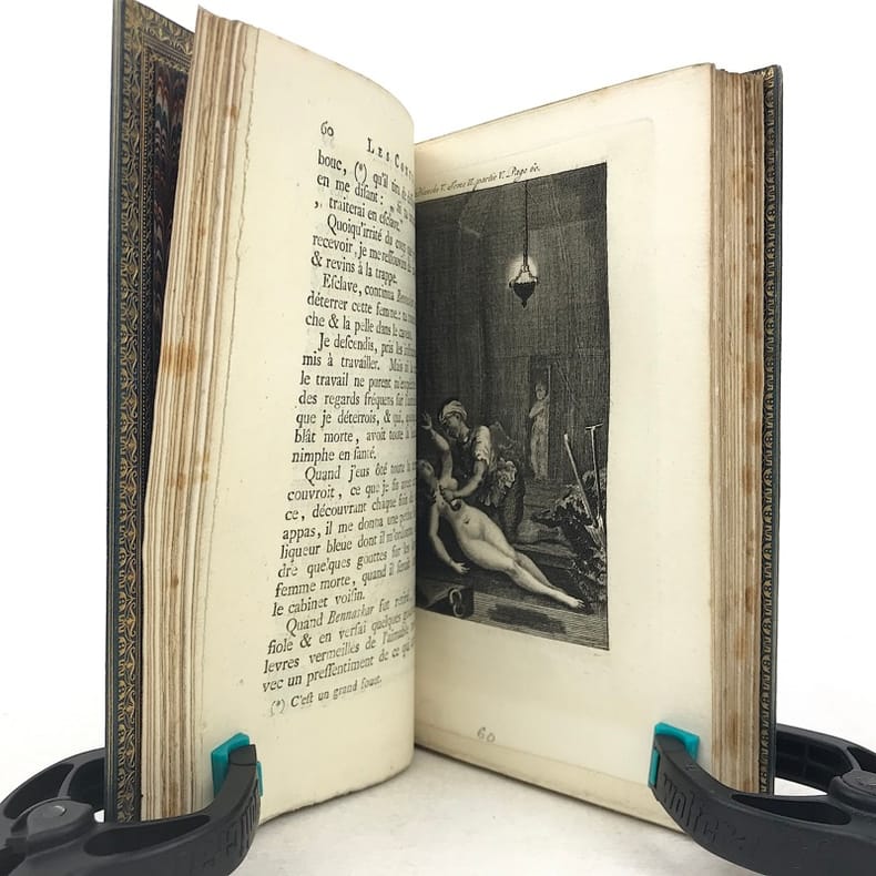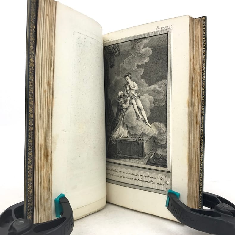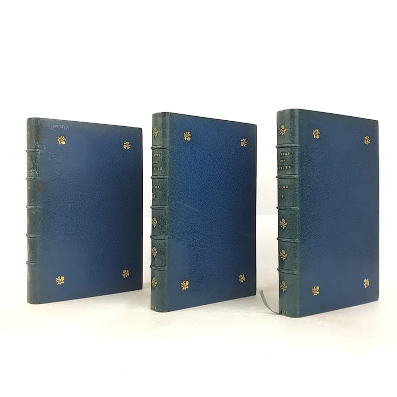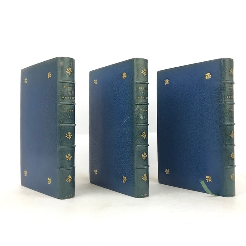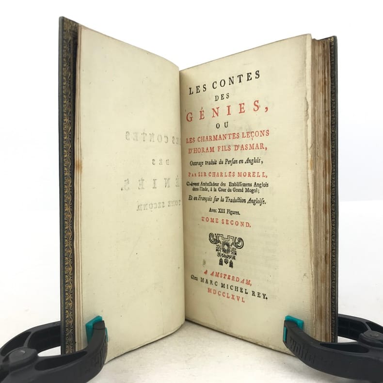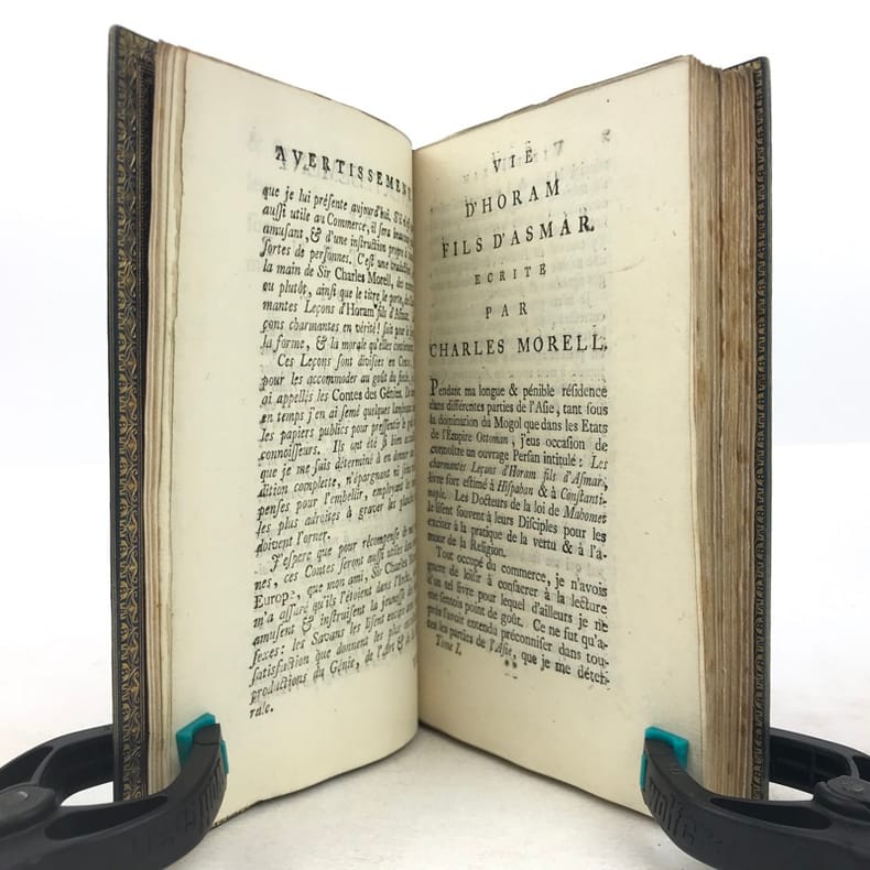 3 volumes in-12 (16,5 x 10,5 cm), maroquin bleu (reliure postérieure, signée Belz-Niedrée), dos à nerfs orné, fleurons dorés en écoinçons sur les plats, double filet doré sur les coupes, dentelle dorée sur les chasses, titre en rouge et noir, ex-libris non identifié sur le contreplat. xlviii-283-[1] ; [4]-335-[1] ; [4]-331-[5] pages (complet). Taches sur le cuir, en particulier en tête du tome I, dos insolés, rares rousseurs. État correct. Première édition de la traduction française, illustrée d’un frontispice et de 12 gravures hors-texte. Exemplaire ENRICHI de 13 gravures supplémentaires. Charles Morell, de son vrai nom James Ridley (1736–1765) est un auteur anglais, ayant également servi comme aumônier dans l'armée britannique. Ce recueil de contes est très fortement inspiré des Mille et une nuits, dans un style orientaliste alors très à la mode au XVIIIe siècle. Bien qu’il en soit l’unique rédacteur, il prétend les avoir recueillis auprès d’un certain Horam. La traduction française fut ici réalisée par Jean-Baptiste Robinet (1735-1820), également philosophe. Plaisant exemplaire. Vendu 02/10/2025