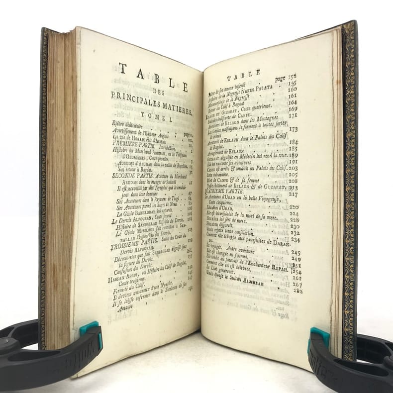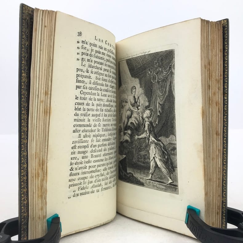 Edition originale française illustrée de 13 jolies figures non signées. Pages de titre en rouge et noir. Sir Charles Morell est le pseudonyme de James Ridley. La première édition anglaise date de 1764, elle a ici été traduite par Robinet. Reliures en plein veau brun marbré et glacé d'époque. Dos à nerfs orné. Pièces de titre et de tomaison en maroquin rouge. Coiffe de tête du tome I avec manque. Restaurations en tête des tome II et III, idem en queue du tome I. Mors du tome II ouvert en queue. Un manque comblé le long du mors supérieur du tome II. Mors supérieur du tome III ouvert en queue. Exemplaire frais dans l'ensemble avec quelques feuillets jaunis. Les planches du tome III ont été reliées dans le tome II et vice-versa. Ex-libris ; Bibliothèque de M. de Beaumont. Attribués à l'Imam Horam (dont la vie occupe les pages préliminaires) et soi-disant traduit par l'ambassadeur à Bombay Charles Morell, ces contes inspirés pour la facture des Mille et une nuits sont l'oeuvre de l'imagination de James Ridley dont la notoriété et le succès populaire furent importants en Angleterre. Parus au début du XVIIIe sous la traduction de Galland, les Mille et une nuits engendrèrent en Europe une importante littérature teintée de fantastique, d'onirisme et d'érotisme. - Photographies et détails sur www.Edition-Originale.com -
