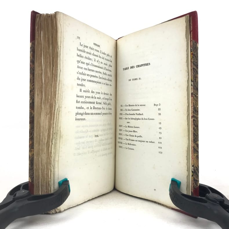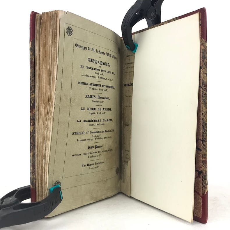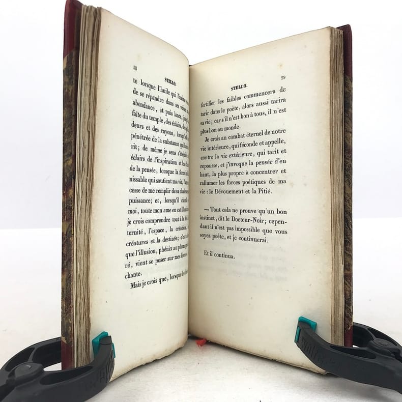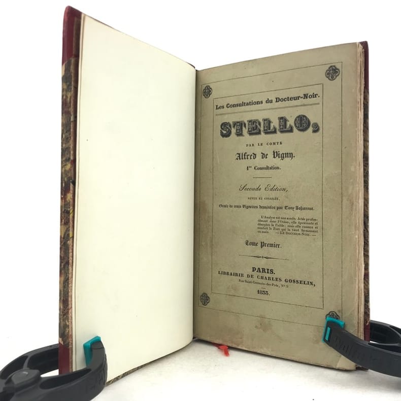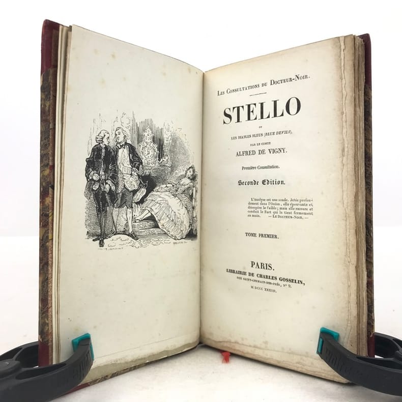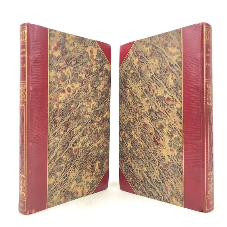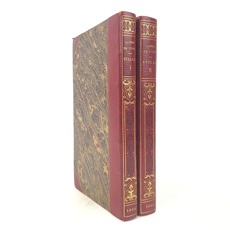 2 volumes in-12 (18 x 11 cm), demi-maroquin rouge à grain long et à coins (reliure signée Yseux), couvertures et dos conservés, dos lisse joliment orné en long, tranche de tête ornée, 244-[2] ; [4]-372-[2] pages (complet). Rousseurs. État très correct. Seconde édition, la première au format in-12, parue un an après l’originale. Elle est également illustrée de 3 vignettes sur Chine d'après Tony Johannot (1803-1852). Alfred de Vigny (1797-1863) est un écrivain et romancier français, connu pour son engagement et sa participation au mouvement romantique. Il est l’auteur de nombreux romans, comme ici Stello, sorte de recueil de « consultations » mettant en fiction le fameux « mal du siècle » dont souffre le personnage éponyme. Agréable exemplaire. Vendu 02/10/2025
