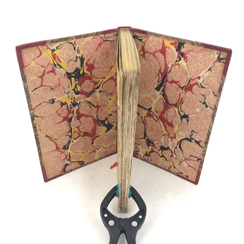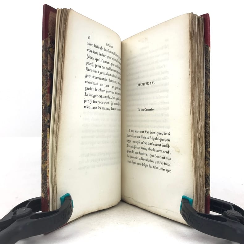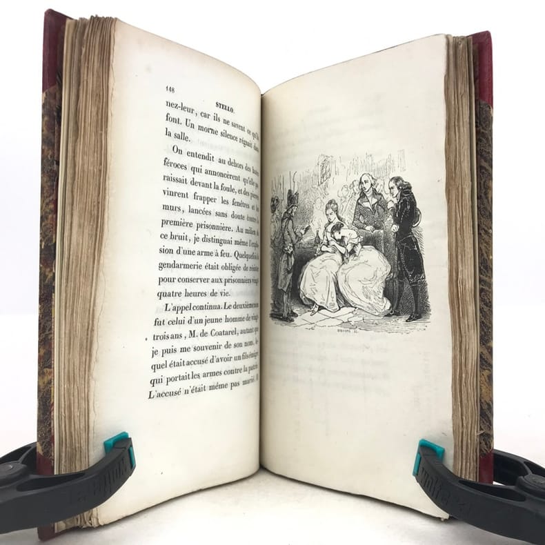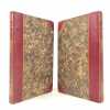 In-8 (228 x 147 mm), demi-veau framboise, dos à quatre nerfs orné, non rogné (reliure dépoque). Edition originale, ornée de trois illustrations par Tony Johannot gravées sur bois, sur Chine. (dos frotté, déboîté, gardes fendues, dorure des nerfs en partie disparue, coins un peu usés, quelques petites mouillures en marge, rousseurs). // Octavo (228 x 147 mm), raspberry half-calf, spine tooled raised on four bands, uncut (contemporary binding). First edition, with three illustrations by Tony Johannot wood-engraved on China paper. (rubbings on spine, disbound, end-papers cracked, gilt on raised-bands partly rubbed, corners a bit used, some little water-stains on margins, brownings).