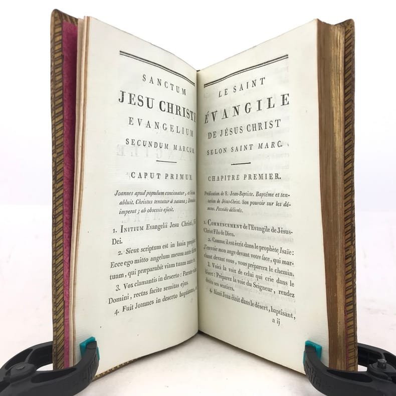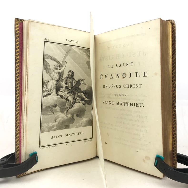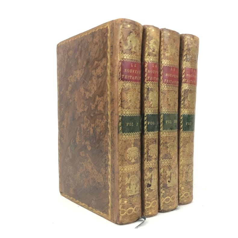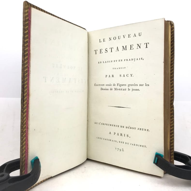 4 volumes in-8 (19,7 x 12,5 cm), veau raciné (reliure de l’époque), dos lisses joliment ornés de filets, roulettes et fleurons spéciaux dorés, pièces de titre en maroquin rouge et de tomaison en maroquin vert, filet et roulettes dorés en encadrement sur les plats, roulette dorée intérieure, tranches dorées, texte bilingue latin-français, [4]-327-1bl.-29pl. ; [4]-207-1bl.-12pl. ; [4]-345-1bl.-25pl. ; [4]-263-1bl.-18pl pages. Légers frottements aux reliures, aux coiffes, aux charnières, sur les chants et les coins, rares pâles rousseurs éparses, 2 planches plus courtes dans la marge dans le tome 3 et une tranche intérieure fendue dans le tome 4. État très correct. Belle édition illustrée, sortie des presses de Pierre-François Didot, elle renferme 84 figures gravées d’après les dessins de Moreau le jeune, gravées par Baquoy, Delvaux, Dupréel, de Launay, Petit, Simonet, de Longueil, Trière, Tilliard, etc. Louis-Isaac Lemaistre (ou Lemaître), sieur de Sacy (anagramme d'Isaac (1613-1684), prêtre catholique proche de Port-Royal, un théologien, bibliste et humaniste français. Il est connu par sa traduction de la Bible. Un 5e volume fut publié, seul, en 1798 avec 28 figures gravées. Plaisant exemplaire.