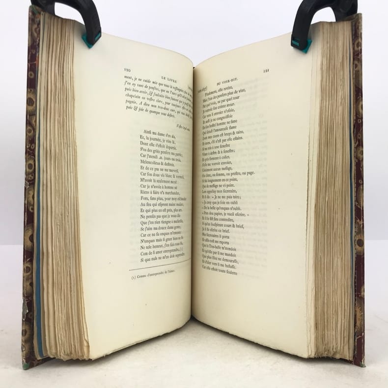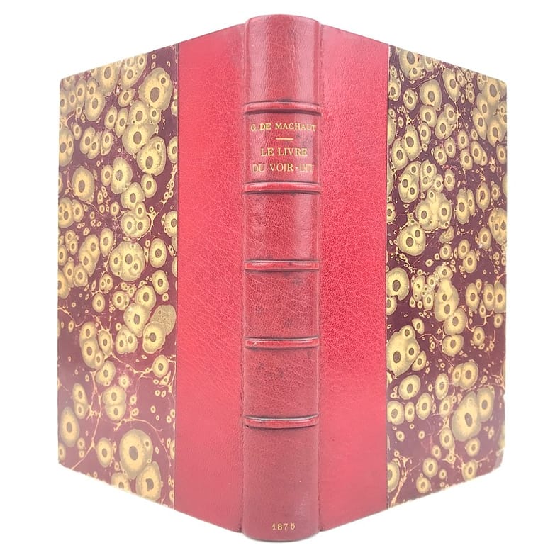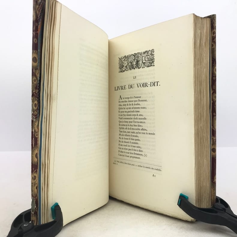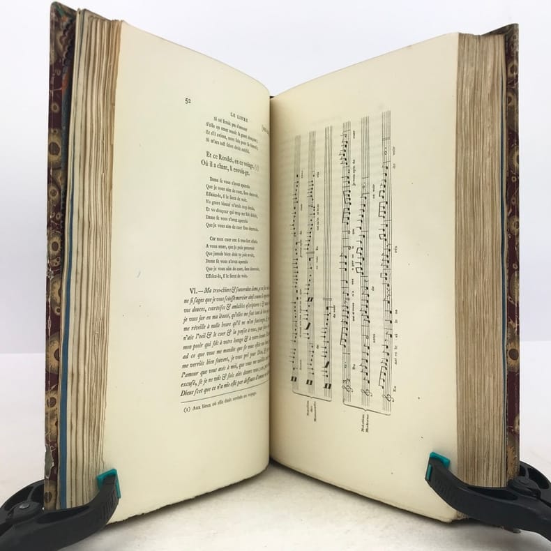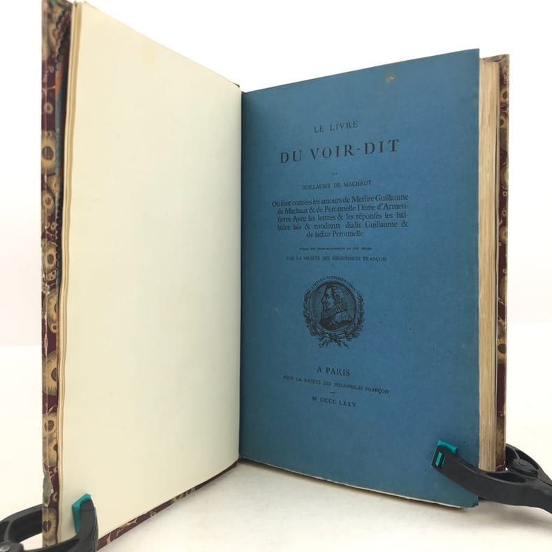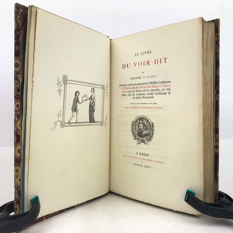1 volume in-4 (24 cm x 15 cm), demi-maroquin rouge (reliure de l’époque signée Bretault, élève de Champs), dos à nerfs, tête dorée, couverture conservée, envoi sur le faux-titre. [4]-iii-1 bl.-xxxv-1 bl.-408 pages (complet). 1 coin abimé, feuillets légèrement froissés. Bon état. ÉDITION ORIGINALE éditée par Paulin Paris, illustrée d’un frontispice et de 2 planches hors-texte, dont une de musique,et de 2 vignettes in-texte.Exemplaire sur vergé, non justifié ; celui-ci portant un envoi de Paulin Paris sur la page de faux-titre adressé à Léon Techener (1832-1888), libraire d'ancien et éditeur à Paris Bibliographe et collectionneur.Guillaume de Machaut, (vers 1300-1377), est un compositeur et écrivain français du xive siècle. Il a mené une vie dans le monde laïc, au service de mécènes et en liens étroits avec la Couronne de France. Clerc lettré et maître des arts, il a marqué pendant un siècle la production artistique européenne. Dans son œuvre il allie les lumières d'un clerc et la vaillance chevaleresque. Comme toutes les autres productions pour l'église, ses œuvres liturgiques sont destinées à faire entendre la parole divine au cours d'un office et chantent la gloire de Dieu. Sa production religieuse part ainsi des motifs de plain-chant (ou chant grégorien), dont elle s'éloigne en les ornant et en les développant. Il perpétua alors, en les bouleversant, les traditions médiévales des polyphonistes de l'École de Notre-Dame de Paris et celles de l’Ars antiqua du xiiie siècle. C'est ainsi qu'il maîtrise les formes lyriques fixes comme le lai, la ballade, le rondeau, le chant royal et donne une impulsion décisive au virelai, forme née à la fin du xiiie siècle. De manière tout aussi essentielle, il renouvelle l'art des grands polyphonistes d'église, dont il a contribué à faire évoluer les techniques ou les formes musicales, en les complexifiant et en y acclimatant de nombreuses innovations.Agréable exemplaire.