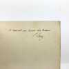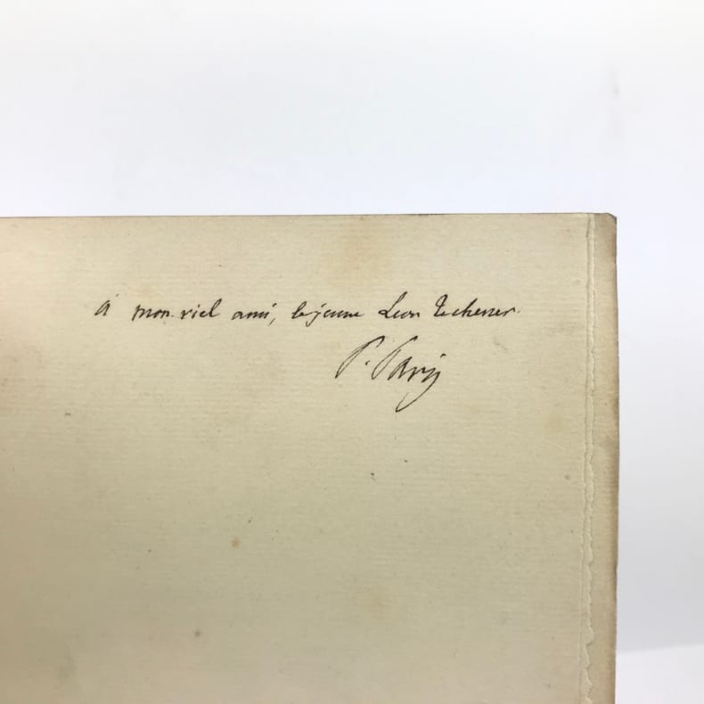 2 pièces autographes signées à savoir: 1 L.A.S. de 3 pp., datée du 12 mai 1908: «Mon cher ami, il pleut, mais ton article sur le Briseur de Fers vient de nous apporter le soleil. Oh! mon cher ami, comme tu es gentil! comme je devine, en relisant ton article, le charmant parti-pris de ne voir que le bon côté de mon livre! C’est une page de camarade, évidemment, et non de critique, quoiqu’elle soit superbe et d’une habileté délicieuse. Car c’est de «l’habileté du cœur». Eh bien, tu as raison, après tout! Tu ne signales au public que les bonnes choses, puisqu’elles lui sont utiles. Leur démontrer que je n’ai pas de talent eût été peut-être un jeu d’artiste mais une grosse erreur de moraliste et de philosophe. J’ai un petit nombre, lentement, très lentement grandissant d’amis et de lecteurs. Ce que je leur dis depuis 15 ans ne peut que leur faire du bien, les raffermir ou les consoler. Je ne cherche pas à donner le goût du «militaire» mais de «l’énergique». Si j’y parviens, qu’importent mes fautes! Du reste, je connais, aussi bien et même mieux que quiconque, mes défauts. Tu peux me le mettre sous les yeux et en ajouter de nouveaux, quand tu me rencontreras. Je suis à ce point dénué de «vanité littéraire» que je t’écouterai […] Mon livre est noble et pur d’intentions, je l’ai écrit laborieusement. Il vaut bien ce qu’il coûte. Le reste n’est que de la fumée de cigare. Maintenant, je veux aller te serrer la main à l’Echo [ … ] En attendant, mon vieux Rar, je t’embrasse»; [ On joint: ] 1 réponse autographe signée au questionnaire du «Salon des Littérateurs», billet de 2 feuillets pré-imprimé: Maître idéal: «Prothée». Esthétique: «Un beau livre sur mes genoux». Prix rêvé: «Les ors et les argents sont fous! ». Devise artistique: «Simplement». Description de l’œuvre en vers de huit: «Parce que le bec de mes plumes, Dans l’orme agité du journal, Tirelire mes amertumes, Et lance un pi-huit matinal, Est-il dit qu’une œuvre m’est née? Alors j’ai volé ma journée… Parce que d’un bout de pastel, En un coin de mauve banlieue, J’esquisse le flâneur untel, Ai-je fait plus d’un quart de lieue, Vers la connaissance du bien? Holà, Dentu, je n’en sais rien! Œuvre, mot risible, oiseau rare. – Vais là-bas fumer un cigare»