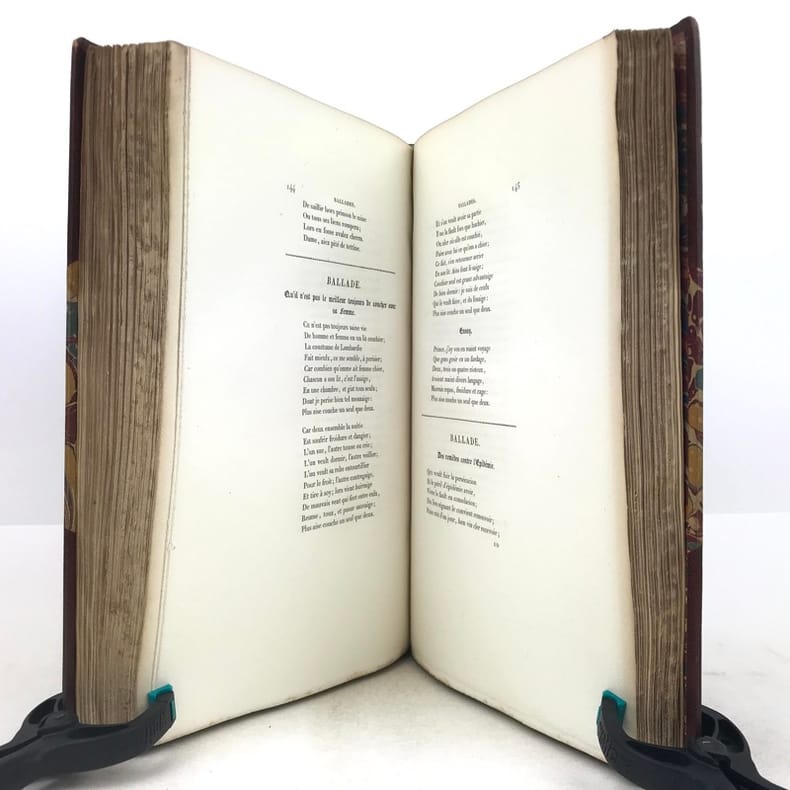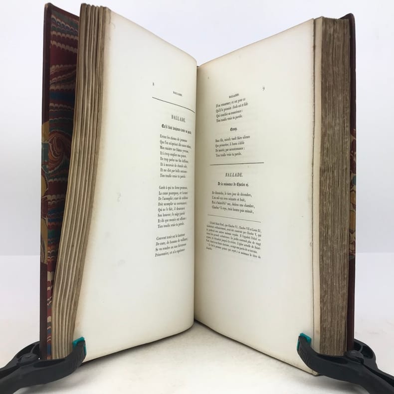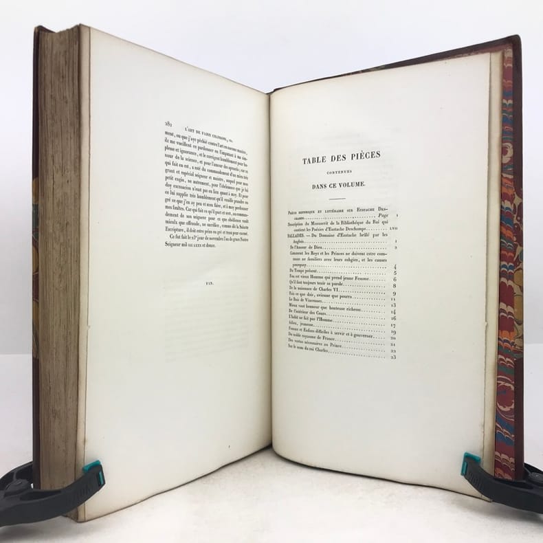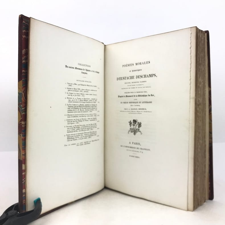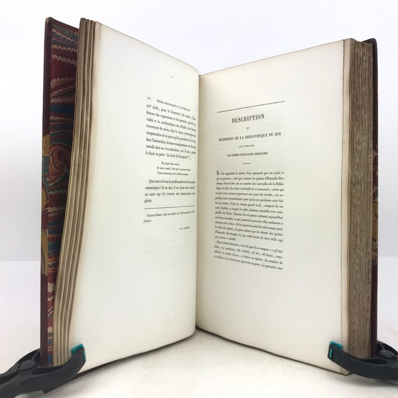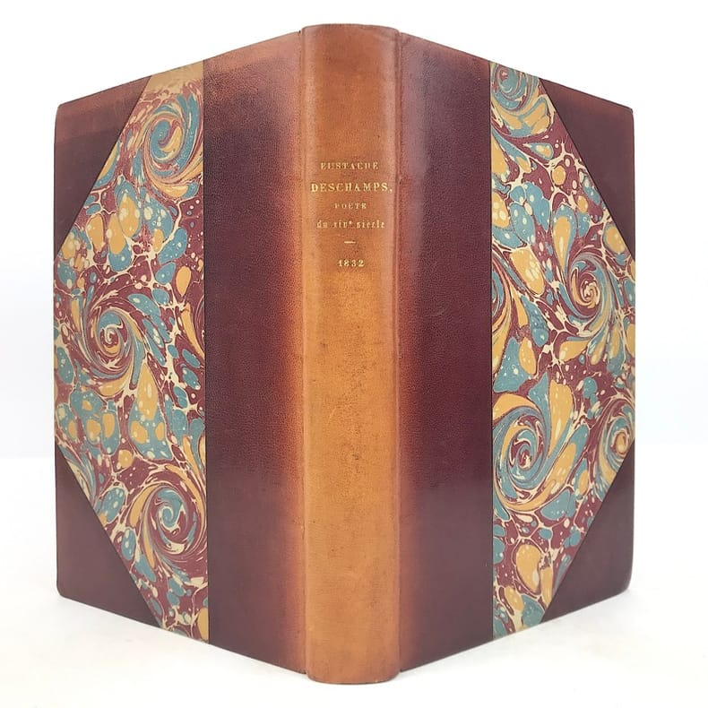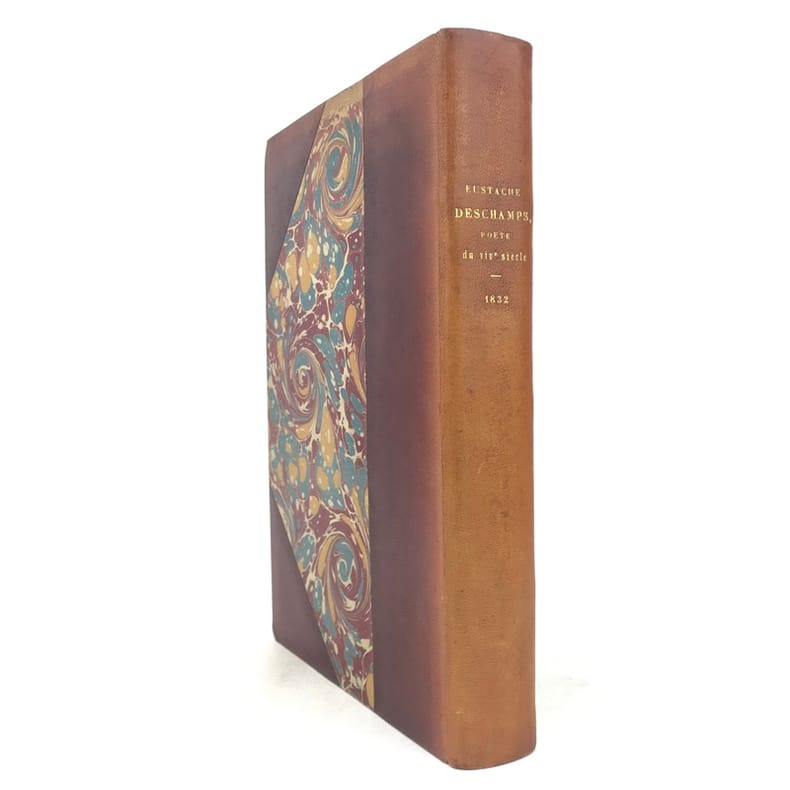 1 volume in-4 (27 cm x 18 cm), demi-chagrin bordeaux à coins (reliure de l’époque signée Durvand), dos lisse, tête dorée. [4]-lxviii-xxiv-288 pages (complet). Dos insolé, rousseurs. Bon état. ÉDITION ORIGINALE illustrée d’une planche hors-texte. Eustache Deschamps, (1340-1404), est un poète français qui a contribué à fixer les formes typiquement médiévales par sa réflexion théorique dans L’Art de dictier, premier ouvrage sur l’art poétique écrit en langue d’oïl en 1392. Deschamps consacre beaucoup de ses textes au mariage, à la mode, à la santé et à ses voyages. Il rédige des ballades amoureuses, des ouvrages didactiques, et une série de poèmes appellatifs destinés à des personnages historiques. Il dédie aussi des poèmes à des seigneurs et singe sa laideur dans des autoportraits pathétiques et grotesques dits du « pauvre Eustache ». Les thèmes récurrents que nous pouvons constater sont les femmes, la politique et l’argent. Mais il a également composé un grand nombre de poésies satiriques et morales, où il attaque l'Église, l'État, ou les financiers. Agréable exemplaire.