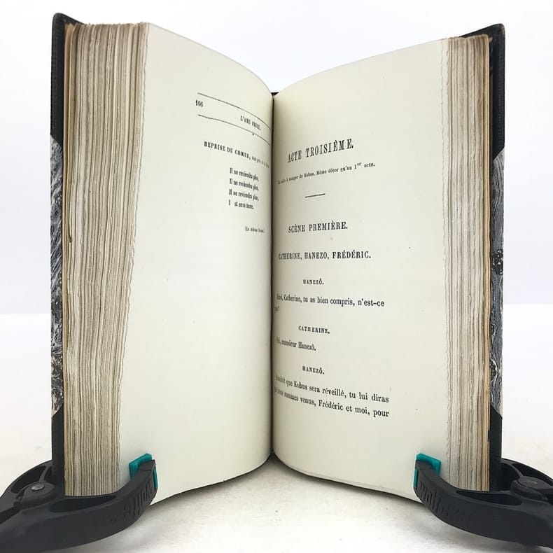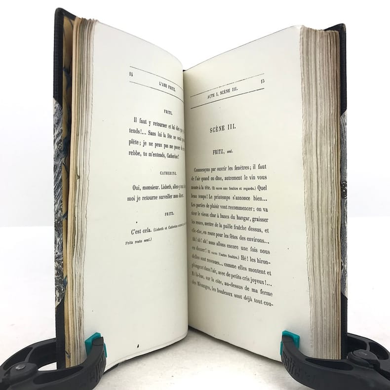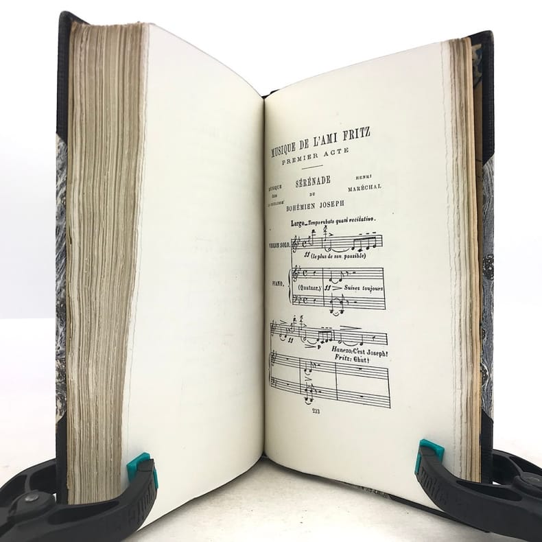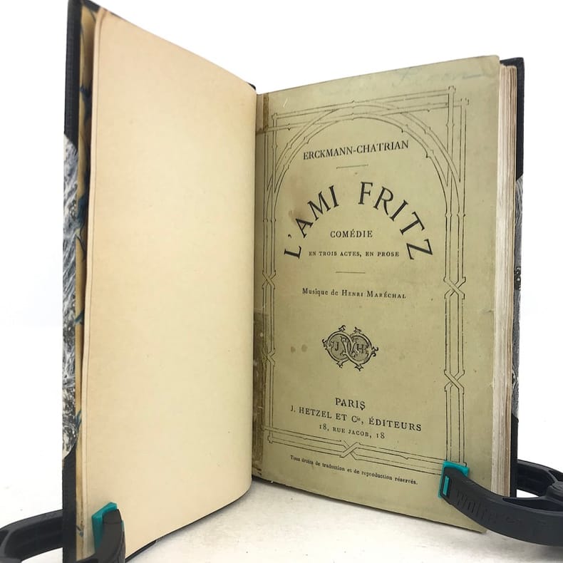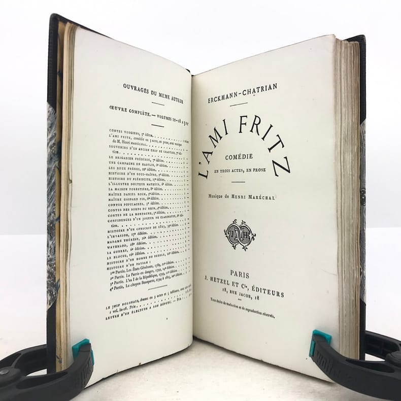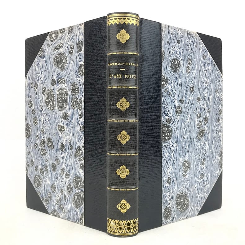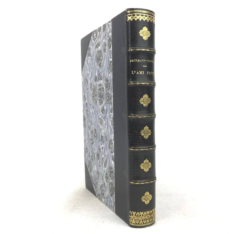 1 volume in-12 (18 cm x 11 cm), demi-maroquin à coins à longs grains noirs, dos à nerfs orné de fleurons dorés, tête dorée, couverture conservée. [6]-231-1 bl.-24-[4] pages (complet). Frottements à la reliure. Bon état. Nouvelle édition ; la première fut publiée en 1876. Erckmann-Chatrian est le pseudonyme commun utilisé de 1847 à 1887 par deux écrivains français : Émile Erckmann (1822-1899) et Alexandre Chatrian (1826-1890). Ils ont également écrit sous leurs patronymes respectifs. Nés tous deux en Meurthe et amis, ils ont écrit un grand nombre de romans nationalistes d'inspiration régionale exaltant le sentiment patriotique. Dans leur œuvre, le réalisme rustique, influencé par les conteurs de la Forêt-Noire, se transfigure en une sorte d'épopée populaire. Agréable exemplaire.