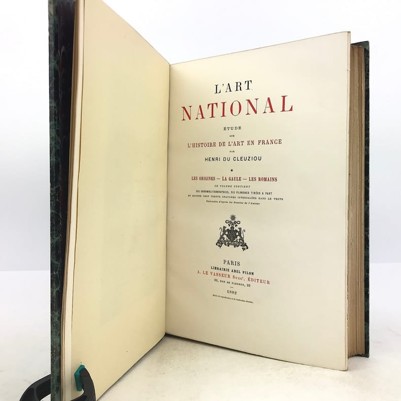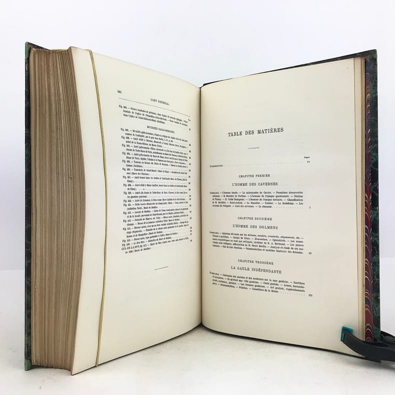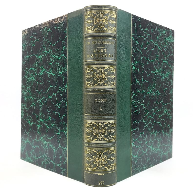 2 volumes in-4, en partie non coupés (29 x 20 cm), demi-maroquin vert (reliure de l’époque, signée Becquet), dos à nerfs ornés, têtes dorées, couvertures illustrées conservées. [4]-xxxix-1bl.-566-[2] ; [4]-704 pages. Manque la chromolithographie n°4 du premier volume. Dos légèrement insolés, petits frottements aux nerfs, aux charnières et sur les coins. Bon état. Bel ouvrage de référence illustré de 19 chromolithographies (sur 20) hors texte, 20 planches hors texte en noir et blanc et de très nombreux dessins gravés in texte. Henri Raison du Cleuziou (1833-1896), archéologue, historien et dessinateur français. Il a publié de nombreux ouvrages sur la Bretagne, l'archéologie et l'histoire de France. Bon exemplaire.
