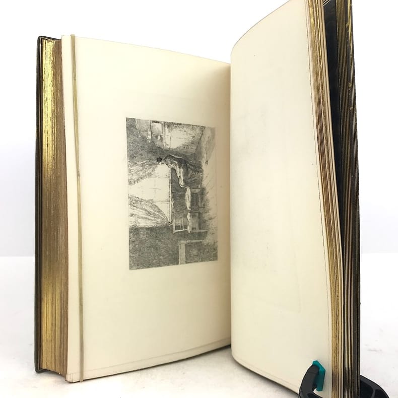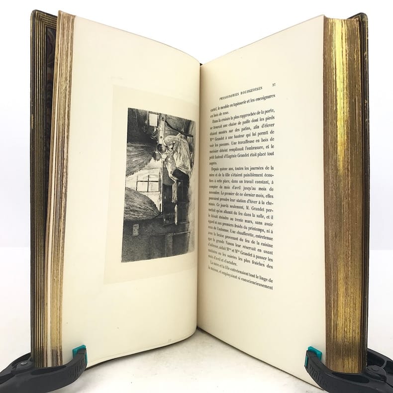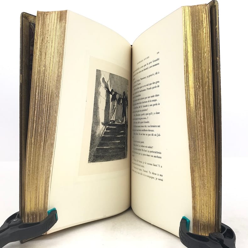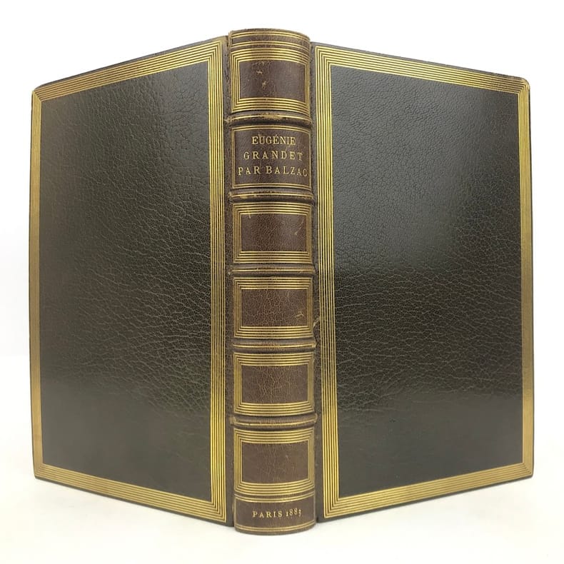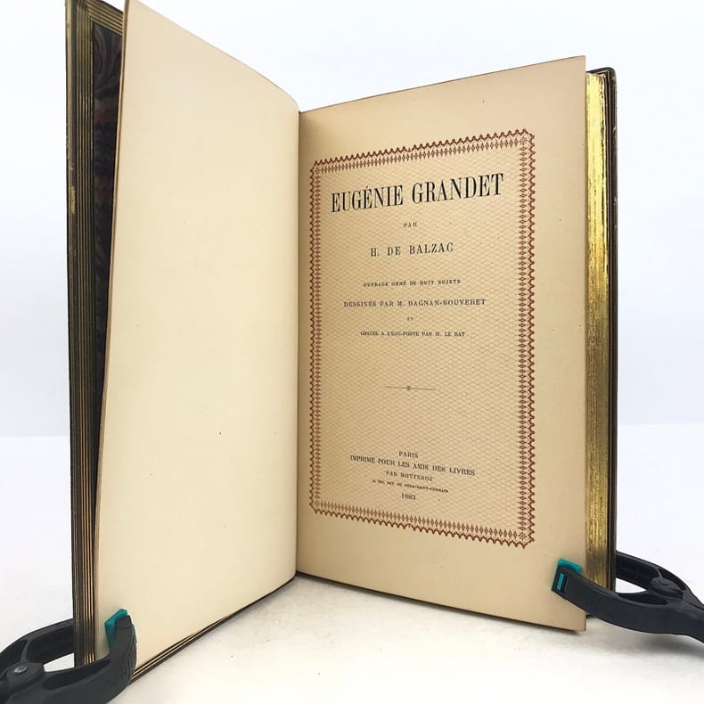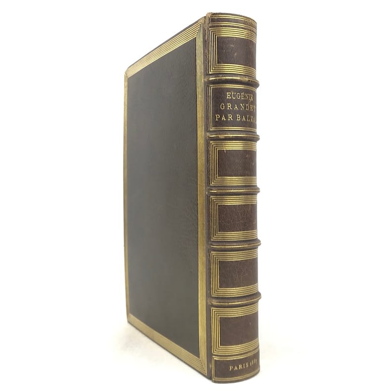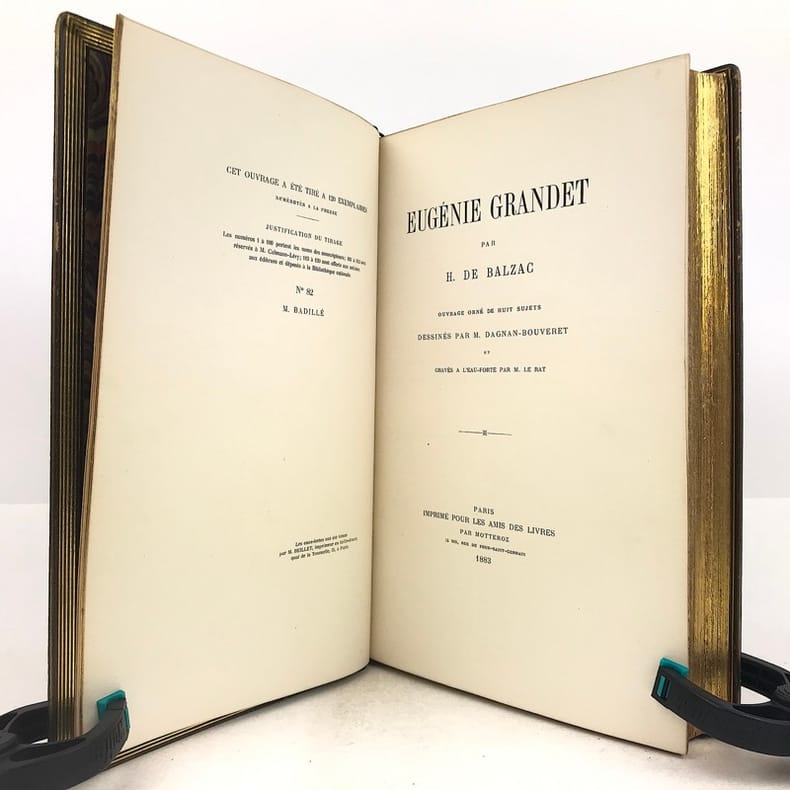 1 volume in-4 (24,5 cm x 15 cm), maroquin brun (reliure de l’époque signée Chambolle-Duru), dos à nerfs orné de filets dorés, sept filets dorés en encadrement des plats, tranches dorées, filets dorés intérieurs, couvertures conservées. [4]-345-[11] pages (complet). Dos légèrement insolé, claires rousseurs. Bon état. Nouvelle édition illustrée de 8 planches hors-texte d'après Dagnan-Bouveret, gravées à l’eau-forte par M. Le Rat. Tirage à 120 exemplaires, celui-ci 1/100 portant les noms des souscripteurs, ici imprimé pour M. Badillé, (n°82). Exemplaire ENRICHI d'un état supplémentaire des 8 eaux-fortes (en premier état). Eugénie Grandet, qui passe pour l’un des modèles du réalisme balzacien, est une « histoire vulgaire, le récit pur et simple de ce qui se voit tous les jours en province », écrit Balzac dans sa Préface de 1833. C’est également le roman de l’argent et de l’avarice, incarnée par l’un des personnages les plus célèbres de La Comédie humaine : le père Grandet. Eugénie Grandet est aussi le roman de l’attente et de l’ennui, l’histoire déchirante d’une Pénélope sublime, éprise de son cousin de Paris, frivole dandy à qui elle sacrifiera tout… Bel exemplaire.