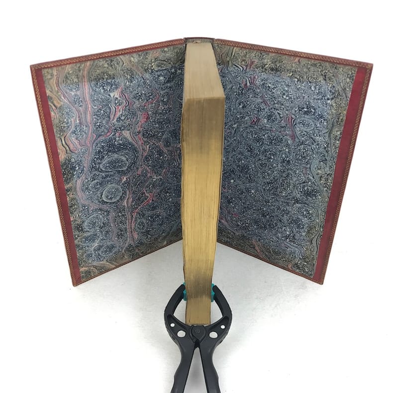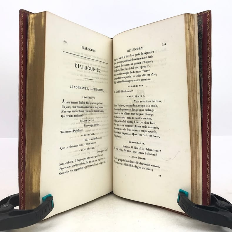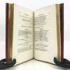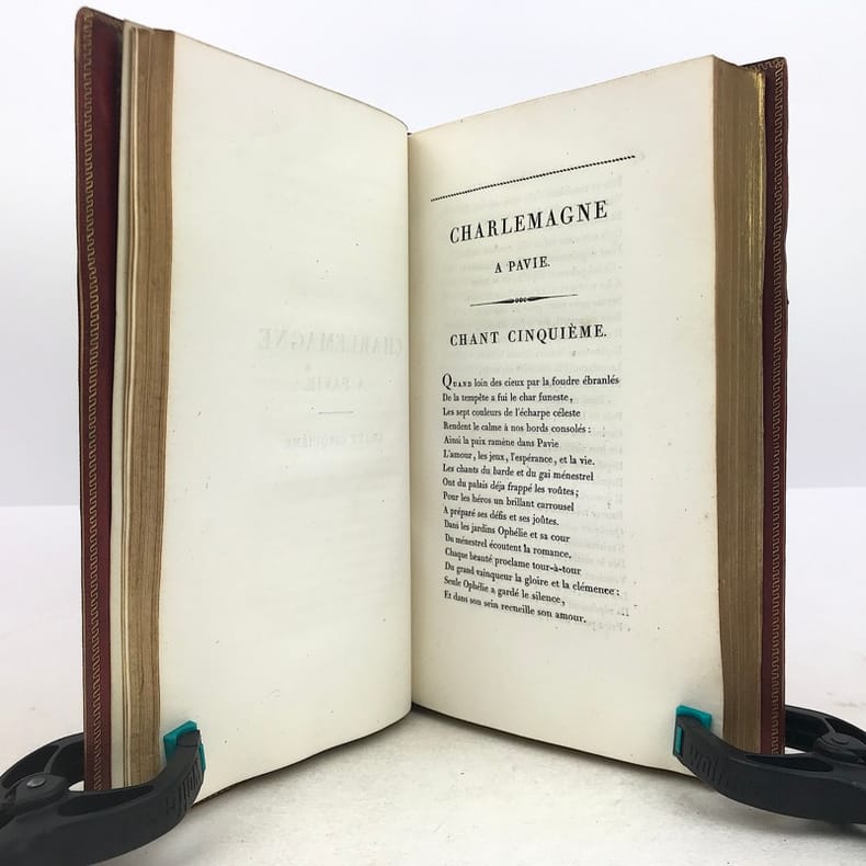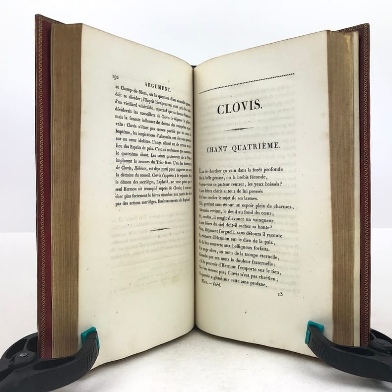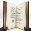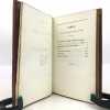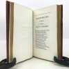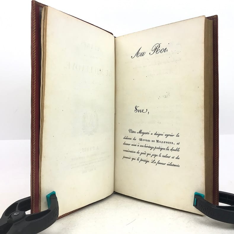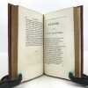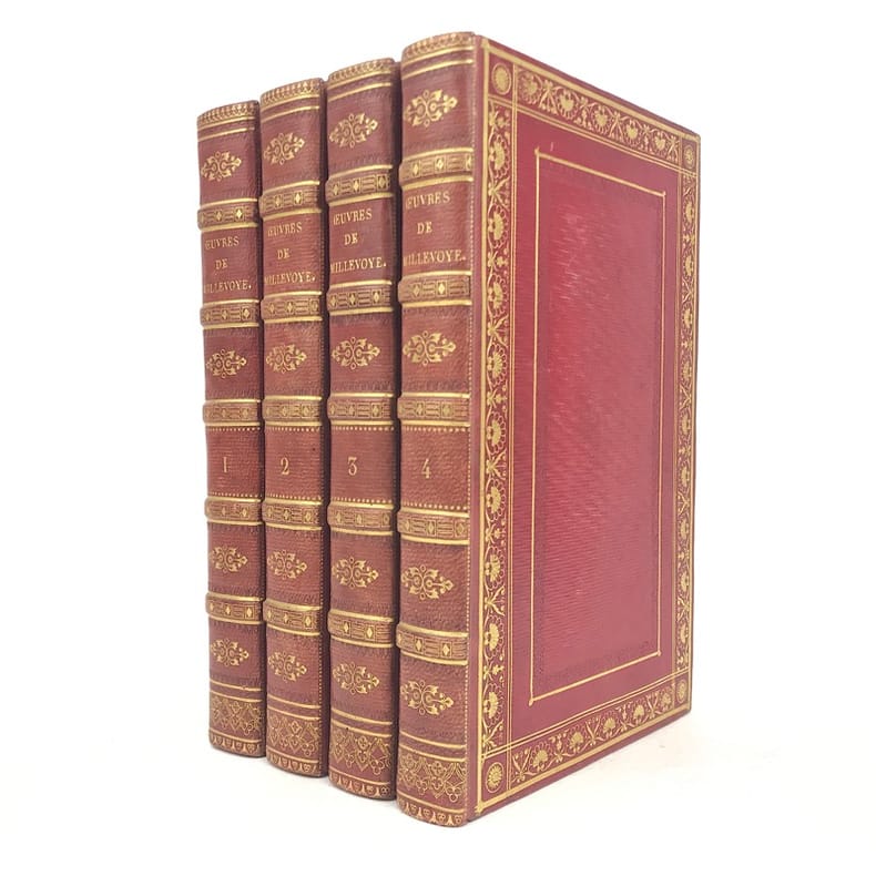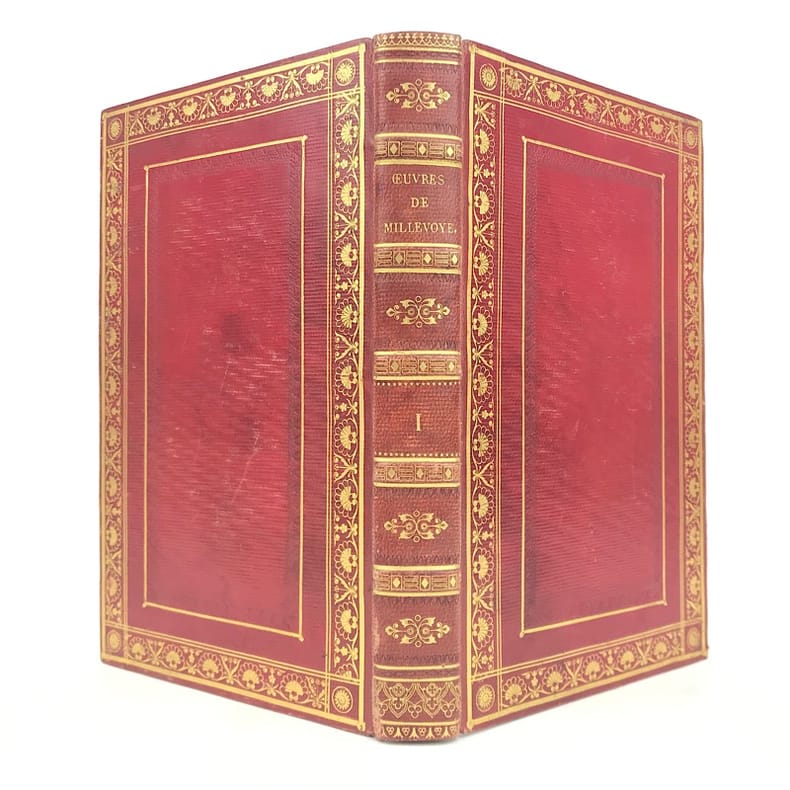 4 volumes in-8 (20,5 cm x 12 cm), maroquin rouge à longs grains (reliure de l’époque), dos à nerfs orné de motifs dorés, dentelle dorée en encadrement des plats, tranches dorées. [6]-xxxi-1 bl.-364 ; [8]-389-1 bl. ; [8]-392 ; [8]-357-1 bl. pages (complet). Légers frottements à la reliure, claires rousseurs. État très correct. Première édition collective ornée d’un portrait en frontispice. À cheval sur deux siècles, Millevoye (1782-1816) fait partie des poètes de transition : il fait le joint entre le classicisme déclinant et l'aube du romantisme. De santé chétive, avec une mauvaise vue, poitrinaire, il alternait la vivacité et la mélancolie, l'impétuosité et l'amertume, le travail et la dissipation. Ses discours en vers composés pour les prix académiques, le relient au XVIIIe siècle didactique. Il prolonge les essais d'André Chénier (dont il a eu les brouillons en main) dans la voie du syncrétisme en ajoutant au fonds gréco-latin (notamment à travers des traductions de Virgile, Homère, Lucien, Anacréon) et biblique, le folklore d'inspiration nordique et médiévale. Il glisse de la romance à la ballade, qu'il acclimate en France et où il excelle. Il vise également au genre héroïque et narratif avec Charlemagne à Pavie, Alfred, La Peste de Marseille. Ce sont autant de préparations du romantisme qui le rendent très proche de Vigny et de Victor Hugo dans leurs débuts. Élégiaque, il chante ses émois, son mal de vivre, le tourment de sa précarité et de sa fin prochaine dans des textes expressifs. Bel exemplaire.