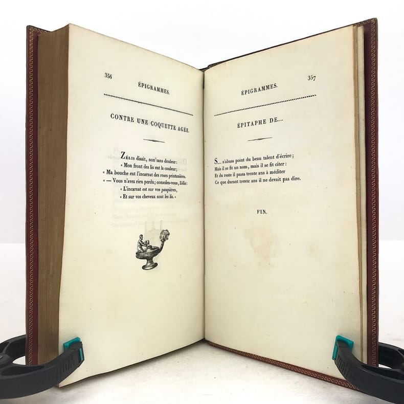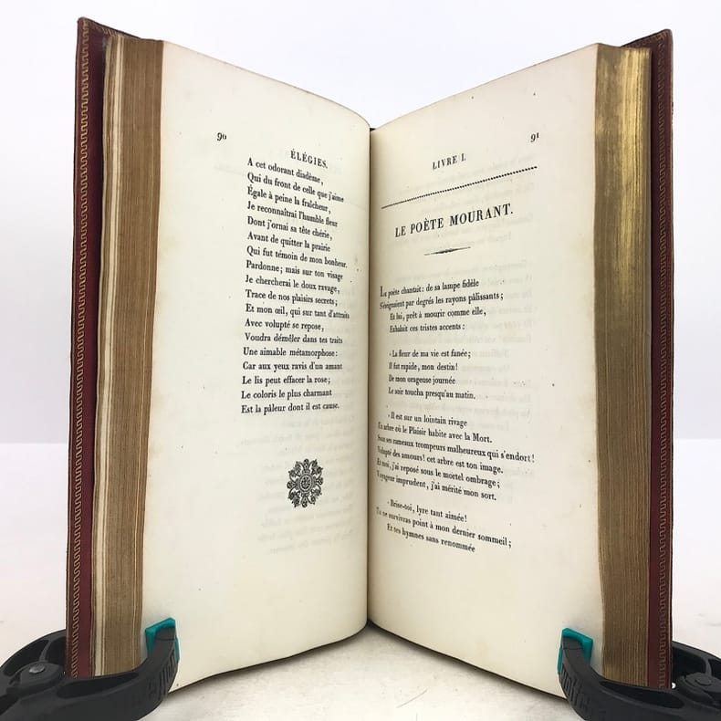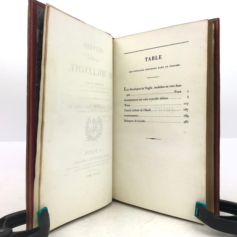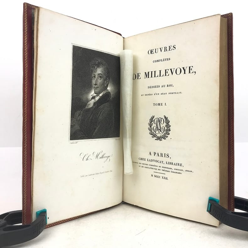 Chez Ladvocat, libraire / De l'imprimerie de Firmin Didot Paris, 1822, 4 vol. in-8 demi-veau tabac, petits coins de vélin vert, dos à quatre faux nerfs plats soulignés de roulettes dorées, fers à froid, pièce de titre et de tomaison noires, plats de papier moucheté, tranches marbrées. Reliure de l'époque. T.I 4ff.XXXI-264pp. Portrait frontispice sous serpente par Déveria gravé par West. Notice sur Millevoye / Sur l'Elégie / Elégies / Poèmes divers / Traduction de quelques odes d'Anacréon / Poésies légères / Dizains et huitains / Ballades / Romances / T.II 4ff.-389pp.Les Bucoliques de Virgile traduites en vers français (texte latin en regard) / Chants traduits de l'Illiade / Dialogues de Lucien // T.III 4ff.-392pp. Charlemagne à Pavie, poème en six chants / Alfred / La rançon d'Egill / Emma et Eginard / Belzunce ou la peste de Marseille, poème / La mort de Rotrou / Goffin ou le héros Liégeois / L'amour maternel / Hermann et Thusnelda, scène lyrique / Fragment de Saül // T.IV IV-357pp. Corésus / Nouveaux dialogues des morts / Fragments de Clovis / Ugolin / La fête des martyrs / La Foi, l'Espérance et la Charité / Note / Epigrammes. Vicaire V-862. Très bon exemplaire, sans rousseur, en reliure de l'époque. Deux petits trous en heut du mors du T.I, tout petit manque en bas du mors du T.II (3mm).