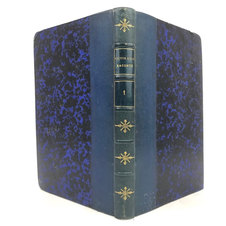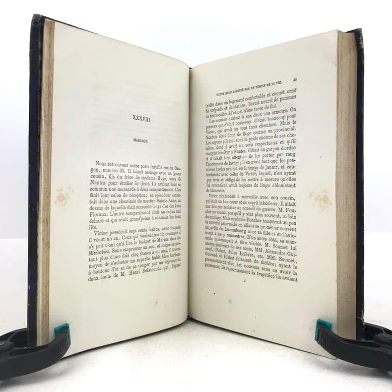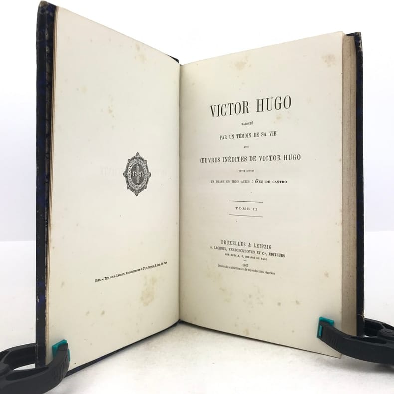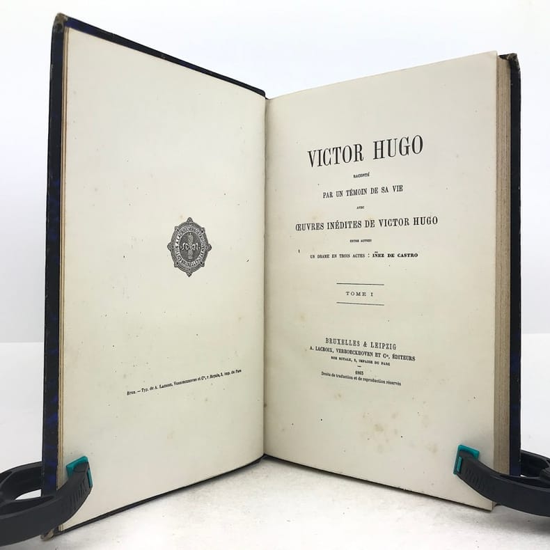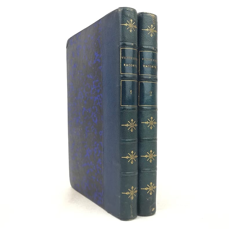 2 volumes in-8 (22 cm x 14 cm), demi-chagrin bleu (reliure de l’époque, dos à nerfs à fleurons dorés, ex-libris contrecollé sur le contreplat de Georges Donckier de Donceel. 367-1 bl. ; 419-1 bl. pages (complet). Frottements à la reliure, claires rousseurs. État très correct. Édition publiée la même année que l’originale. Ouvrage biographique composé par la femme de Victor Hugo, Adèle Hugo. Agréable exemplaire. Vendu 02/10/2025
