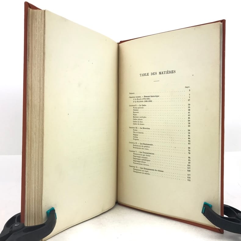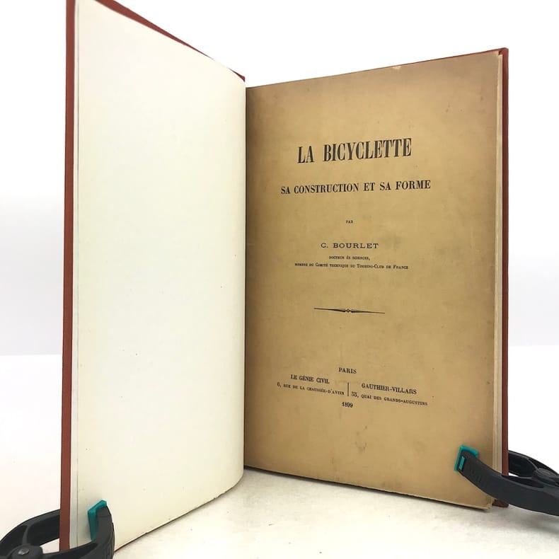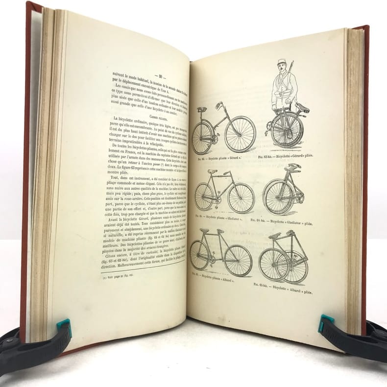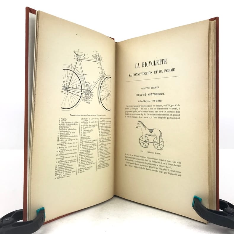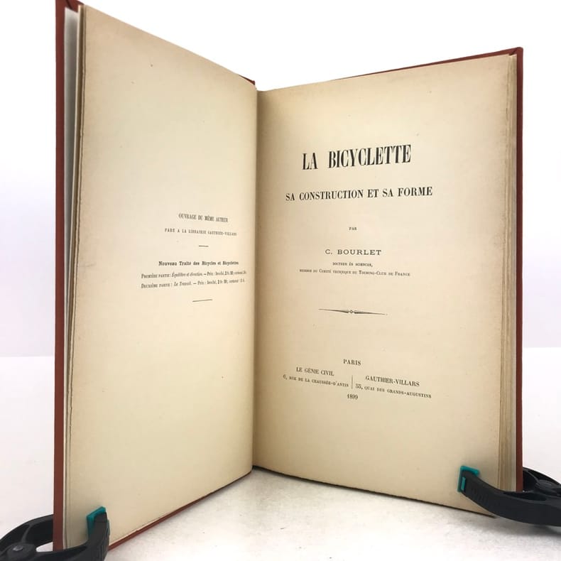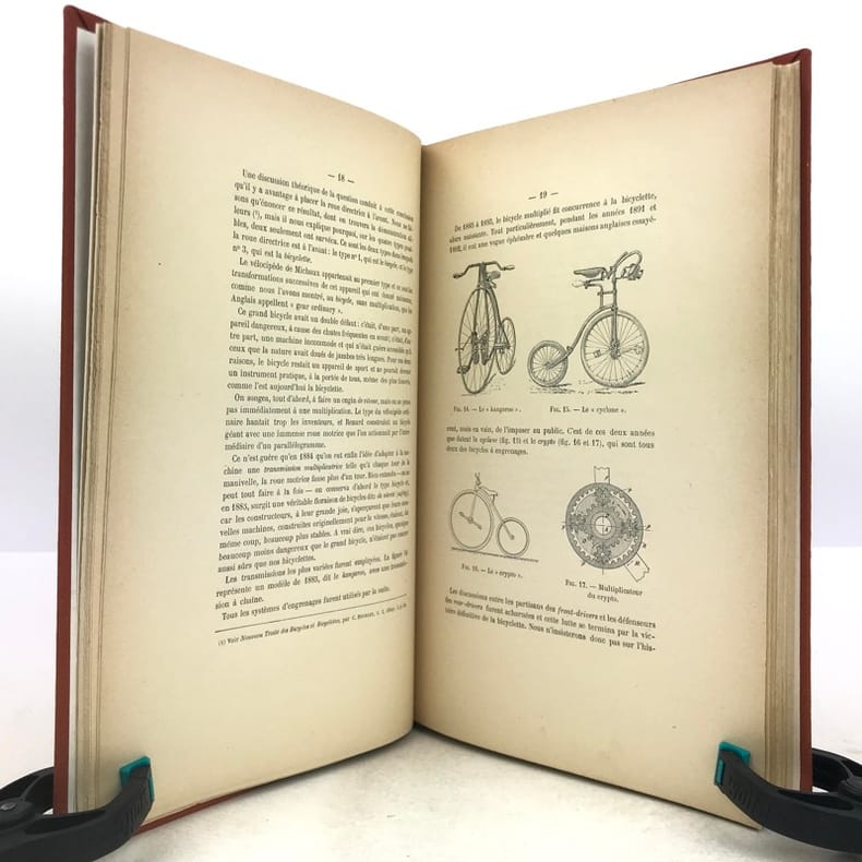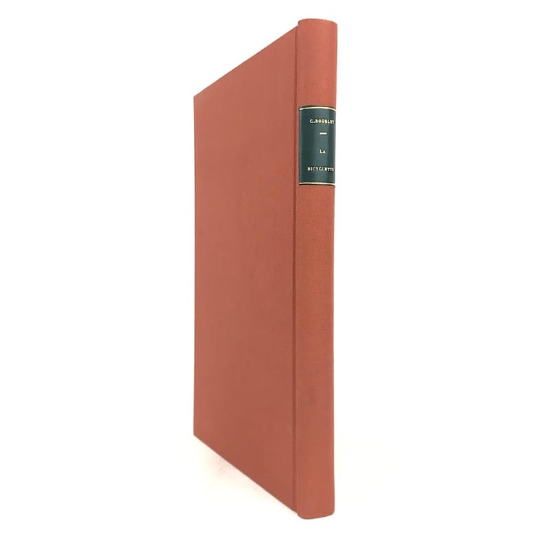 1 volume grand in-8 (25 x 16,5 cm), bradel toile brique (reliure moderne), pièce de titre noire, couverture conservée. [2]-228 pages (complet). Couverture brunie, salissures marginales à quelques feuillets. État très correct. Première édition, dans ce format, de ce fameux traité sur les bicyclettes; illustrée de nombreuses figures in-texte. D’après la préface, ce texte reproduit une série d’articles, de l’auteur, publiés dans le journal le Génie Civil, et vient, faire suite aux deux volumes de Nouveau traité des Bicycles et Bicyclettes. Charles Émile Ernest Bourlet, dit Carlo Bourlet (1866-1913), mathématicien français. Professeur en classe de mathématiques spéciales au lycée Saint-Louis, il devient ensuite professeur de géométrie descriptive, puis de mécanique, au Conservatoire national des arts et métiers. Il est également professeur à l'École nationale supérieure des beaux-arts. On lui doit plusieurs ouvrages de mathématiques ainsi que plusieurs traités sur les bicyclettes, comme le Traité des bicycles et des bicyclettes, suivi d'une application à la construction des vélodromes (1895), dans lequel il propose de raccorder les lignes droites des vélodromes par des clothoïdes. Bon exemplaire.