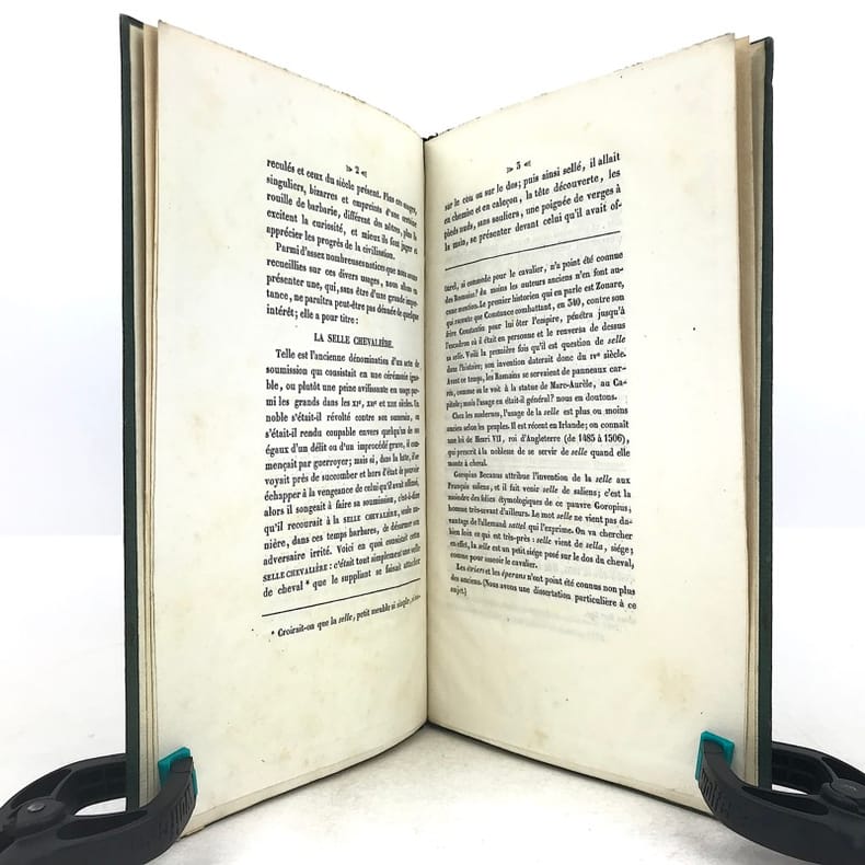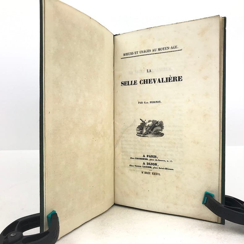 1 plaquette in-8 (22,5 x 14 cm), percaline verte (reliure moderne) auteur et titre dorés sur le dos à la française. [2]-16-[2] pages (complet). Habile restauration sur le titre, décoloration sur les feuillets blancs liminaires, pâles rousseurs éparses. État très correct. RARE ÉDITION ORIGINALE de ce curieux texte consacré à La selle chevalière : “châtiment infligé aux nobles durant le Moyen Âge ; elle consiste à devoir se présenter à un endroit imposé, pieds nus et tenant au-dessus de la tête la selle de son cheval, pour faire amende honorable. Gabriel Peignot a pris l'exemple de nombreux nobles qui s'étaient révoltés contre leur suzerain ou rendus coupables envers un de leurs égaux”. Étienne-Gabriel Peignot (1767-1849), bibliographe français. D'abord avocat à Besançon, Gabriel Peignot fut bibliothécaire et inspecteur de diverses institutions, successivement : bibliothécaire près l'École centrale de la Haute-Saône à Vesoul sous le Directoire, principal du Collège Gérôme de Vesoul en 1803, inspecteur de la librairie à Dijon en 1813, proviseur du collège de cette ville en 1815 et inspecteur des études de l'Académie de Saône-et-Loire. Il fut en plus membre de l'Académie celtique de Paris, et de plusieurs sociétés littéraires. Il fut l'un des plus célèbres auteurs de bibliographie de son temps. Tirage à 180 exemplaires, celui-ci non numéroté. Bon exemplaire.