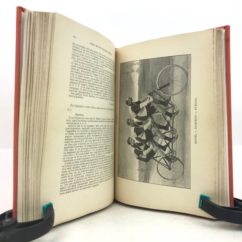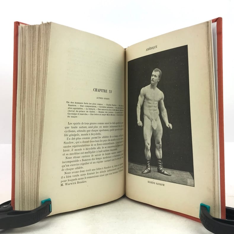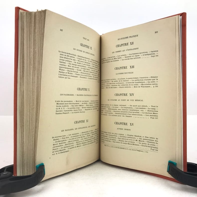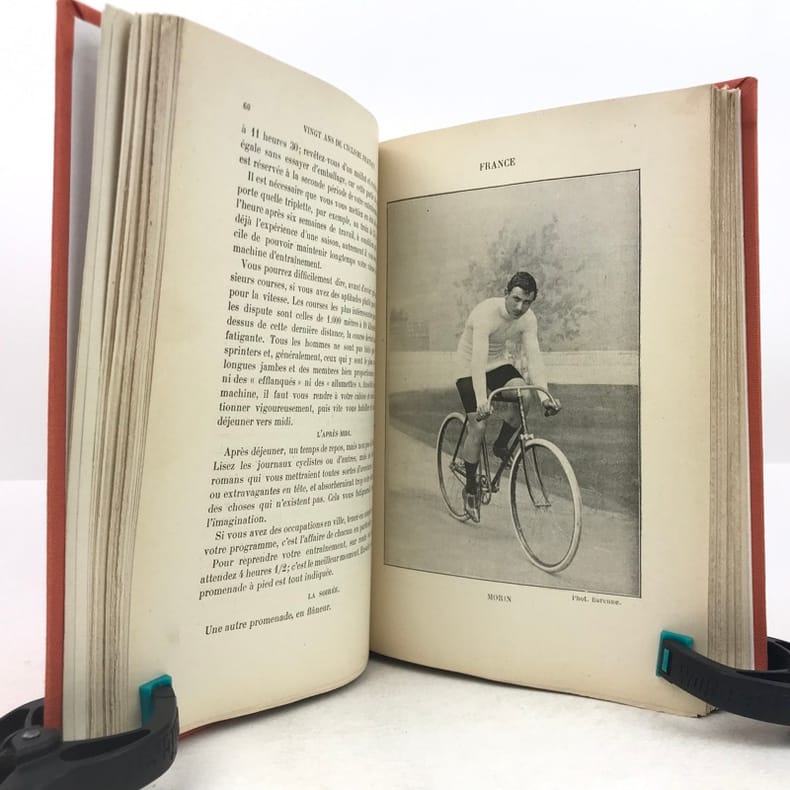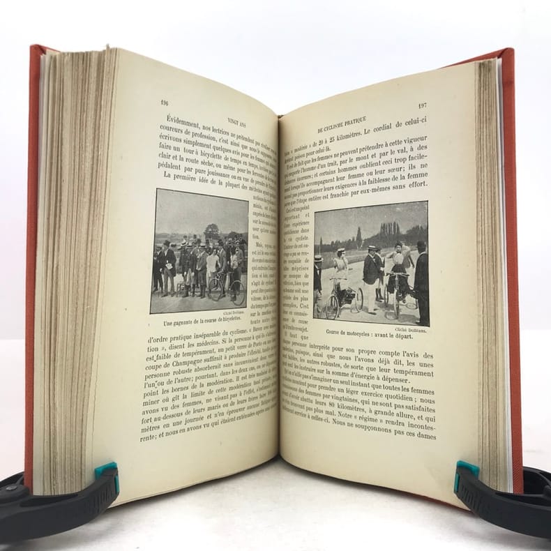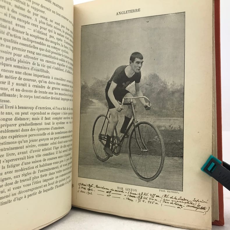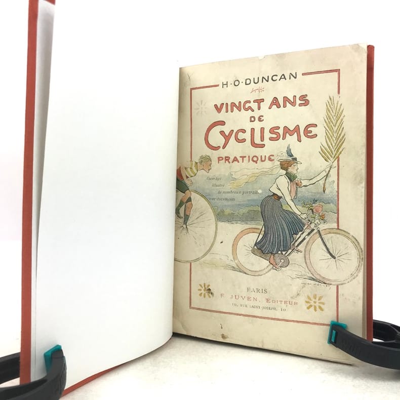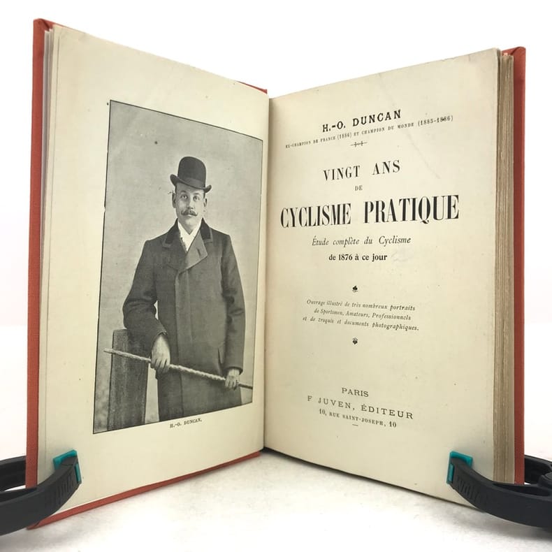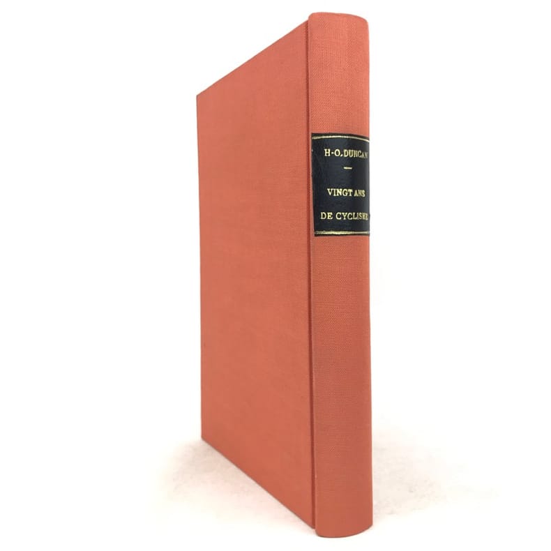 1 volume in-8 (19,5 x 14 cm), bradel toile orange (reliure moderne), pièce de titre noire, couverture illustrée conservée, notes manuscrites marginales sur une planche, texte souligné à plusieurs feuillets. [4]-vii-1 bl.-263-[9] pages (complet). Salissures marginales à quelques feuillets, première de couverture en partie détachée, restaurations angulaires à la couverture, et sur le titre sans atteinte au texte. État très correct tout de même. RARE ÉDITION ORIGINALE ornée d’une couverture illustrée en couleurs par Lucien Métivet et de très nombreux portraits de sportsmen, Amateurs, Professionnels et de croquis et documents photographiques in-texte, la plupart à pleine page, dont un portrait de l’auteur en frontispice. Exemplaire truffé d'une coupure de presse. Herbert Osbaldeston Duncan (1862–1945) cycliste de course anglais, journaliste et pionnier de l’industrie automobile britannique. Il fut champion de France en 1886 et champion du monde (1885-1886). Bon exemplaire.