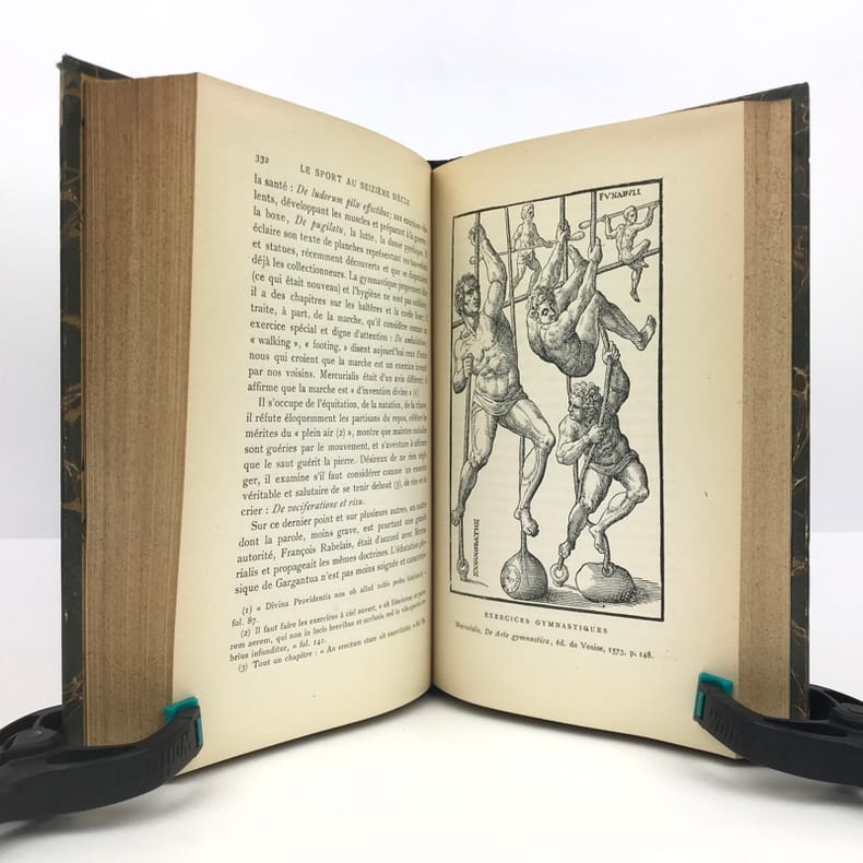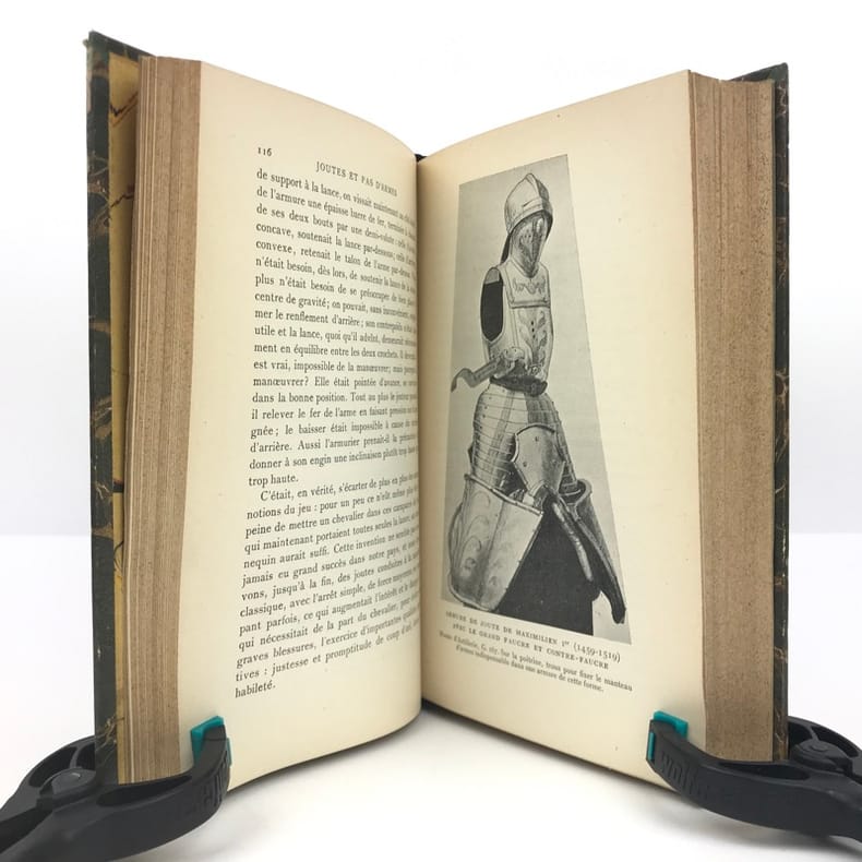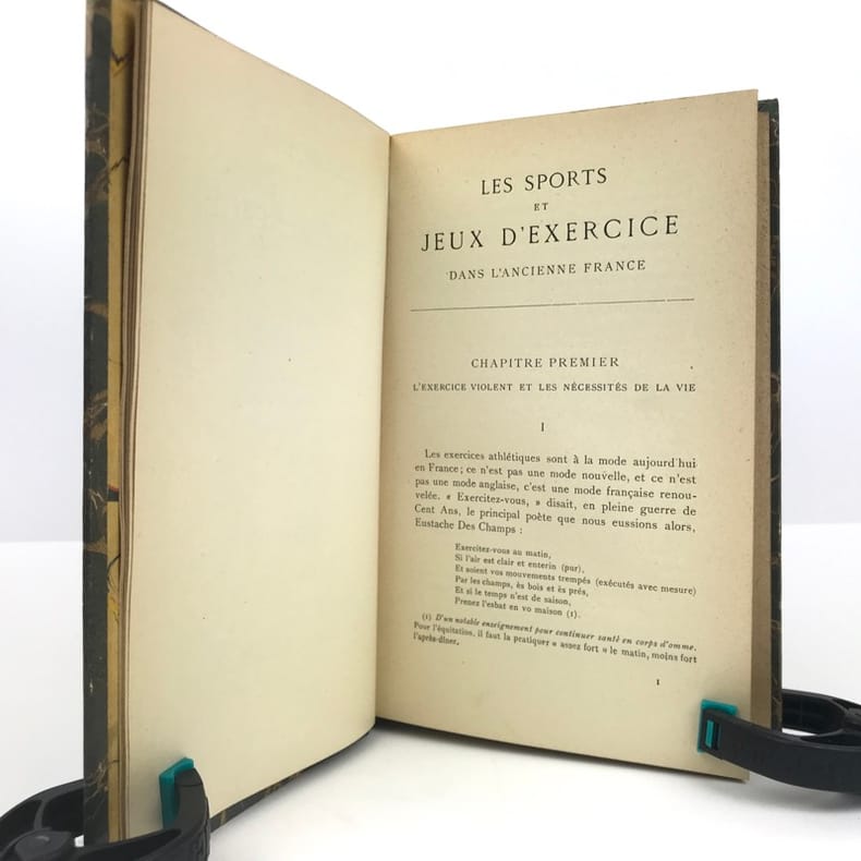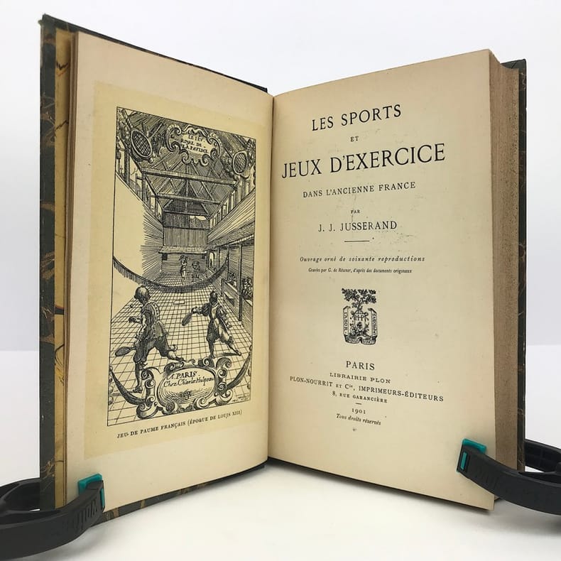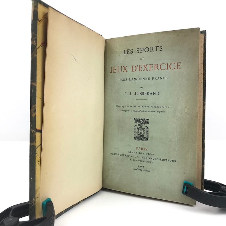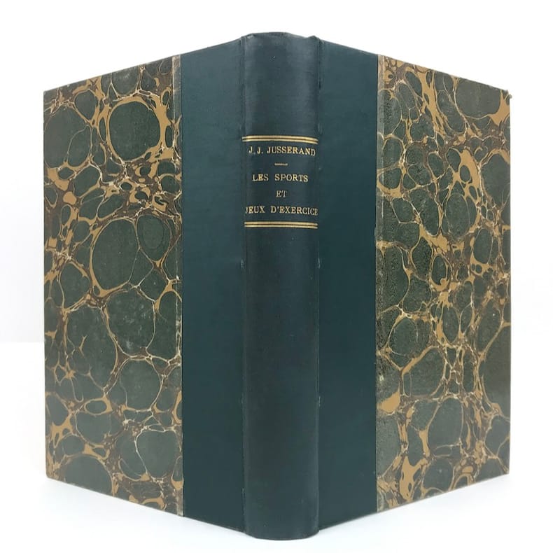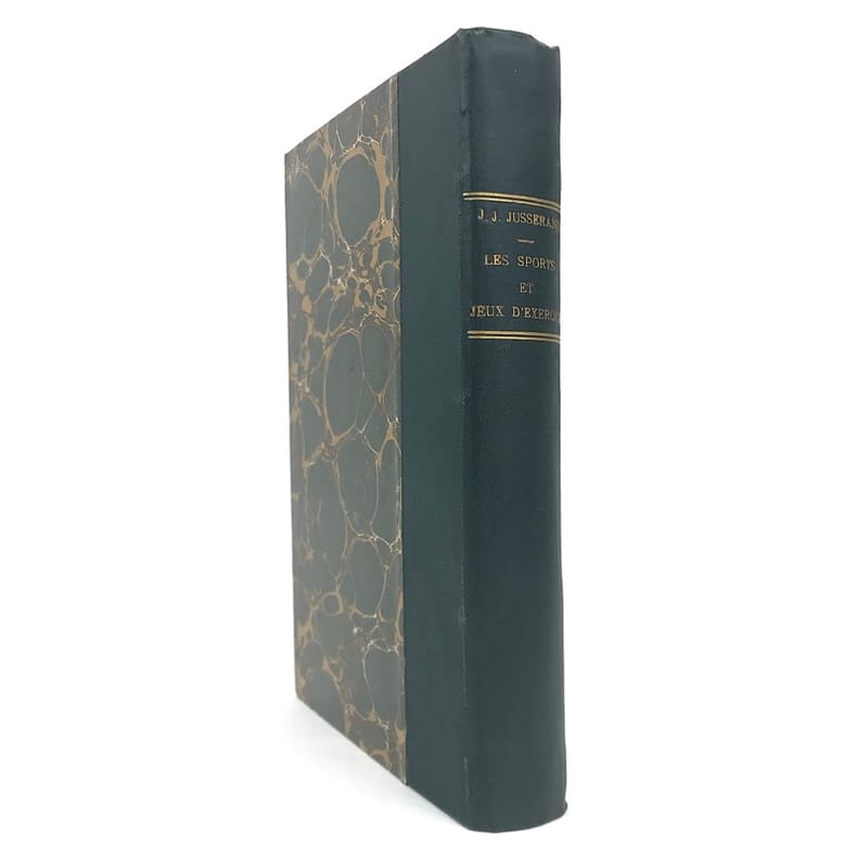 1 volume petit in-8 (19 x 13 cm), demi-percaline verte (reliure de l’époque), dos lisse, couverture conservée. [4]-474-[2] pages (complet). Rousseurs et salissures sur la couverture. ÉDITION ORIGINALE ornée de 60 reproductions in-texte gravées par G. de Résener, d’après des documents originaux, dont 28 à pleine page (certaines hors texte comprises dans la pagination), composée d’articles sur les armes, les tournois, les joutes, la lutte, la chasse, le jeu de paume, etc. Jean-Jules Jusserand (1855-1932), diplomate et historien français. Il fut notamment ambassadeur de France aux États-Unis de 1902 à 1924. Bon exemplaire.