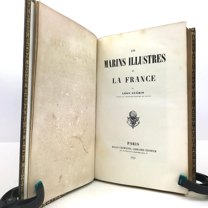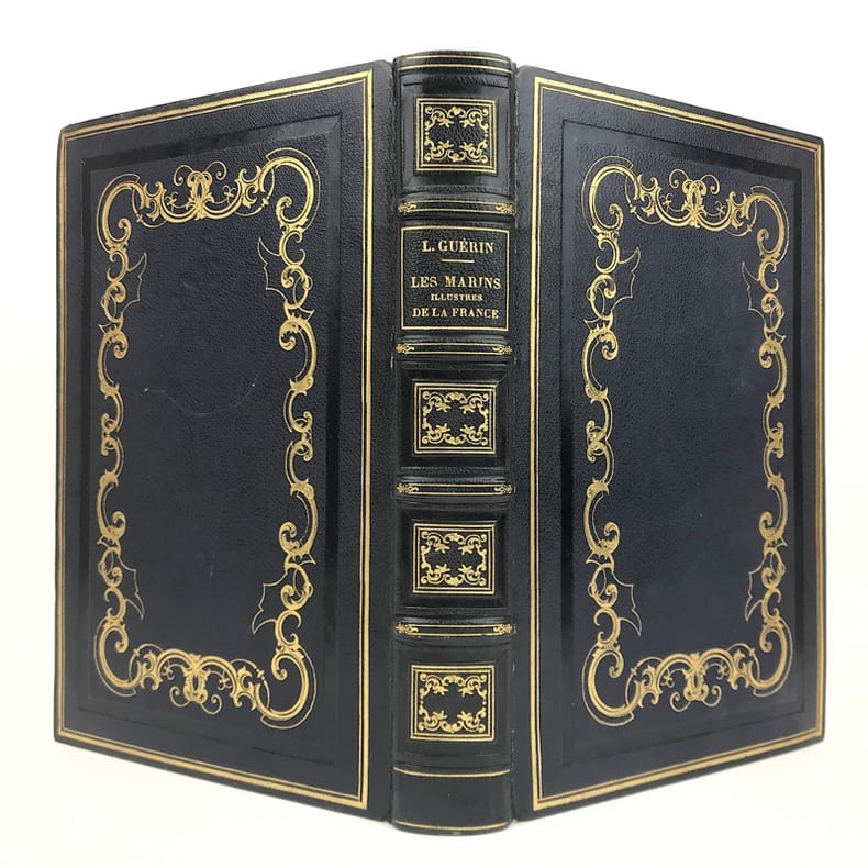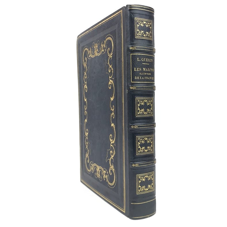 1 volume in-8 (25 x 16,5 cm), chagrin bleu marine (reliure de l’époque), dos à nerfs joliment orné, décor de filets dorés et à froid sur les plats, roulette dorée intérieure, doublure et gardes de papier moiré blanc, tranches dorées. viii-632 pages (complet). Légers frottements aux charnières de la reliure, rousseurs éparses avec atteinte au texte, sans gêne de lecture, et à certaines planches, quelques planches brunies dans la partie supérieure (auréole provoquée par l'aquarelle). État très correct tout de même.ÉDITION ORIGINALE illustrée par Victor Adam et Maurin d’un titre gravé en frontispice et de 18 portraits de marins lithographiés hors texte à fond teinté avec leurs armes peintes à la main au-dessus.Dans cet ouvrage, Léon Guérin rend hommage à de célèbres marins de l'histoire de France, parmi lesquels on peut citer d'Estrées, Duguay-Trouin, d'Estaing, etc.Léon Guérin (1807-1881), écrivain, journaliste, historien et poète français du xixe siècle. Il commence sa carrière littéraire comme écrivain tantôt sous son nom, tantôt sous celui de Guérin-Dulion ou Léonide de Mirbel. Auteur de contes et de nouvelles, et poète - il publie dans sa jeunesse des Chants lyriques et autres essais poétiques; il se lance dans le journalisme, il fonde le Journal des enfants, puis La Gazette des enfants et des jeunes personnes, avant de se spécialiser dans l'Histoire. Il est nommé historiographe du musée de la marine en 1846. À ce titre, il est nommé chevalier de la légion d'honneur le 9 février 1846.Bon exemplaire.