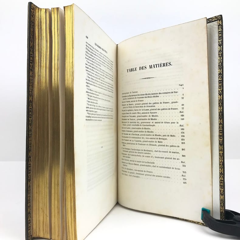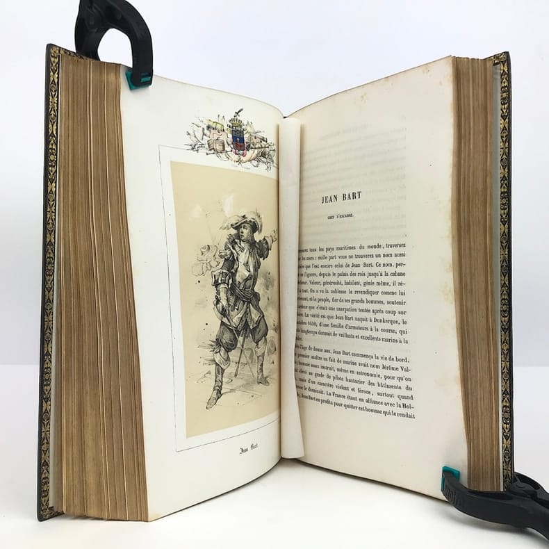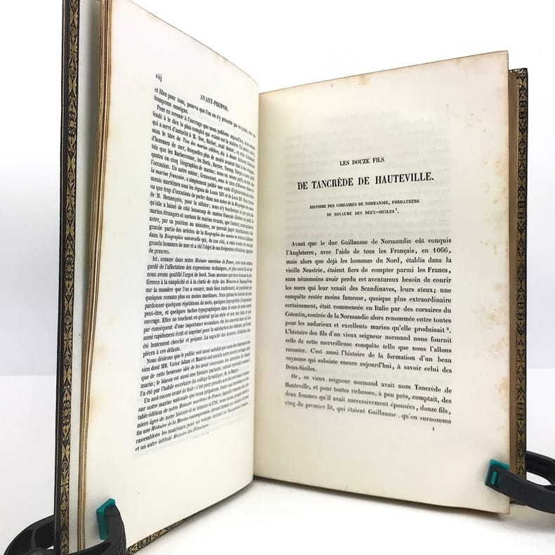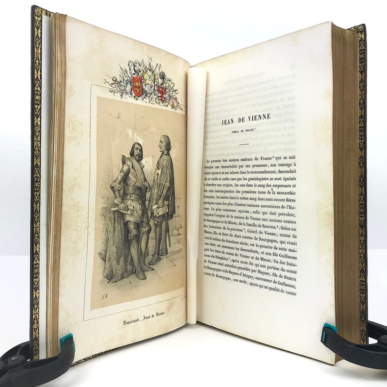 in 8 demi-chagrin vert à nerfs, titre, caissons et roulette dorés, plats percaline verte chagrinée, triple filet à froid en encadrement. Faux-titre, frontispice illustré sous serpente, titre, VIII, 632 pages, tranches dorées. 17 gravures hors-texte avec blason en couleurs dans la partie supérieure, par Victor ADAM. Y compris le frontispice, gravures sous serpentes. Paris BELIN-LEPRIEUR libraire éditeur 1845 édition originale. Jean BART, De SOURDIS, TOURVILLE, FORBIN, SUFFREN, DUGUAY- TROUIN etc. Rousseurs éparses habituelles