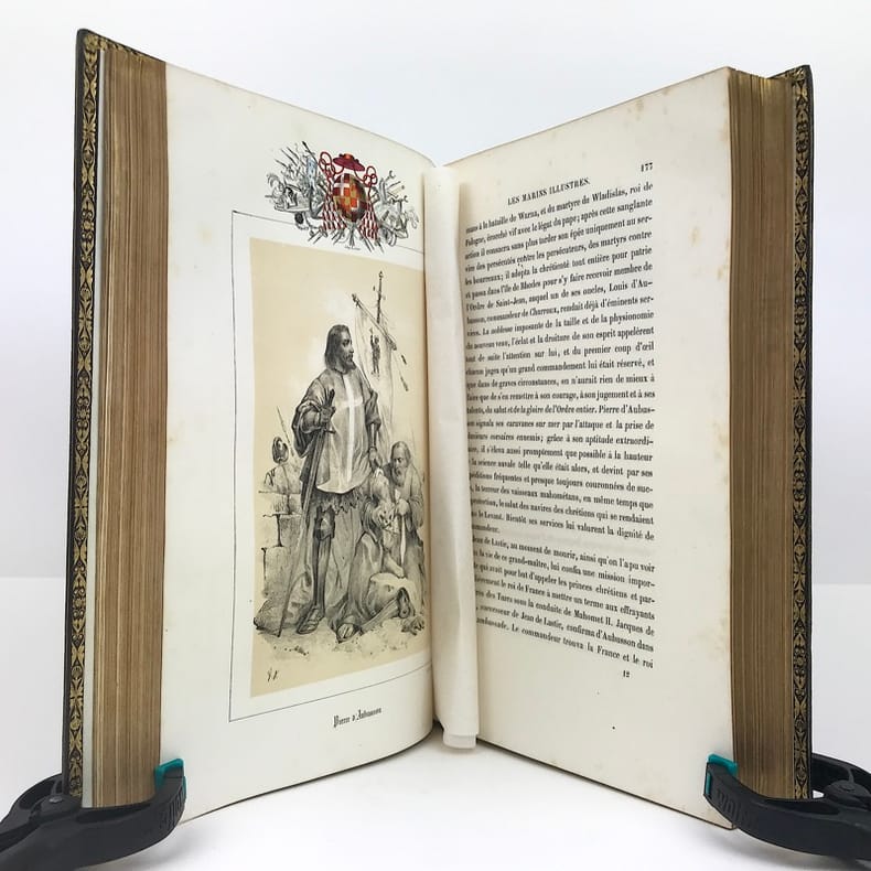 Bel exemplaire de ces récits biographiques consacrés aux plus célèbres marins français par Léon Guérin (1807-1881), poète, journaliste et historien français. Léon Guérin fait ses débuts en poésie puis soriente vers le journaliste, il fonde notamment le journal des enfants mais aussi la Gazette des enfants et des jeunes personnes. Cest plus tard quil se spécialise en histoire, en particulier lhistoire maritime. Ses écrits tels que Histoire maritime de la France (1844) et le présent ouvrage : Les Marins illustres de la France (1845) lui valent dêtre nommé historiographe de la marine en 1846. Dans cet ouvrage, lauteur met à lhonneur 31 des plus illustres marins de lhistoire de France, parmi lesquels on peut citer DEstrées, Duguay-Trouin ou encore DEstaing. Chaque marin fait lobjet dun récit biographique très complet, 18 dentre eux étant enrichis dun portrait de plein pied lithographié, lui-même surplombé du blason personnel colorié à la main. Exemplaire bien conservé de ces récits biographiques relatant les faits les plus marquants des plus célèbres marins français. 1 vol. in-8° (259 x 166 mm.) of : [2] ff. (false title, engraved title); VIII; 632 pp.; 18 color lithographed portraits. Contemp. half green chagrin with period corner, back with false nerves ornamented and titled, plates covered with blue embossed paper, gold edges. Beautiful copy of these biographical accounts devoted to the most famous French sailors by Léon Guérin (1807-1881), French poet, journalist and historian. Léon Guérin made his debut in poetry then turned to journalism, he founded the children's newspaper but also the Gazette des enfants et des jeunes personnes. It is later that he specializes in history, particularly maritime history. His writings such as "Histoire maritime de la France" (1844) and the present work: "Les Marins illustres de la France" (1845) earned him the title of naval historiographer in 1846. In this book, the author honors 31 of the most illustrious sailors in the history of France, among whom we can mention D'Estrées, Duguay-Trouin or D'Estaing. Each sailor is the subject of a very complete biographical account, 18 of them being enriched by a lithographed full-length portrait, itself overhung with the personal coat of arms colored by hand. A well-preserved copy of these biographical narratives relating the most outstanding facts of the most famous French sailors.