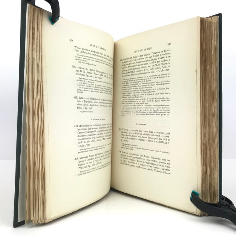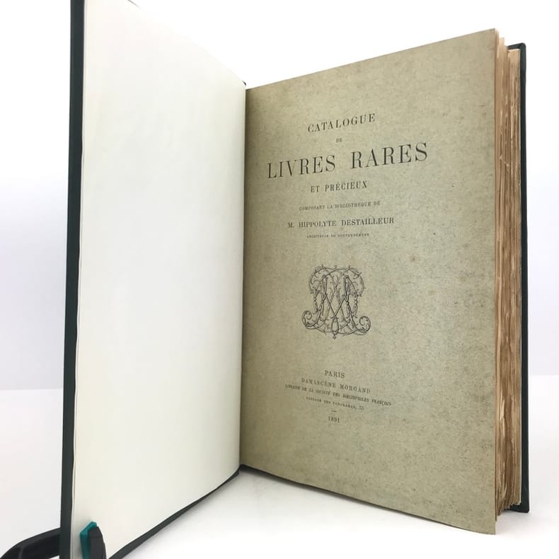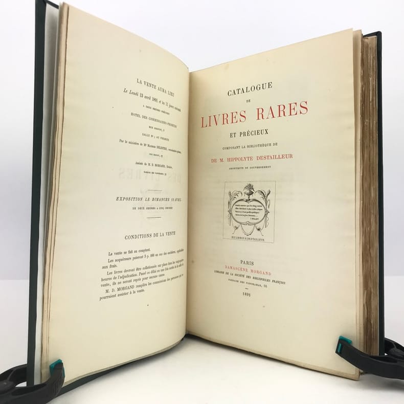 ÉDITION ORIGINALE de ce catalogue ornée d’une héliogravure à double page, hors texte, représentant la reliure du “Livre de la conquête de la Toison d’or”. Catalogue de ventes divisées en 12 vacations, du 13 avril au 25 avril 1891 à l’Hôtel des Commissaires-priseurs, rue Drouot, présentées par Me Maurice Delestre, assisté de M. D. Morgand. Bibliothèque divisée en 7 catégories : Histoire générale de l’Art; Dessin ; Architecture ; Sculpture ; Peinture ; Gravure ; Rapport des Arts du dessin avec la Religion, la Littérature, l’Histoire, la Société, les Personnes et l’Industrie. Hippolyte Alexandre Gabriel Walter Destailleur (1822-1893), architecte, collectionneur, bibliophile et historien de l'art français. Architecte de renommée internationale, restaurateur, entre autres, des grandes demeures de Courances et de Vaux-le-Vicomte, Destailleur constitua une très importante collection de dessins d'architecture et d’ornements qui fut sa "base documentaire" professionnelle. Bon exemplaire.