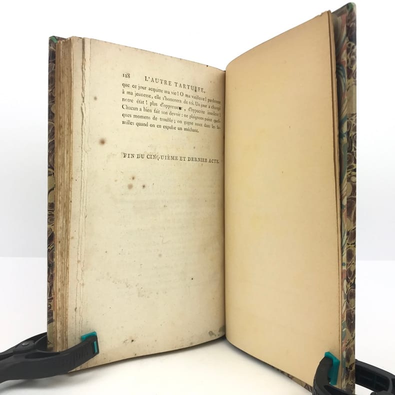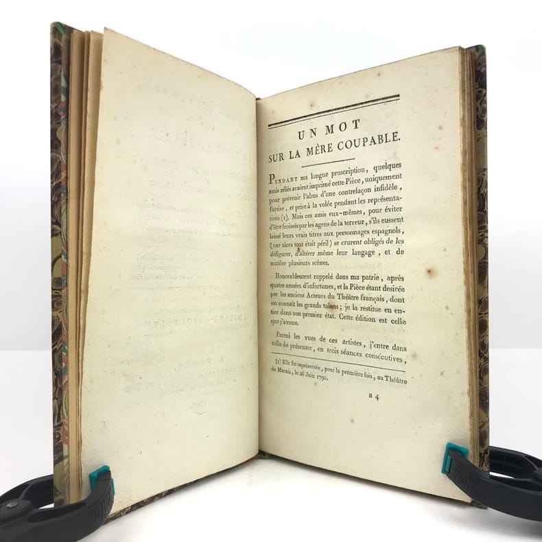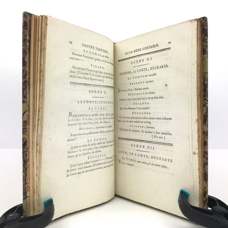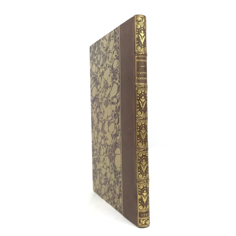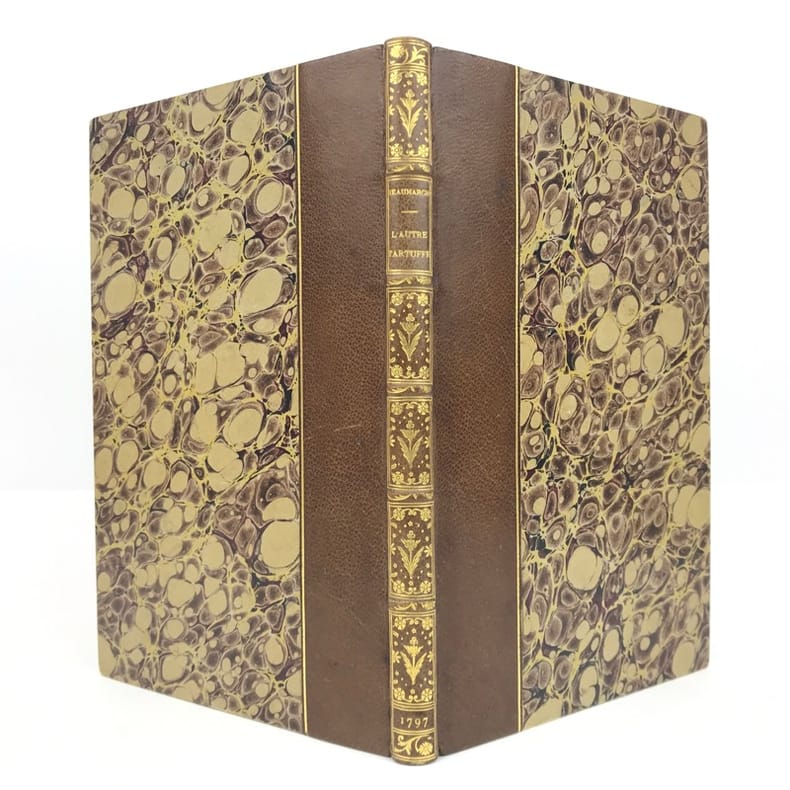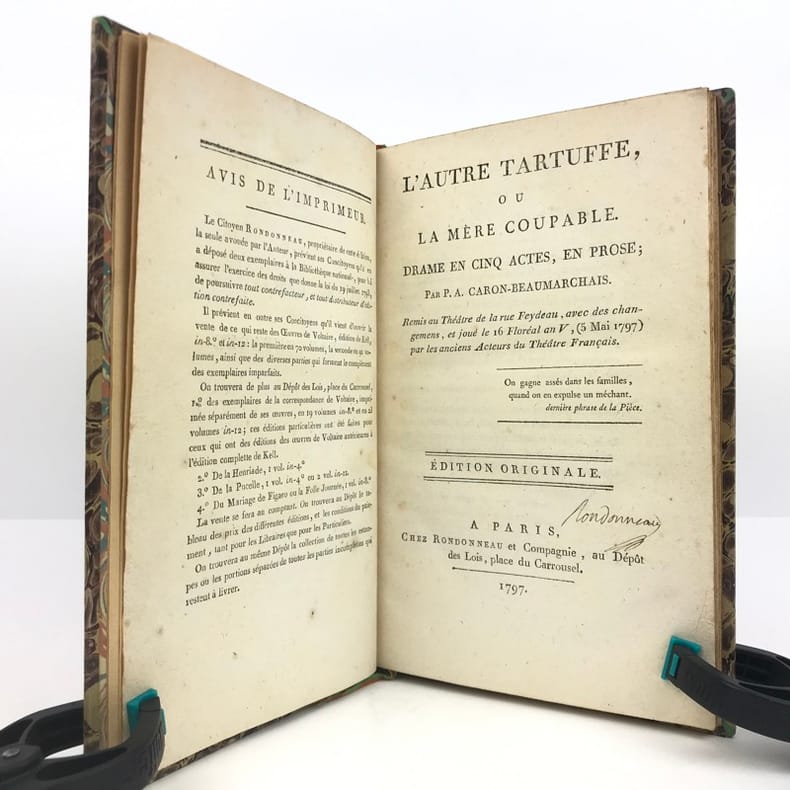 1 volume in-8 (21,5 cm x 13 cm), demi-chagrin brun (reliure postérieure), dos à nerfs orné de motifs dorés, ex-libris de Rondonneau manuscrit sur la page de titre. 13-[1]-128 pages (complet). Rousseurs. État très correct. ÉDITION ORIGINALE. L'Autre Tartuffe ou la Mère coupable est un drame en cinq actes, achevé en 1792. La première, jouée le 26 juin 1792 au théâtre du Marais, est un échec, mais la reprise au Théâtre de la rue Feydeau, le 16 Floréal an V (5 mai 1797), se révèle un grand succès. Elle représente la troisième partie de la trilogie de Figaro, après Le Barbier de Séville (1775) et Le Mariage de Figaro (1778). Rare exemplaire de l’éditeur.