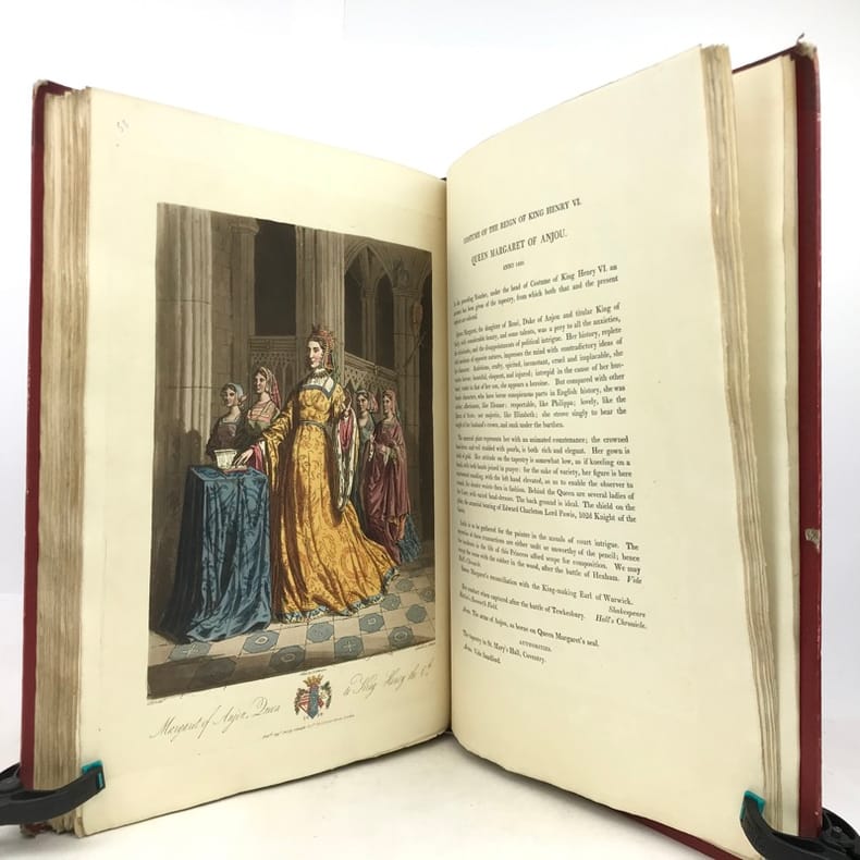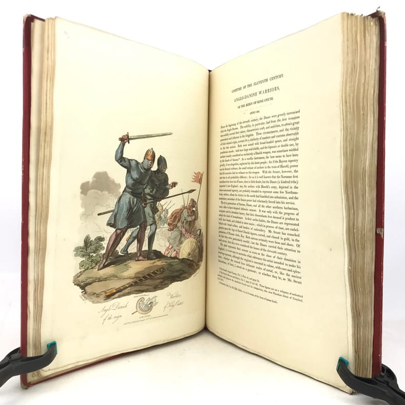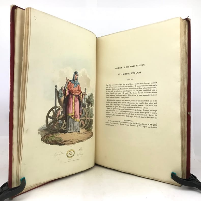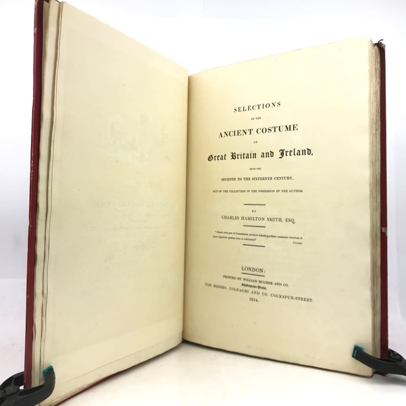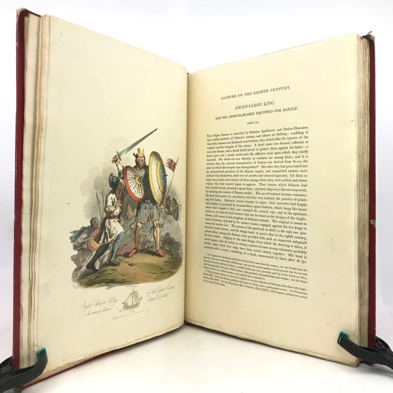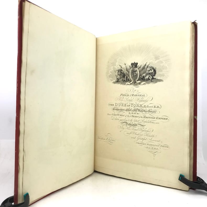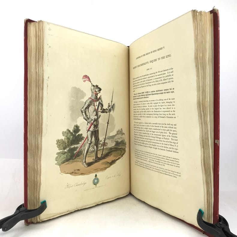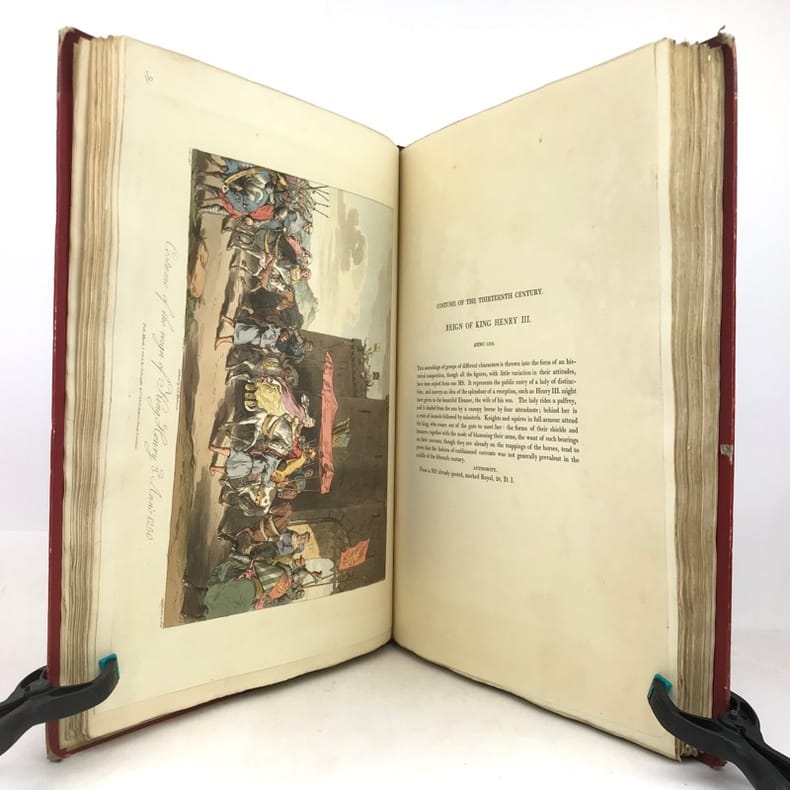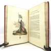 1 volume in-folio (38 x 26,5 cm), demi maroquin rouge à coins (reliure de l’époque), dos lisse orné de multiples roulettes et filets, viii-[124] pages (complet). Frottements angulaires et sur les plats, coins émoussés, piqûres éparses. Bon état intérieur. Édition originale de ce charmant ouvrage de costumes civils et militaires, expliqués en anglais, complet du feuillet des souscripteurs. Édition illustrée d’un titre-frontispice, une planche de dédicace et de 63 planches pour 60 sujets (deux pour le Roi Edgar, William Beauchamp et Henry VI), gravées à l’aquatinte par L. A. Atkinson d’après les dessins de Charles Hamilton Smith. Charles Hamilton Smith (1776-1859) est un militaire, naturaliste, artiste et collectionneur d'antiquités britannique. Il étudie l’artillerie en Autriche et effectue plusieurs campagnes et voyages militaires. Après ses recherches sur les relations entre la balistique et la couleur des fantassins, l’armée britannique applique l’usage d’uniformes verts. Son œuvre compte plus de 38 000 dessins. Agréable exemplaire.