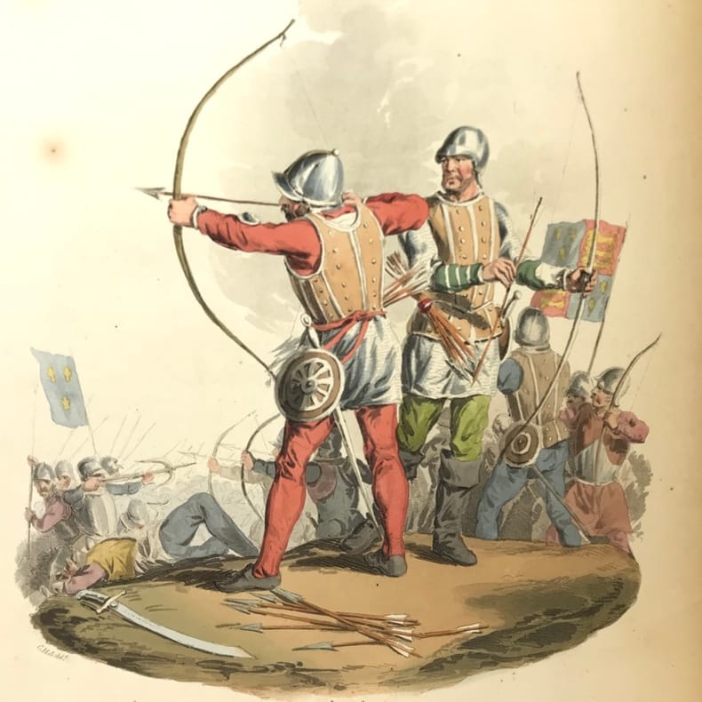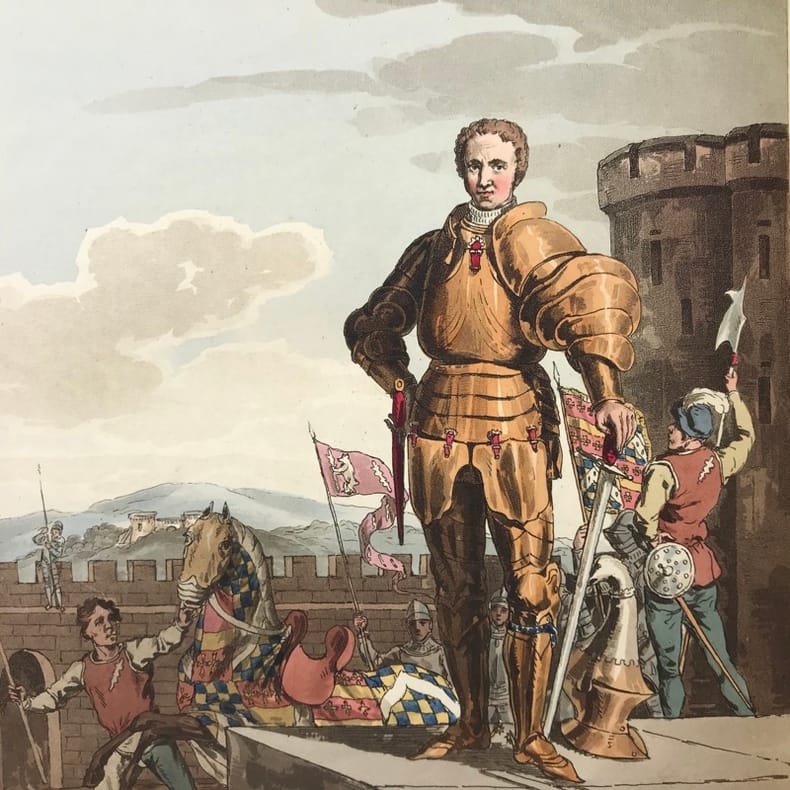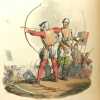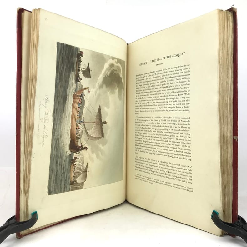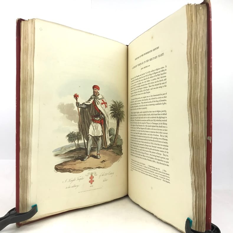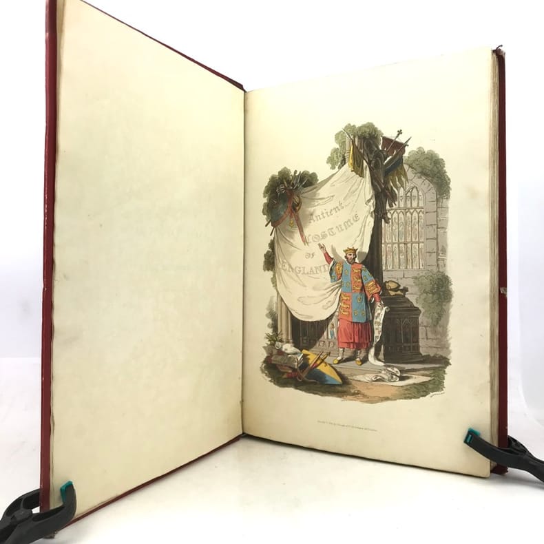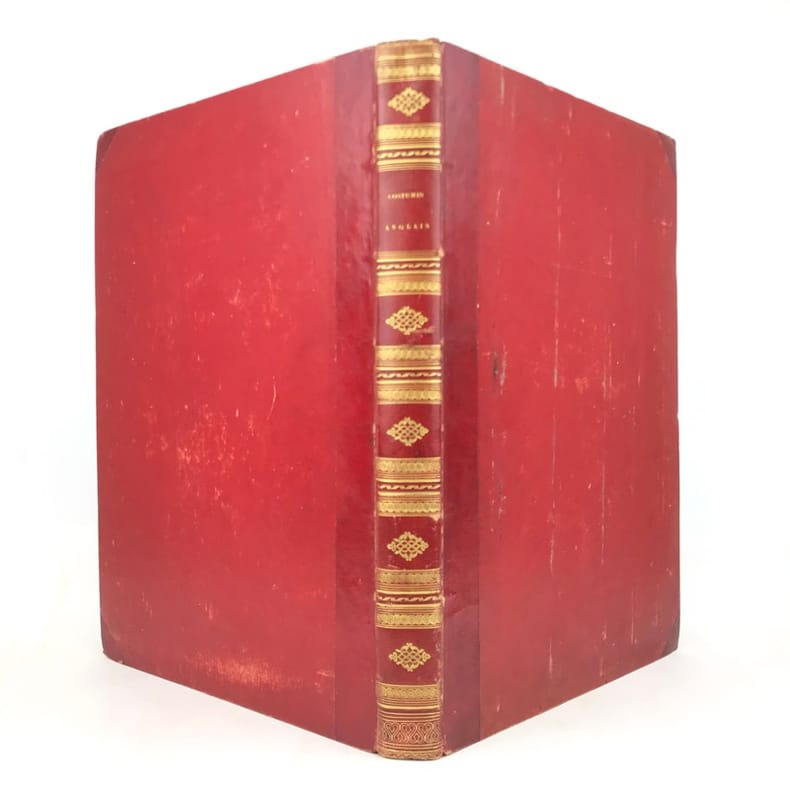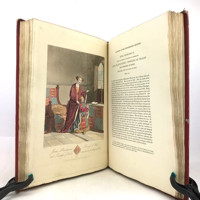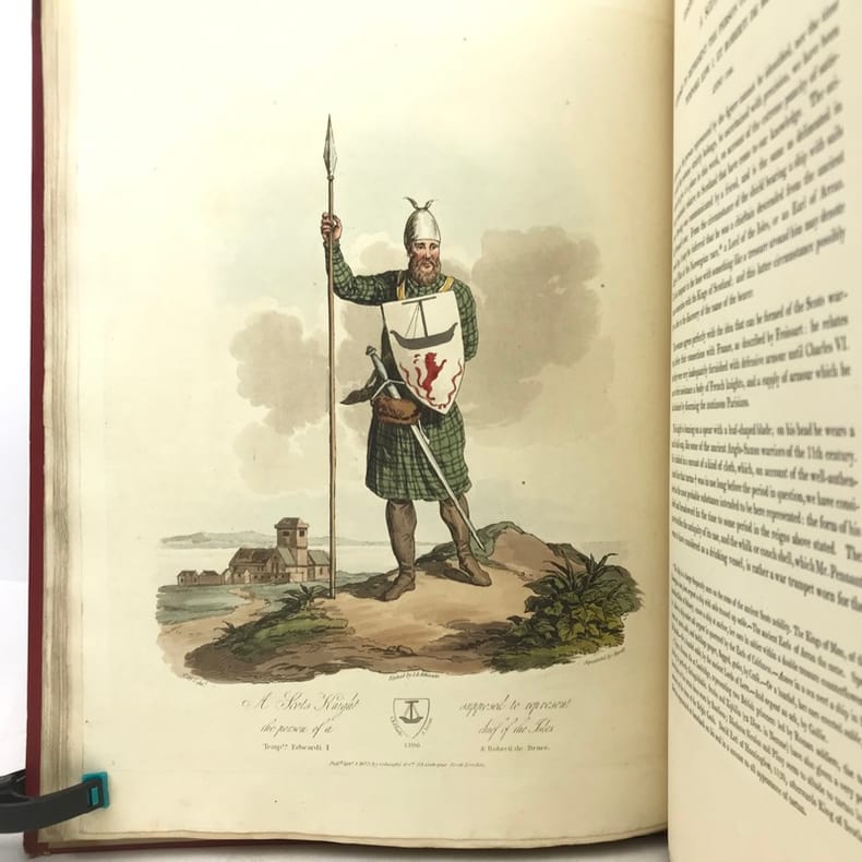 1 volume in-folio (38 x 26,5 cm), demi maroquin rouge à coins (reliure de l’époque), dos lisse orné de multiples roulettes et filets, viii-[124] pages (complet). Frottements angulaires et sur les plats, coins émoussés, piqûres éparses. Bon état intérieur. Édition originale de ce charmant ouvrage de costumes civils et militaires, expliqués en anglais, complet du feuillet des souscripteurs. Édition illustrée d’un titre-frontispice, une planche de dédicace et de 63 planches pour 60 sujets (deux pour le Roi Edgar, William Beauchamp et Henry VI), gravées à l’aquatinte par L. A. Atkinson d’après les dessins de Charles Hamilton Smith. Charles Hamilton Smith (1776-1859) est un militaire, naturaliste, artiste et collectionneur d'antiquités britannique. Il étudie l’artillerie en Autriche et effectue plusieurs campagnes et voyages militaires. Après ses recherches sur les relations entre la balistique et la couleur des fantassins, l’armée britannique applique l’usage d’uniformes verts. Son œuvre compte plus de 38 000 dessins. Agréable exemplaire.