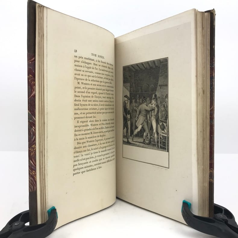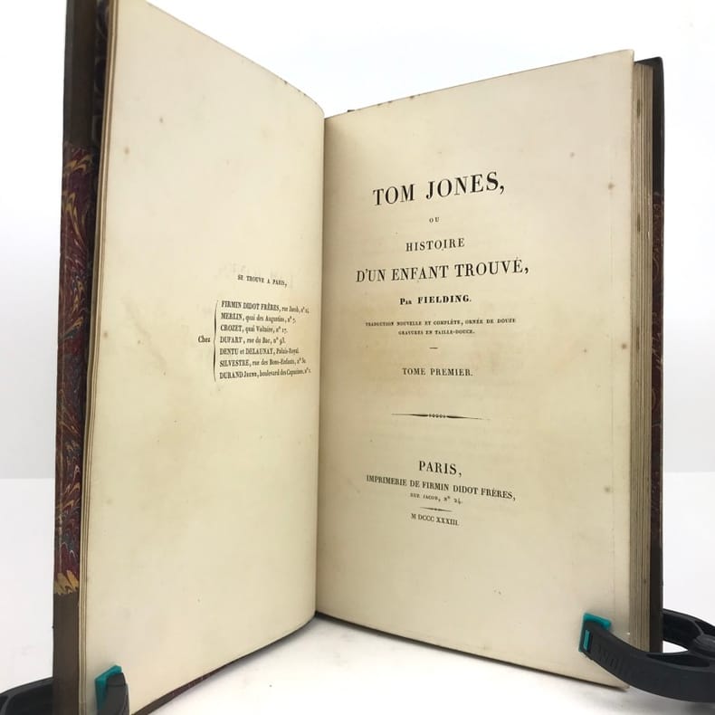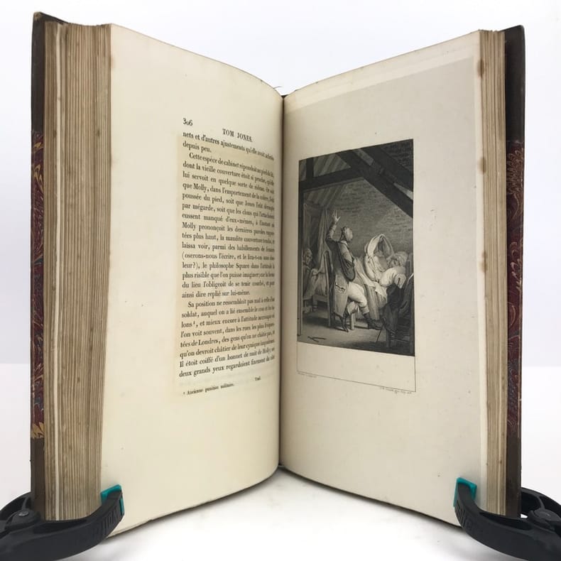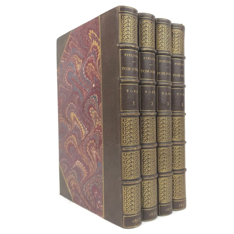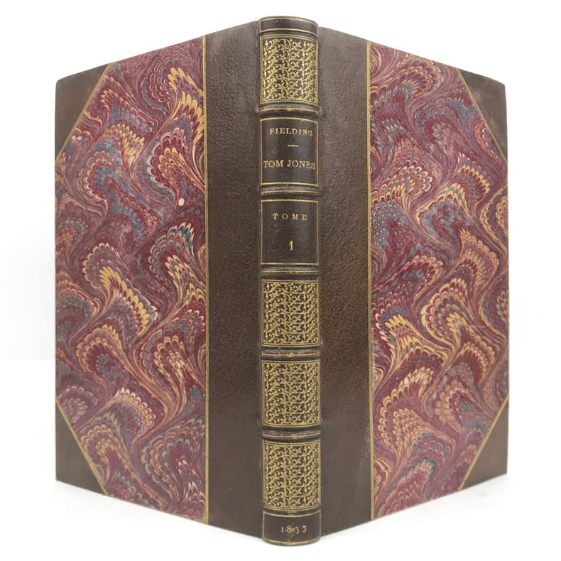 4 volumes grand in-8 (23,5 x 15 cm), demi maroquin brun à coins (reliure de l’époque), dos à nerfs joliment orné, double filet doré en bordure, tranche de tête dorée, xv-[1]-376 ; [4]-411-[1] ; [4]-356 ; [4]-444 pages (complet). Infimes frottements aux coins. Bon état. Nouvelle édition de la traduction française, illustrée de 12 gravures hors-texte, présentes en trois états. Henry Fielding (1707-1754) est un dramaturge, poète, essayiste et romancier anglais. Tom Jones devient très rapidement l'un des plus grands classiques de la littérature anglaise, figurant au sein de la liste de Maugham Somerset des dix plus grands romans. Fielding s'inspire de sa propre vie pour sa rédaction, et inclut notamment des traits de caractère de sa première épouse, Charlotte Craddock, décédée deux ans avant le début de sa rédaction. Agréable exemplaire.