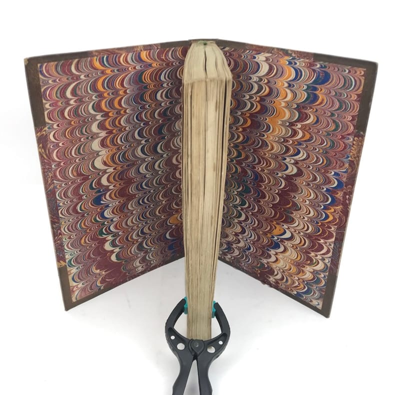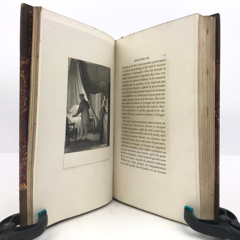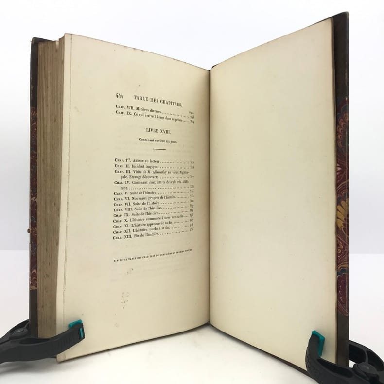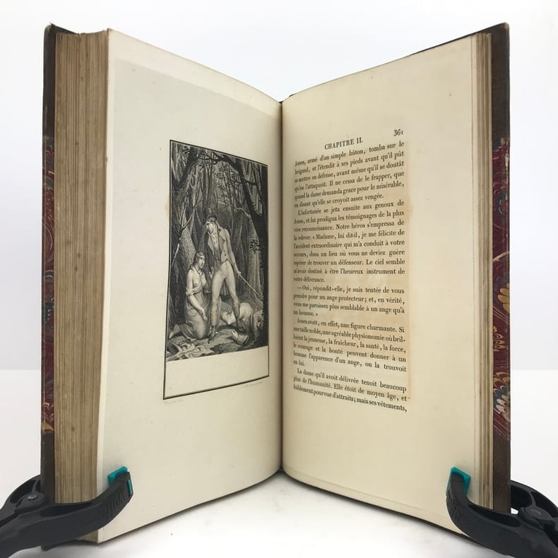 Paris, Dauthereau, Impr. Firmin Didot, Paris, Dauthereau, Impr. Firmin Didot1828 ; 6 volumes in-18, demi-veau rose, dos à nerfs, fil. et dent. dor., fleurons à froid, tr. marbr. 2 ff., IV pp., 283 pp. - 2 ff., 361 pp. - 2 ff., 338 pp. - 2 ff., 407 pp. - 2 ff., 324 pp. - 2 ff., 344 pp.“Le premier roman du monde et le livre le mieux fait de l’Angleterre” selon La Harpe, jugement confirmé par Somerset Maugham qui place Tom Jones parmi les dix plus grands romans dans son essai Dix romans et leurs auteurs. Publié à Londres en 1749, il sera adapté dès 1750 en français par Pierre-Antoine Laplace et retraduit ensuite par Davaux en 1795 puis par L. C. Chéron en 1804. Cette édition de 1828 est donné comme une traduction nouvelle. Dans l’Avant-propos du traducteur signé E. T., celui-ci parle de ses prédécesseurs “La Place qui a cruellement mutilé Tom Jones (...) Lavaux (pour Davaux) qui lui a fait parler un français rempli de négligences, Chéron, lourd et diffus dans son exactitude”. Nous n’avons pas su identifier ce nouveau traducteur. En tête du 1er tome on trouve (pp. 1. à 48) la Notice biographique et littéraire sur Henry Fielding par Walter Scott. Bel exemplaire, jolies reliures romantiques.