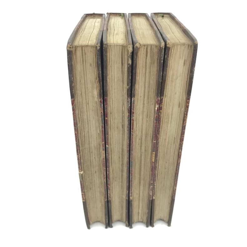Londres, 1801. Quatre volumes in-16 de 239, 236, 204 et 256 pages avec 9 charmantes gravures réparties dans les volumes. Très bon état intérieur. Charmantes reliures en veau vert foncé, filet doré sur les plats, dos lisse orné de paniers fleuris, carquois et vases de fleurs, pièces de titre et de tomaison rouges, filet perlé sur les coupes, roulette sur les chasses, tranches dorées. Dos légèrement passés et légères usures à certains motifs dorés. Mais l'ensemble est très agréable.