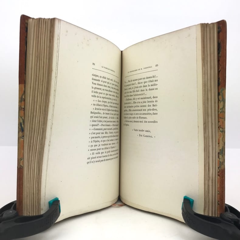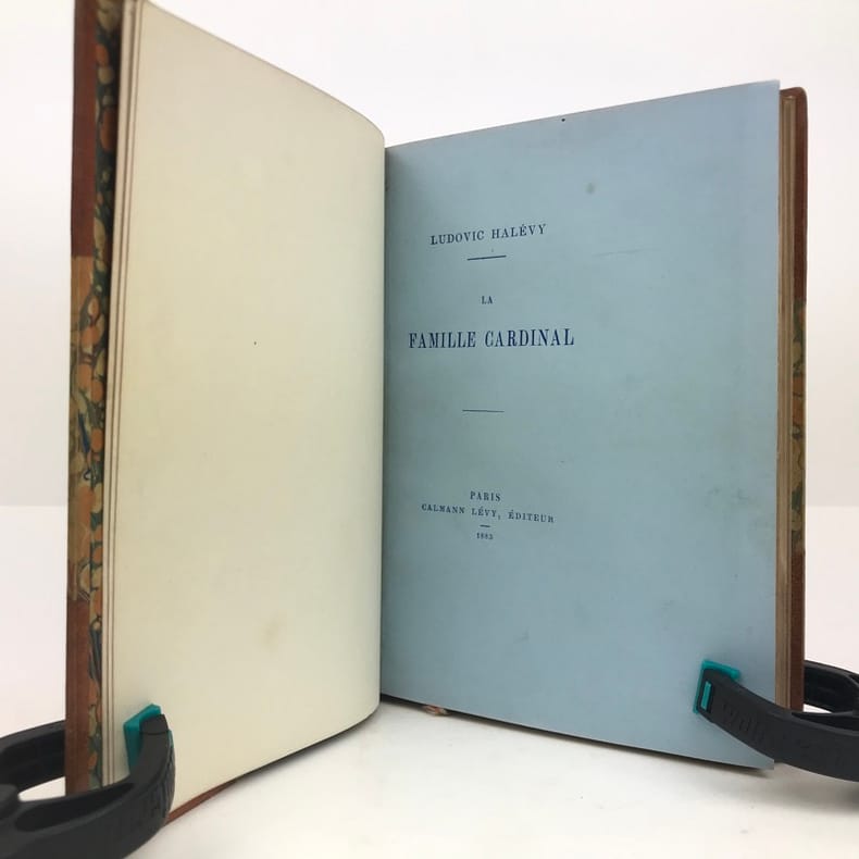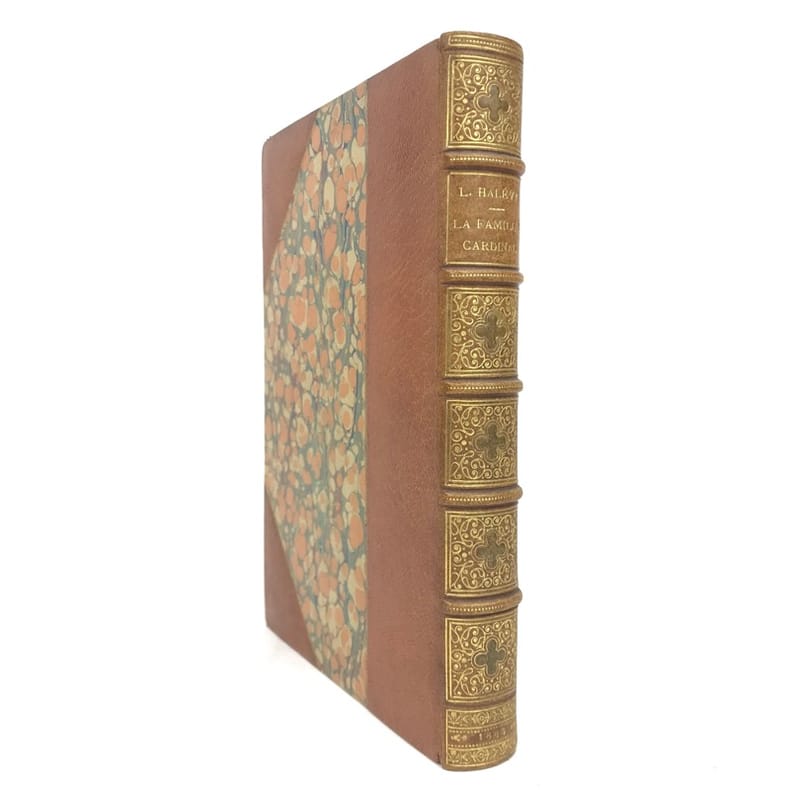 " Paris, Librairie de l'Édition Nartionale Émile Testard, 1893, grande in-8°, 27 x 17,5 cm, (8) pp nn + 197 pp + 7 pp ( tables) + (4) pp nn ( dont un blanc). Reliure en demi maroquin brun, dos à cinq nerfs avec titre doré ; tranche supérieure dorée ; les plats couverts de soie avec motifs fleuries. Couverture conservée. Tirage de luxe à 110 ex. sur Japon, exemplaire nominatifs à toutes marges. Ex-dono de l'éditeur à Léon Roger-Milès. L'édition originale de ''La famille Cardinal '' date de 1883 et décrit une famille de la petite bourgeoisie parisienne. L'auteur est surtout connu pour sa participation aux nombreux livrets d'opéra et opérettes, e.g. La Belle Hélène de Jacques Offenbach ; Carmen de Georges Bizet. Exemplaire en très bel état . Vicaire IV, col. 10 ."