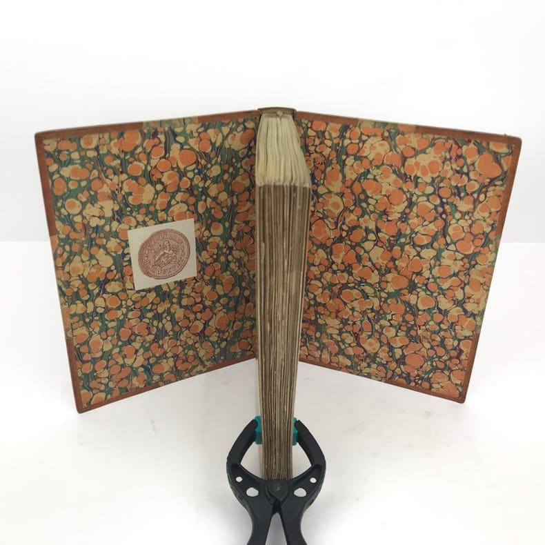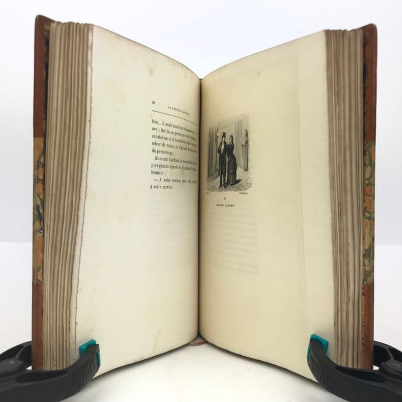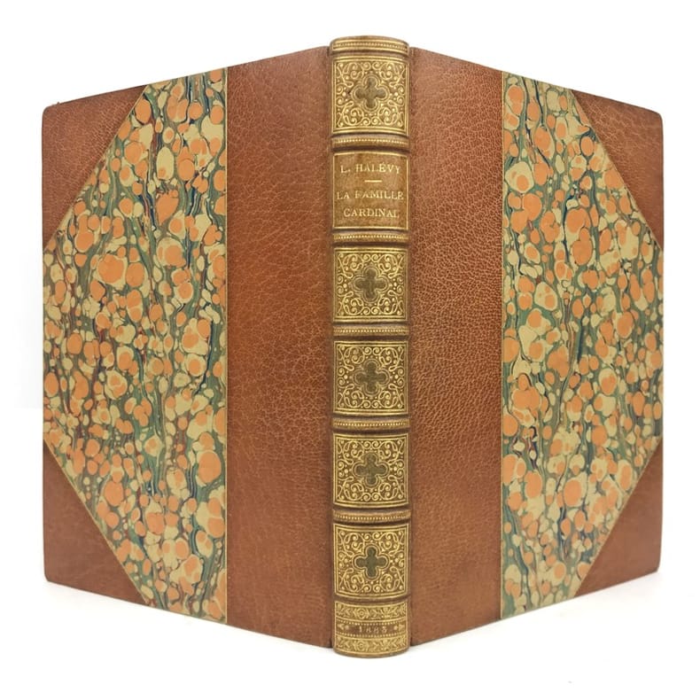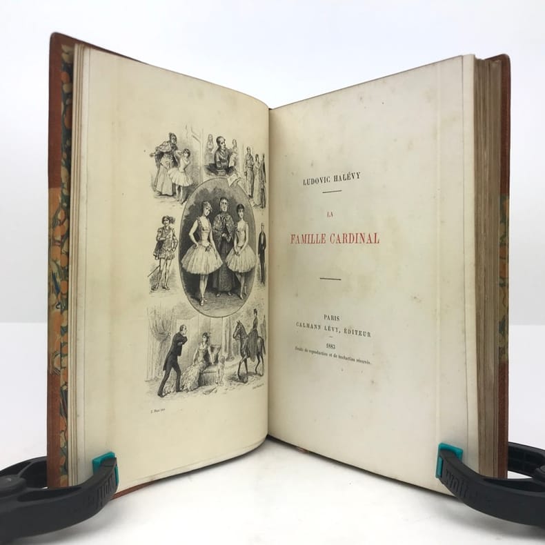1 volume in-12 (18 x 13 cm), demi maroquin ocre à coins (reliure de l’époque signée Champs), couverture conservée, dos à nerfs joliment orné et mosaïqué, filet doré en bordure, tranche de tête dorée, gouttière non ébarbée, ex-libris de H. Houyvet, titre en rouge et noir, [4]-210-[2] paris (complet). Rousseurs. État très correct tout de même. ÉDITION ORIGINALE, illustrée d’un frontispice et de 8 vignettes par E. Mas, gravés à l'eau-forte par J. Massard. Le tirage de cette édition illustrée a été limité à 200 exemplaires numérotés sur papier vergé du Marais (ici n°12[?]). Ludovic Halévy (1834-1908) est un dramaturge, librettiste d'opérettes et d'opéras, et romancier français. Il est notamment le co-auteur du livret de Carmen. Il utilise les personnages de la famille Cardinal en tant que symboles de la petite bourgeoisie parisienne pompeuse, pédante et méchante, et ainsi la parodier. Bel exemplaire.
