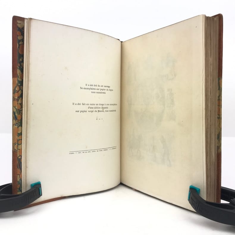 Ex-libris triangulaire au bas de la première doublure. (dos passé marron, coins en partie passés, légers frottements sur les coiffes, les coupes et les coins, déchirure en marge inférieure p. 75, rares piqûres, quelques cahiers en partie déreliés). // Quarto (256 x 173 mm), 197 pp. - (1) ff. table - 7 pp. (list of the engravings) - (2) ff., three-quarter bradel green shagreen, smooth spine tooled, mosaic flowers, top edge gilt, uncut, illustrated soft cover preserved (contemporary binding signed Bonleu). llustrated by Charles Leandre with 27 etchings, engraved by Louis Muller (including 10 plates, a title vignette, 8 headings and 8 culs-de-lampe), and 29 compositions in the text wood-engraved by Léveillé and Ruffe. Limited printing on vellum paper. (Carteret 4, p. 197). Triangle book-plate on bottom of first lining. (spine faded to brown, corners partly faded, some rubbings on spine'extremities, turns-in and corners, tear on lower margin p. 75, rare spots, some leaves partly disbound).