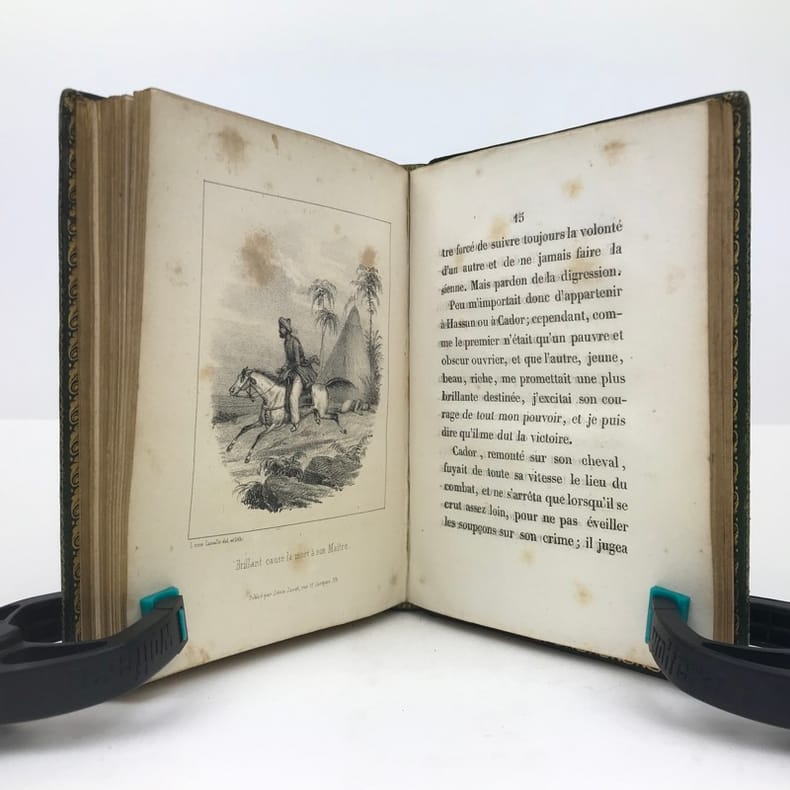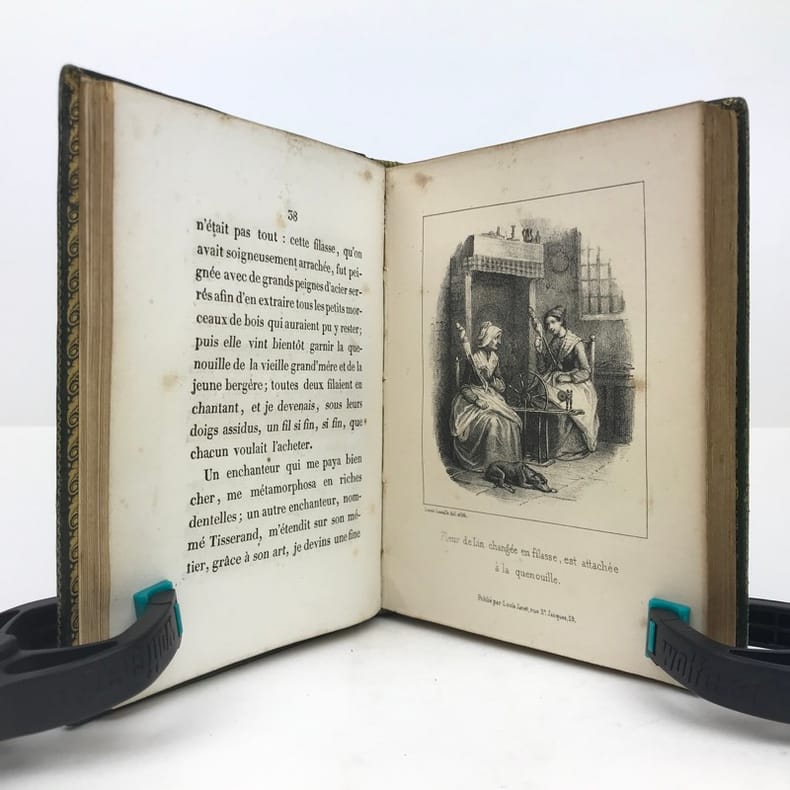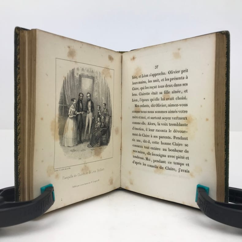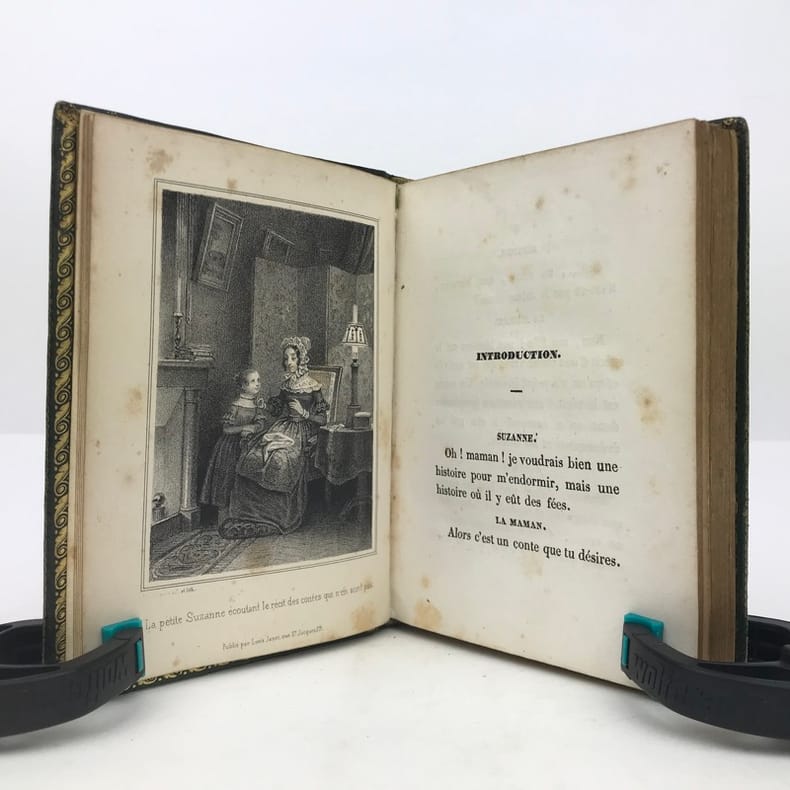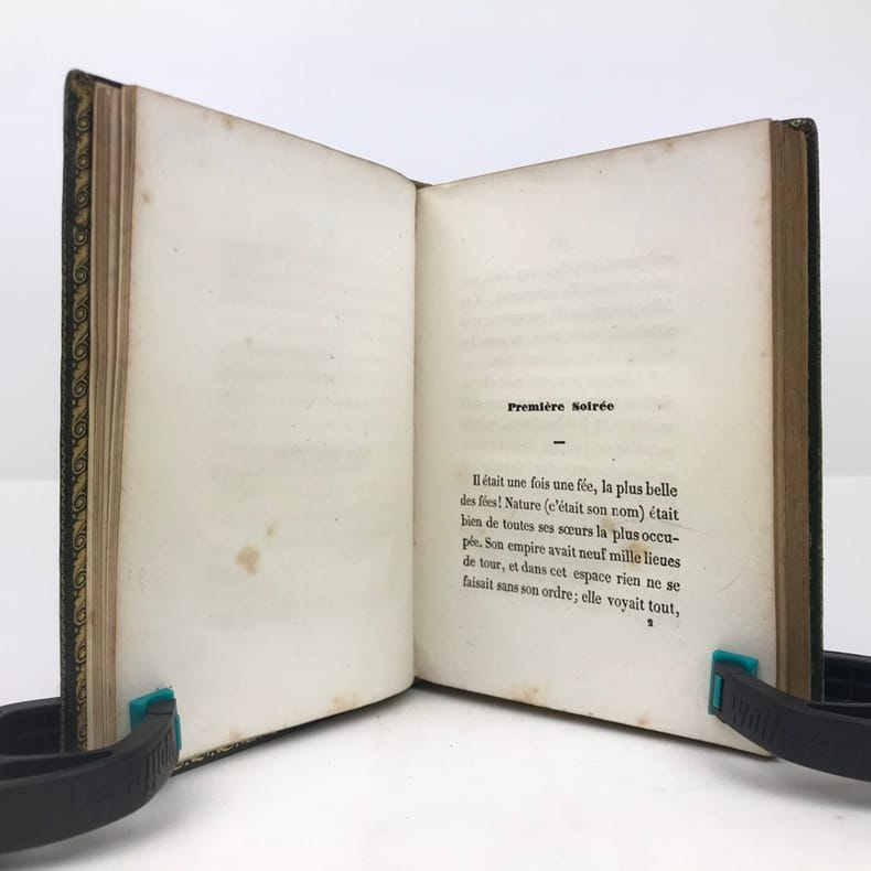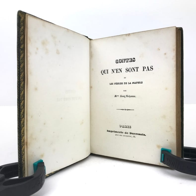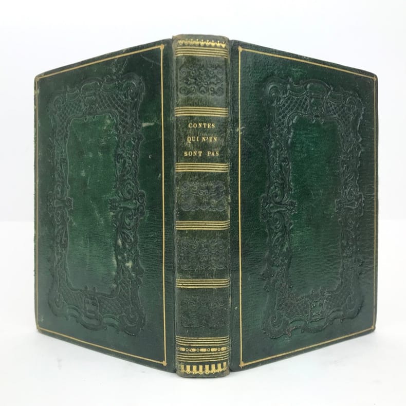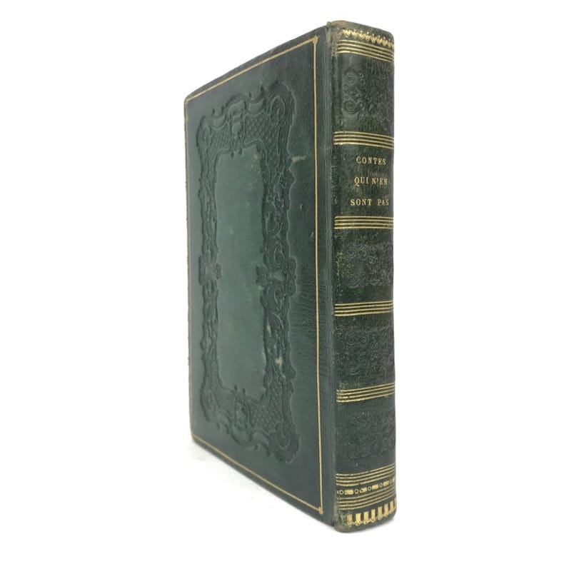 1 volume in-16 (14 x 10 cm), maroquin vert à grains longs (reliure romantique de l’époque), dos lisse orné, décor à la plaque sur les plats avec filet doré en encadrement, roulette dorée sur coupes et sur les chasses, tranches dorées, 52-45-59-[1] pages (complet). Coins et mors légèrement frottés, rousseurs. État correct. Deux ex-libris manuscrits : “Antoinette oct. 1892” et “Melle Leroy de La Madelaine”. ÉDITION ORIGINALE, illustrée de 15 gravures hors-texte. Fanny Richomme (1793-1866) est une auteure, traductrice et éditrice française. Curieux recueil de contes pour enfants, ayant pour thème principal la Nature. Rare exemplaire.