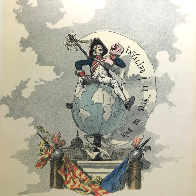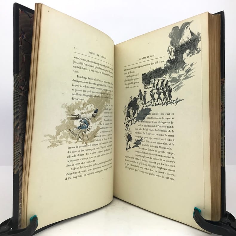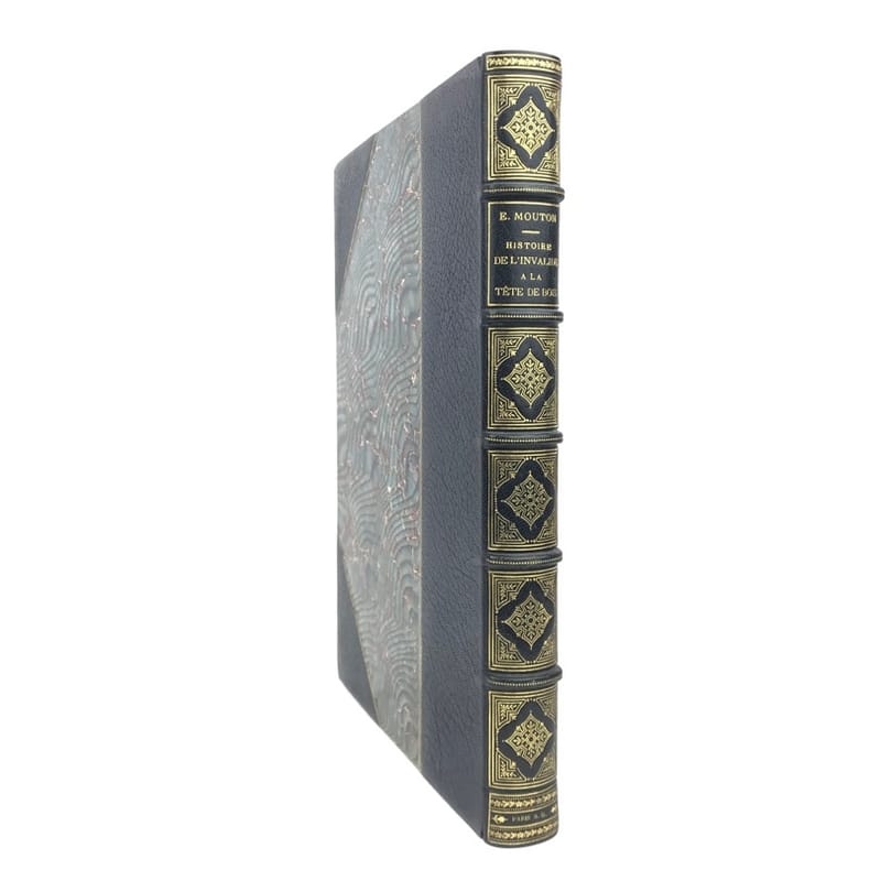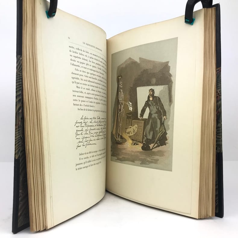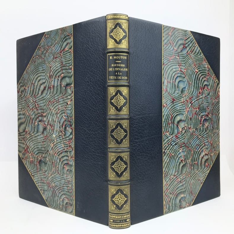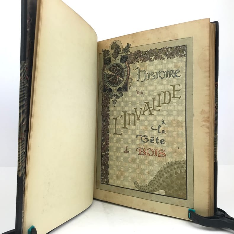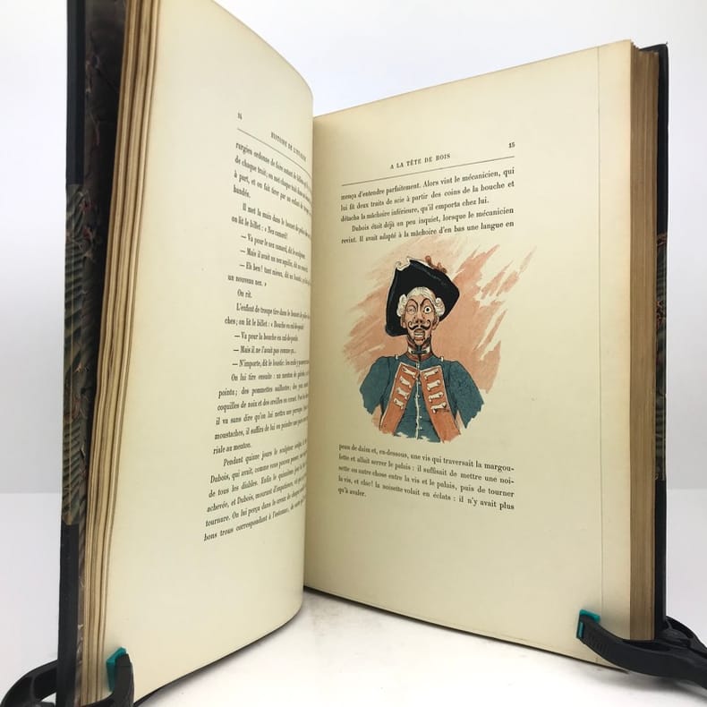 MOUTON (EUGENE)Histoire de l'invalide à la tête de boisLe squelette homogène. Le boeuf. Le coq du clocher. Paris, Ludovic Baschet, sans date (1887), in-4°, reliure demi-cuir, bords frottés, 197 pp., portrait de l'auteur lithographié en front., illustré avec talent par le peintre Georges CLAIRIN, de nombreuse compositions dans et hors-texte certaines coloriées au pochoir, intérieur frais, couvertures conservés.Agréable exemplaire