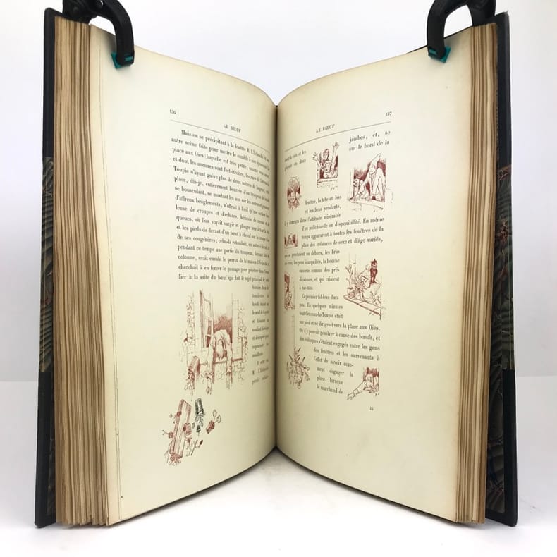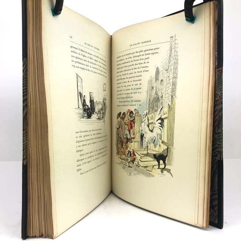 Le squelette homogène-le bœuf-le coq du clocher.In 4 reliure éditeur, pleine toile rouge titre au dos et sur le premier plat,doré.Faux-titre, portrait de l’auteur, en frontispice, sous serpent, titre illustré en couleurs, sous serpent,198 pages,nombreuses illustrations de Georges CLAIRIN hors texte et dans le texte, en noir en sépia et en couleurs. A savoir 12 hors-texte en couleurs, un hors-texte en héliogravure, 143 dans le texte et lettrines. Non rogné, tête dorée. Les deux plats de couverture sont conservés, deux déchirures longitudinales réparées, coin inférieur droit du premier plat, légèrement émoussé. A signaler un petit trou,(punaise?) du l premier plat de couverture en s’atténuant jusqu’à la page 9,pour disparaître à la page 10, quelques traces de manipulations habituelles,cela sans gravité