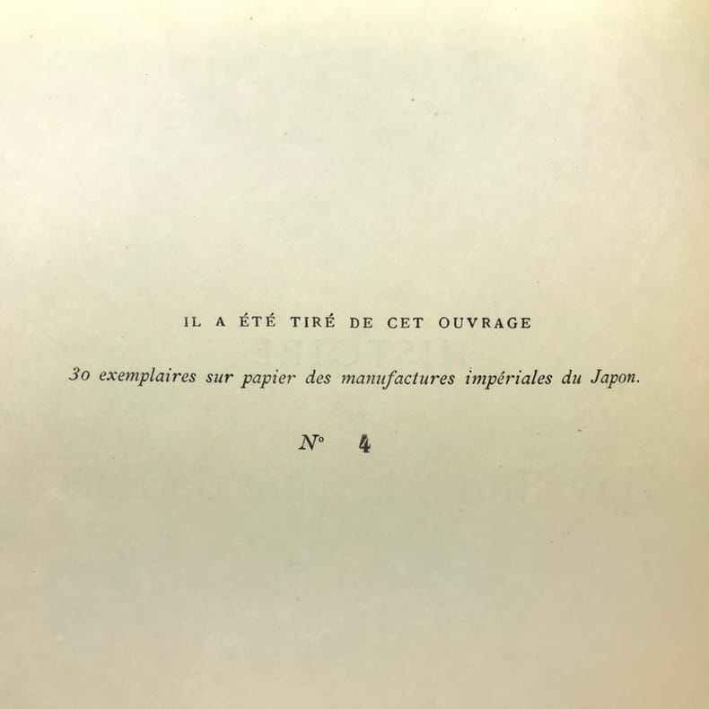 1 volume in-4 (31 cm x 22 cm), demi-maroquin noir à coins (reliure signée V. Champs), dos à nerfs orné de motifs dorés, couverture conservée, ex-libris d’Alfred Muragnyi Rohó contrecollé sur le contreplat. [2]-197-[1]-1 bl. pages (complet). Très bon état. Première édition, illustrée d’un frontispice ainsi que de nombreuses gravures in-texte en couleurs dont 17 à pleine-page de G. Clarin. Tirage à 30 exemplaires sur papier des manufactures impériales du Japon, ici n°4. (Pierre Martin Désiré) Eugène Mouton, connu aussi sous le pseudonyme de Mérinos, (1823-1902), est un magistrat et écrivain humoristique et fantastique français. En 1857, il publie dans Le Figaro L'invalide à la tête de bois qui lui donne la célébrité. Il abandonne ainsi l’administration en 1867 pour se consacrer à l’écriture. Il pastiche notamment Les Aventures du capitaine Corcoran, d'Alfred Assolant avec Voyages et Aventures du Capitaine Marius Cougourdan. Bel exemplaire.
