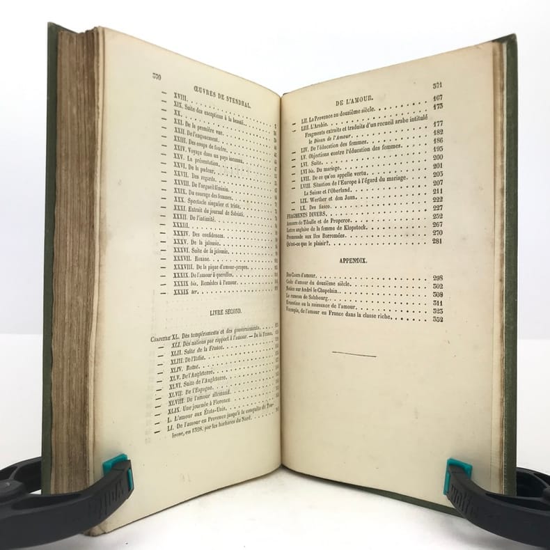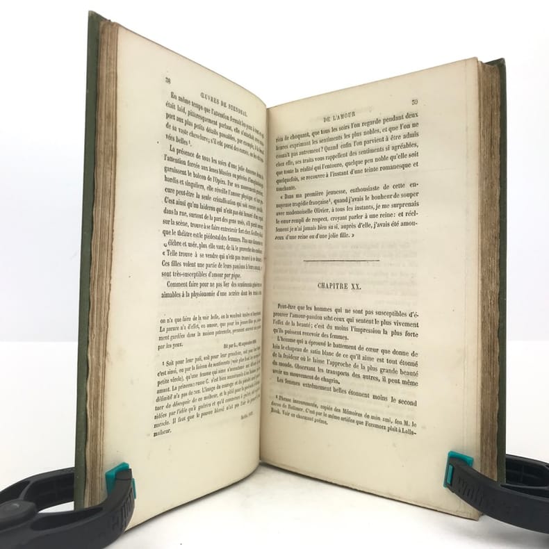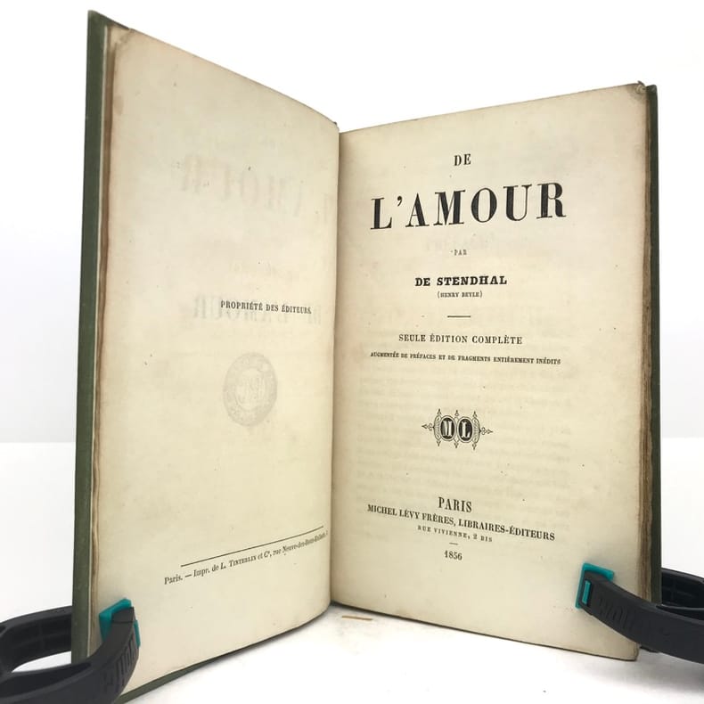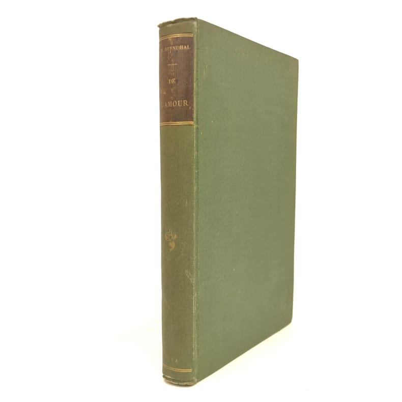 1 volume in-8 (18,5 cm x 11,5 cm), toile verte à la bradel, pièce de titre brune, fleuron doré. xxiii-1 bl.-367-1 bl.-[1]-1 bl. pages (complet). Toile frottée, rousseurs. État correct. Nouvelle édition. Sous couvert d’analyse psychologique et sociologique de l’amour, Stendhal exprime sa passion malheureuse pour Matilde Viscontini Dembowski dans son ouvrage De l'Amour, publié en 1822. C’est dans cet écrit qu'il développe et décrit le célèbre phénomène de la cristallisation. L'ouvrage est divisé en deux livres, le premier se consacre à l'analyse psychologique du sentiment amoureux ; le second propose une étude sociologique des mœurs amoureuses de différents pays, ainsi que sur l'éducation des femmes. Agréable exemplaire.