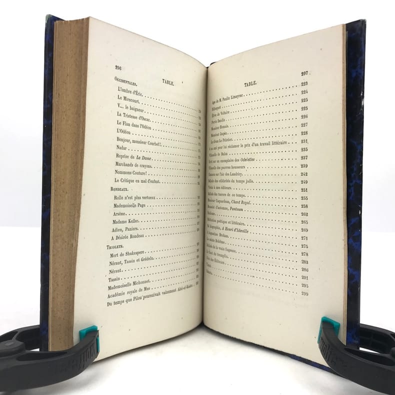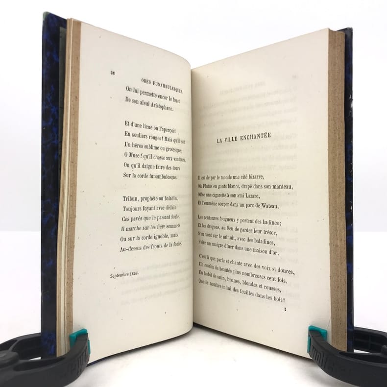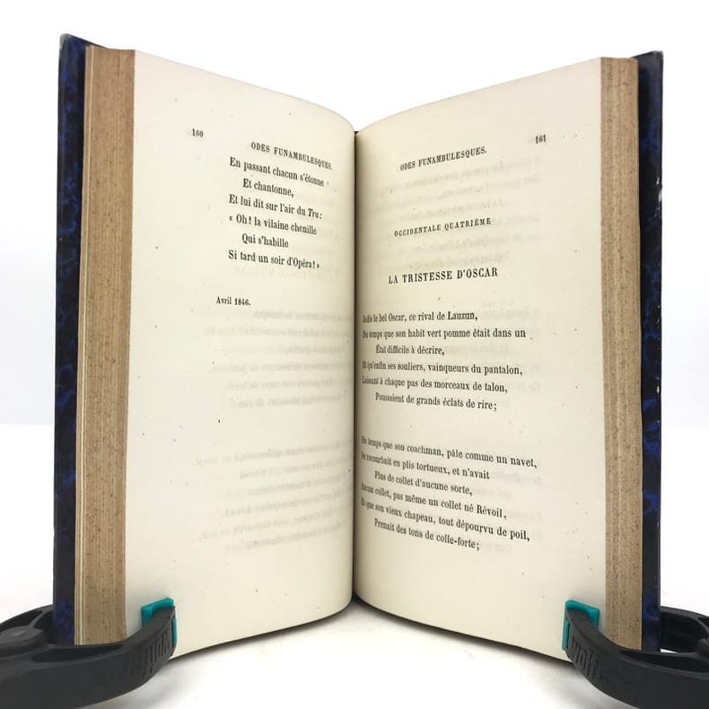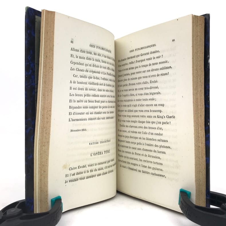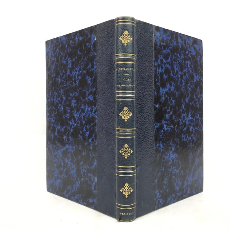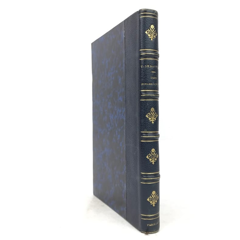 1 volume in-12 (17,5 cm x 12,5 cm), demi-chagrin bleu (reliure de l’époque signée Petit successeurs de Simier), dos à nerfs orné de fleurons et de filets dorés. [4]-300 pages (complet). Rousseurs. Bon état. Deuxième édition illustrée d’un frontispice. Théodore Faullain de Banville, (1823-1891), est un poète, dramaturge et critique dramatique français. Célèbre pour les Odes funambulesques et Les Exilés, il est surnommé « le poète du bonheur ». Ami de Victor Hugo, de Charles Baudelaire et de Théophile Gautier, il est considéré de son vivant comme l’un des plus éminents poètes de son époque. Les Odes funambulesques notamment lui apportèrent la consécration de son style et marquèrent une évolution vers plus de souplesse et de charme dans ses vers. Bel exemplaire.