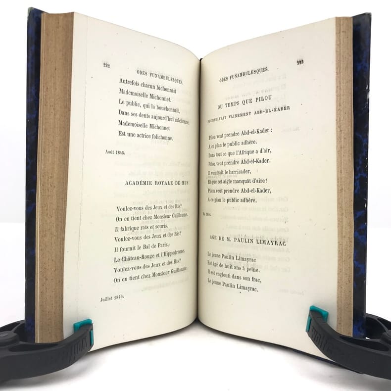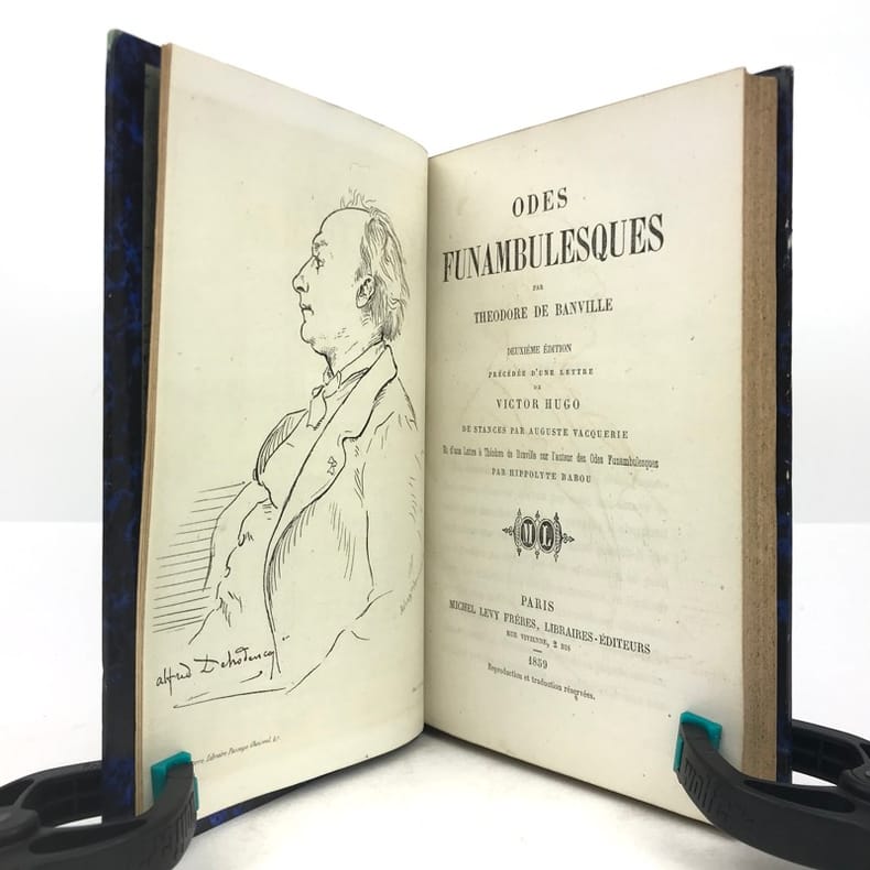 Dans cette seconde édition Th. de Banville tient compte des observations et critiques qui lui ont été faites deux ans plus tôt, lors de la première parution des Odes chez Poulet-Malassis. Il n'y a rien retranché cependant, ajoutant et corrigeant pour que la fantaisie s'affirme davantage que la satyre. L'oeuvre n'a rien perdu de son mordant et de sa critique à l'égard de la bourgeoisie qu'il définit ainsi dans une réédition de 1874 : "...bourgeois signifiait l'homme qui n'a d'autre culte que celui de la pièce de cent sous, d'autre idéal que la conservation de sa peau, et qui en poésie aime la romance sentimentale, et dans les arts plastiques la lithographie coloriée. Aussi ne devra-t-on pas s'étonner de voir que j'ai traité comme des scélérats des hommes fort honnêtes d'ailleurs, qui n'avaient que le tort (et il suffit) d'exercer le génie et d'appartenir à ce que Henri Monnier à justement nommé : la religion des imbéciles !"Dans le catalogue que les Librairies Oberlé, Brézol et Devaux consacrèrent au poète à l'occasion du centenaire de sa mort (Moulins 1991), on peut lire ces mots, presque aussi lyriques que ceux adressés à Banville par Victor Hugo et placés en tête de la seconde édition : Dans "ce volume extraordinaire, Banville endosse le costume du funambule, du saltinbanque [...]. Oublier le vulgaire odieux, le convenu, le factice, les phrases creuses des politicards, la bêtise candide, les banalités pompeuses, les décors hideux des "intérieurs" aux faux bronzes et lampes roses, les coulisses des ménages pharisiens, les femmes plus rapaces que les usuriers, les faux diamants, les fausses vertus, la gaité postiche, les bourgeois de province [...] Oublier tout cela, quitter la terre et s'élever jusqu'aux éthers d'où l'on ne peut apercevoir le lugubre habit des notaires et des épiciers. [...] Le saut du tremplin envoie le funambule vers les étoiles, dans cet espace où règne la Beauté". La première édition des Odes avait parue quelques mois avant les "Fleurs du Mal" de Baudelaire.