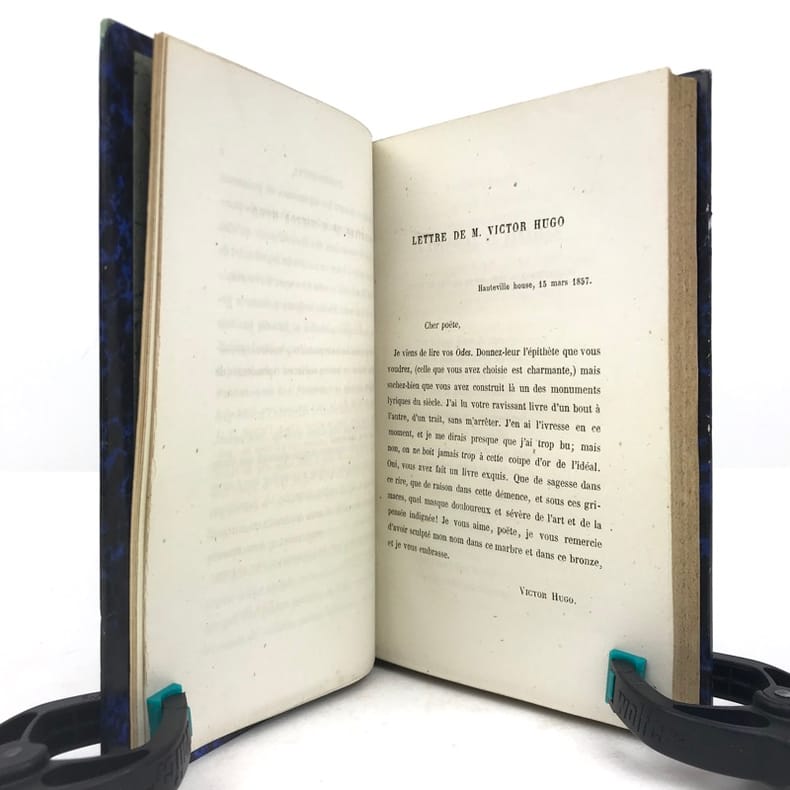 in-18, 2f. et 300p. :: 2e édition, au nom de l'auteur, la première en 1857 était anonyme. Vicaire 19e, 1, 263. :: 2 édition, en partie originale de la lettre de Victor Hugo et des textes de Vacquerie et Babou. :: Contient la préface de la première édition. L'errata est aux pages 299-300. :: Cartonnage postérieur de toile moutarde, dos lisse au nom du Fraser Institute en queue. Ex-libris et cachets à froid du Fraser Institute. Bon état.