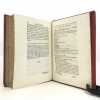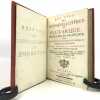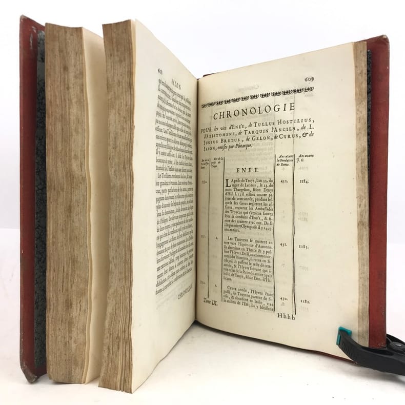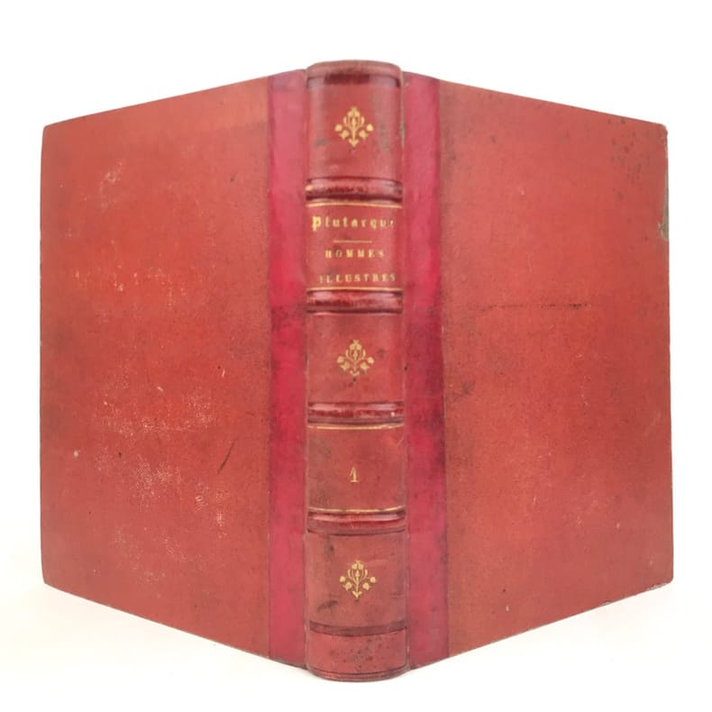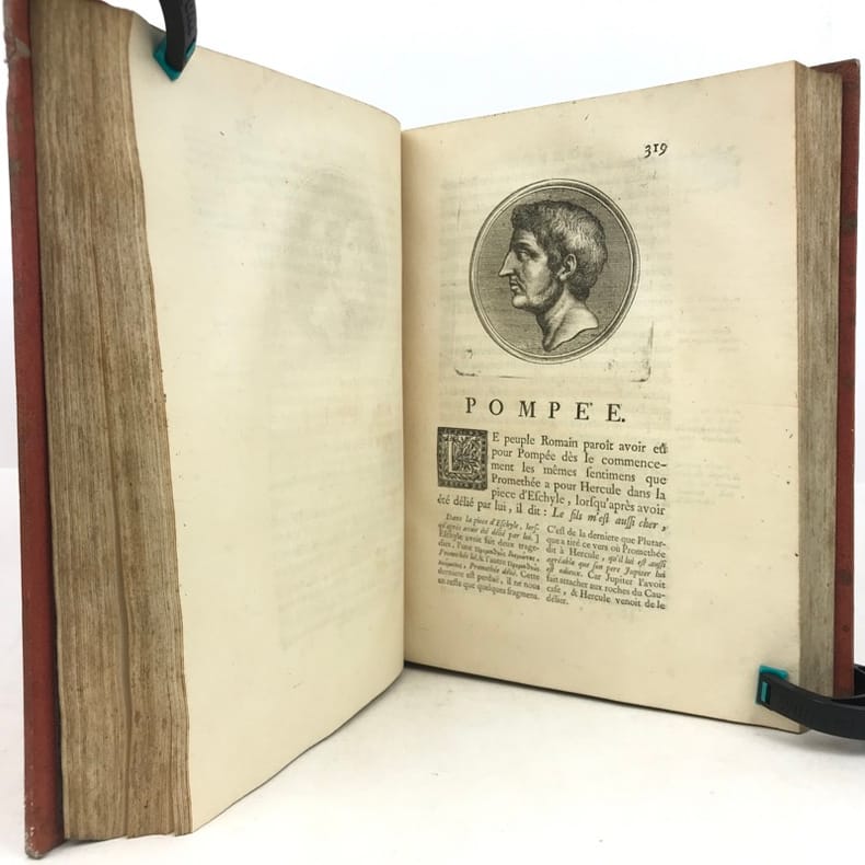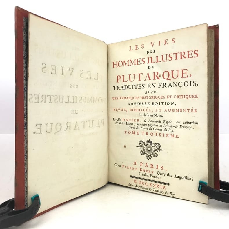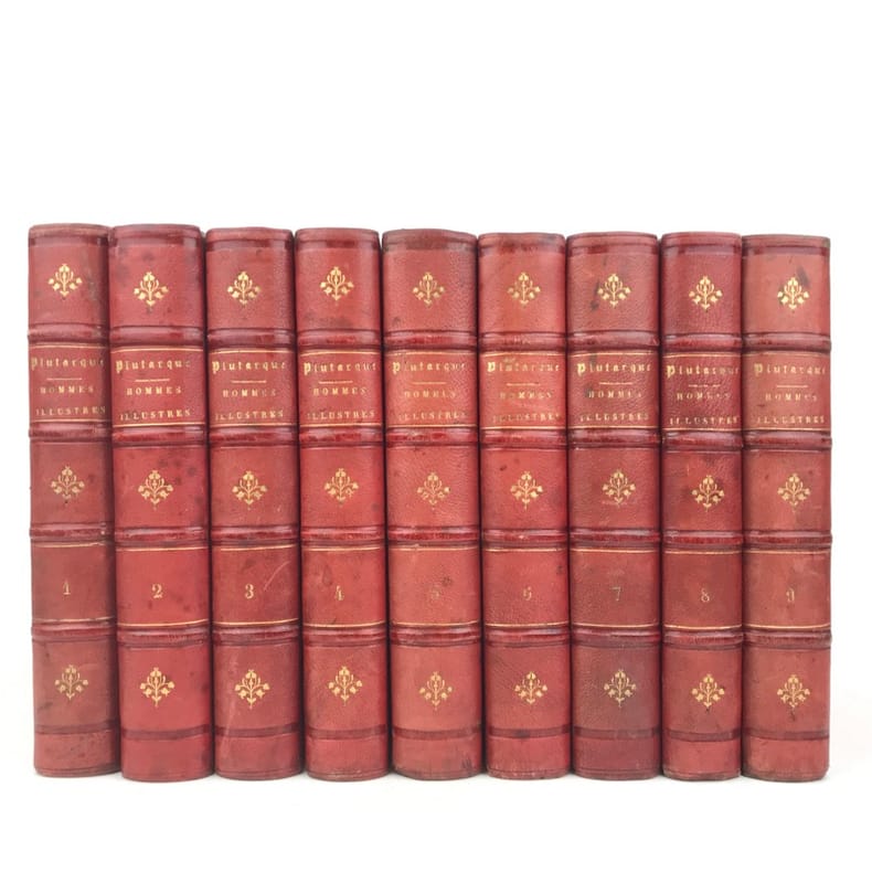 9 volumes in-4 (24 x 18 cm), demi chagrin rouge (reliure postérieure du XIXe siècle), dos à nerfs orné, tranches mouchetées, titre en rouge et noir, [8]-xlix-[3]-568 ; [4]-674 ; [4]-626 ; [4]-600 ; [4]-704 ; [4]-602 ; [4]-656 ; [4]-561-[1] ; [4]-ix-[3]-672-[4] pages (complet). Portrait d'Artaxerxès au tome VIII laissé blanc par l’imprimeur, quelques fines taches sur les plats, rousseurs éparses. État très correct. Nouvelle édition des célèbres Vies parallèles de Plutarque, philosophe grec du Ier siècle de notre ère. Elles mettent chacune en scène un personnage latin face à un personnage grec, tel que César et Alexandre le Grec, et cherchent à expliciter les similarités entre les différentes vies décrites. La traduction française est ici réalisée par André Dacier (1651-1722), philologue des XVIIe et XVIIIe siècle, traducteur de nombreux auteurs anciens, tant grecs que latins. Agréable exemplaire.