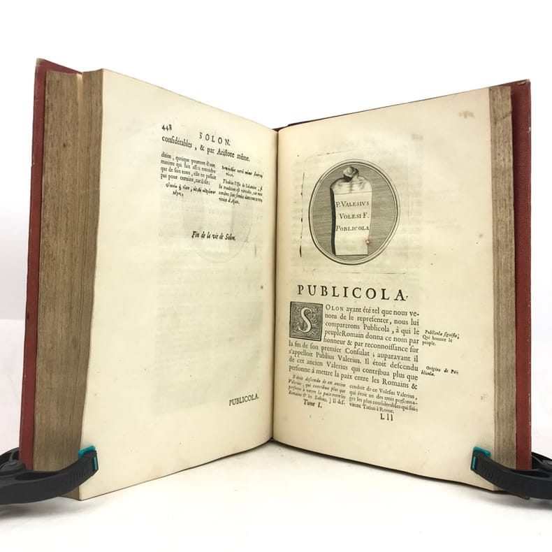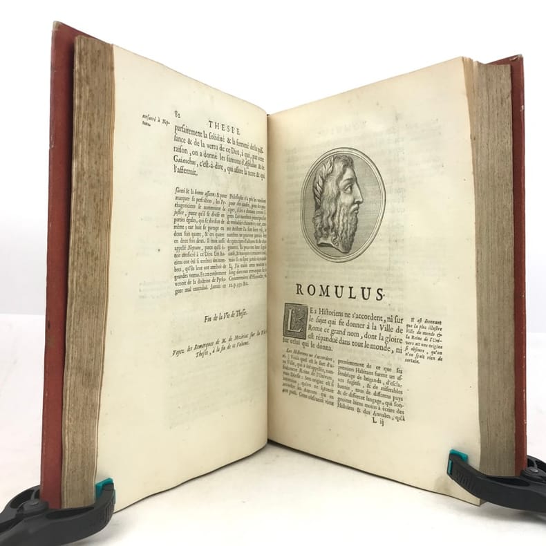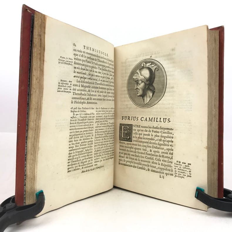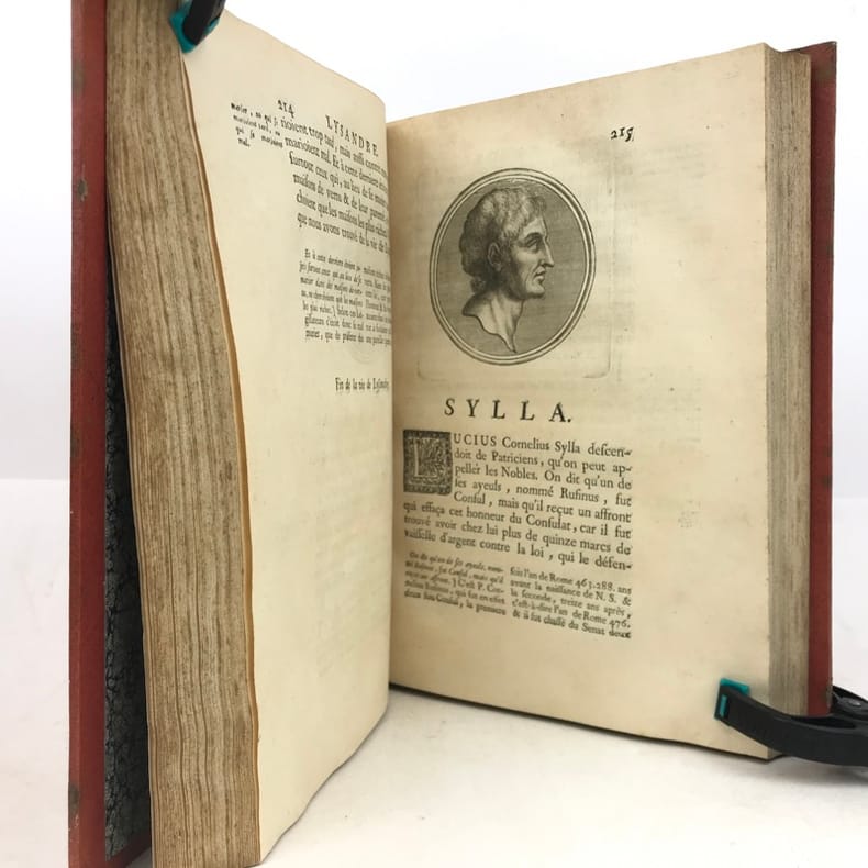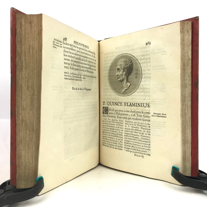 Cette traduction de Plutarque par le philologue André Dacier est plus exacte que celles d'Amyot ou de Tallemant, mais le style en est plus austère. Le traducteur avait publié dès 1699 la matière de son premier volume, soit cinq "Vies", cela afin d'interroger le public sur la suite à donner à sa longue et difficile entreprise. Madame Dacier aurait traduit deux biographies. 40 portraits en médaillon, 18 autres sont laissés en blanc faute de source. Le neuvième volume, publié treize années plus tard, contient les vies traduites de Thomas Rowe par l'abbé Bellanger, à savoir Enée ; Tullus Hostilius ; Aristomenes ; Tarquin l'Ancien ; L. Junius Brutus ; Gelon ; Cyrys ; Jason. Cette traduction de Dacier fut plusieurs fois réimprimée jusqu'au début du XIX°s., dans des formats divers. (Brunet IV, 739 - Quérard 7, p. 225 - Graësse V p. 368). - Mouillure claire dans la partie supérieure de 3 volumes ; une pièce de titre manque ; 8 mors fendus, 2 coiffes endommagées, le reste des dos, plats et coins est en bon état.