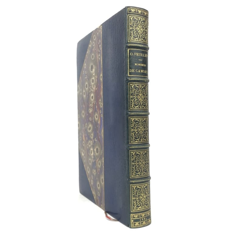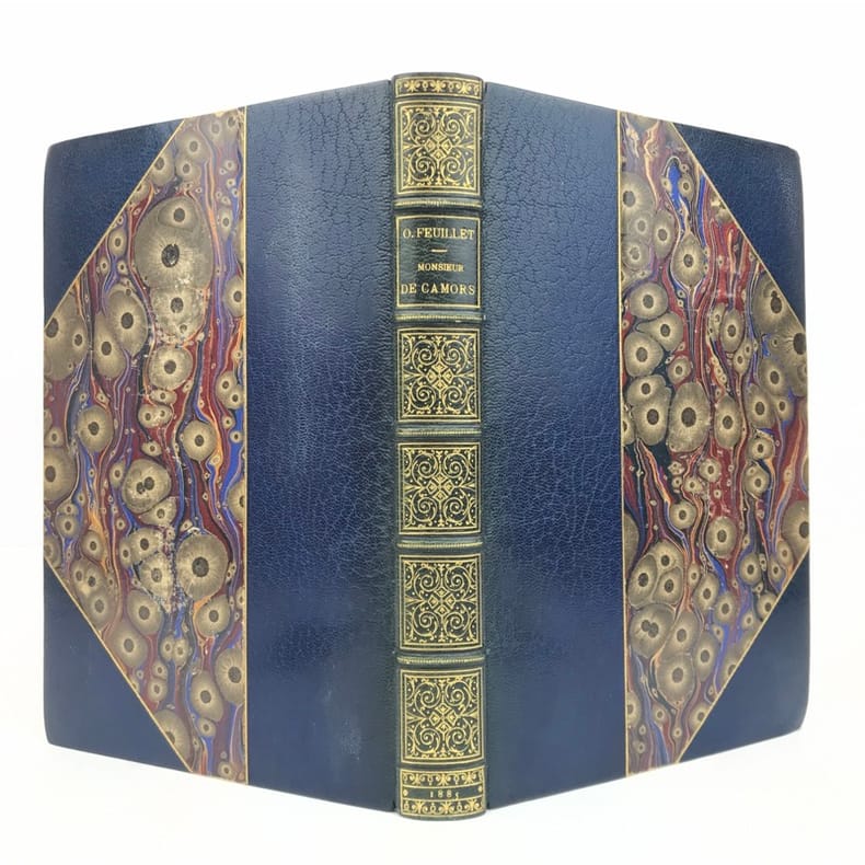 1 volume grand in-8 (23 x 15,5 cm), demi maroquin bleu à coins (reliure de l’époque signée Bretault), couverture conservée, dos à nerfs joliment orné, filet doré en bordure, tranche de tête dorée, [4]-314-[2] pages (complet). Coins légèrement frottés, début de fente en tête du mors supérieur, rousseurs. État correct.Exemplaire ayant appartenu à Aristide Marie, bibliographe, avec son ex-libris sur le contreplat supérieur et un dessin original aquarellé signé de sa main.Nouvelle édition, illustrée de 11 gravures hors-texte, réalisées par S. Rejchan et gravées par Mme Louveau-Rouveyre et Daumont et Duvivier.Octave Feuillet (1821-1890) est un auteur français, comparé en son temps à Alfred de Musset.Il publie pour la première fois Monsieur de Camors en 1867, roman qui deviendra très vite son œuvre la plus célèbre, évoquant morale et amour.Agréable exemplaire.