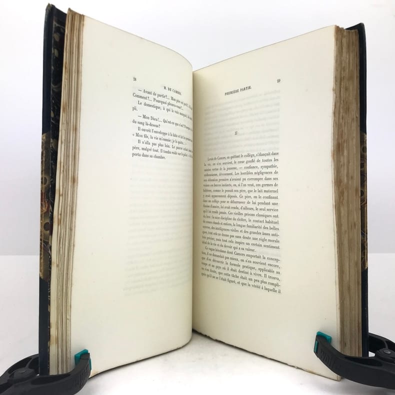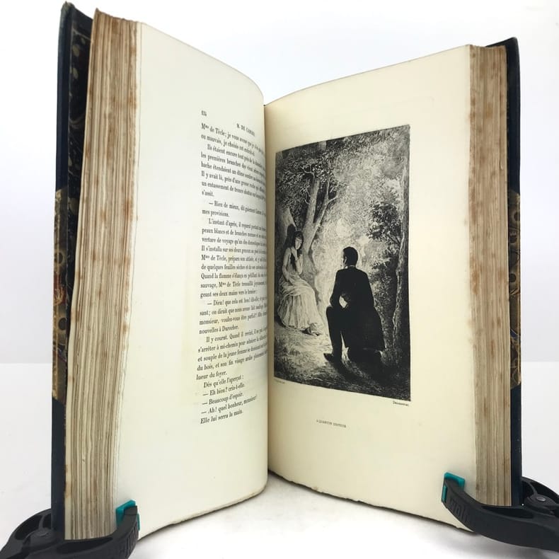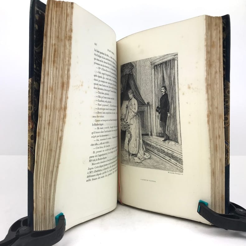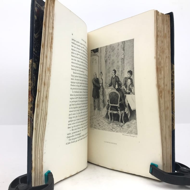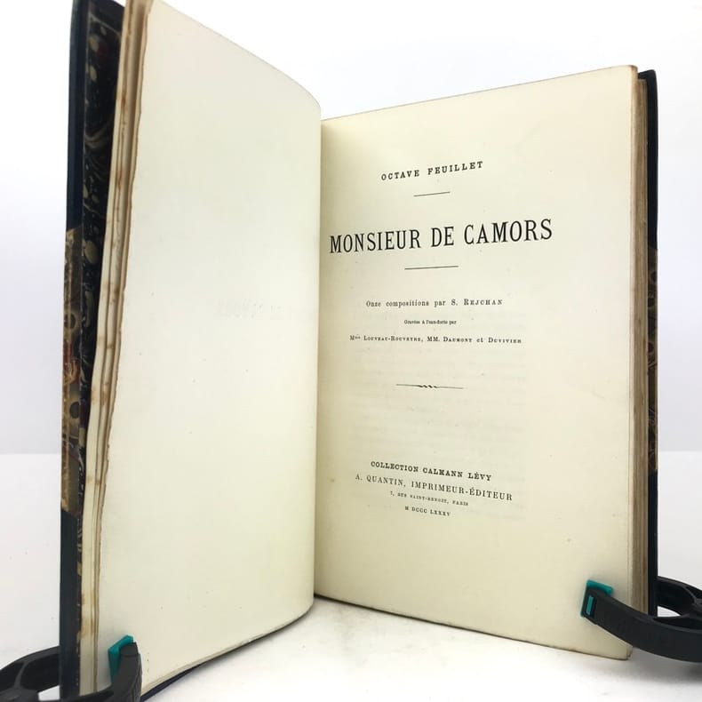 Par Octave Feuillet. Onze compositions par Stanislas Rejchan (1858-1919). Gravées à l'eau-forte par Mme Louveau-Rouveyre, MM. Daumont et Duvivier.Cette édition en grand format a été exécutée seulement à 100 exemplaires numérotés sur papier du Japon avec deux Suites des planches. Exemplaire numéro 26. Enrichi d'un dessin en couleurs.Paris, A. Quantin, Collection Calmann Lévy, Les Chefs-d'oeuvre du Roman Contemporain - 1885 - viii et 314 pages.Belle reliure demi chagrin vert à coins de l'époque. Dos à nerfs orné et doré. Tête dorée sur témoins, non rogné. Couverture et dos conservés. Pas de rousseur. Parfait état. Format in-4°(29x21).Octave Feuillet (1821-1890) est un romancier et dramaturge français, surnommé le « Musset des familles ». Il fut membre de l'Académie française. Monsieur de Camors est publié pour la première fois en 1867.