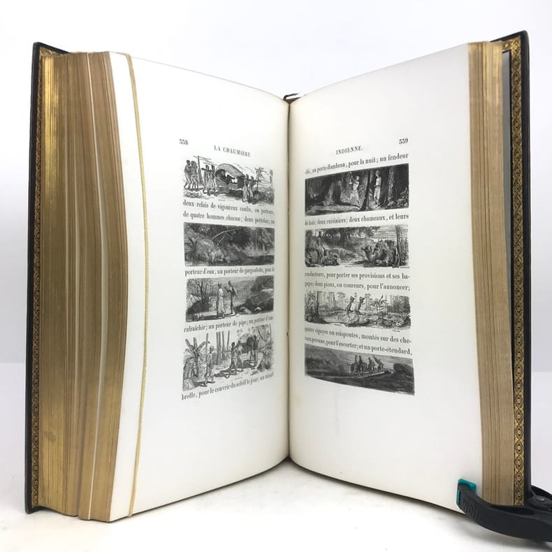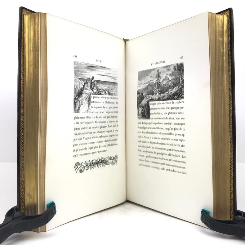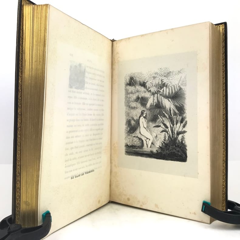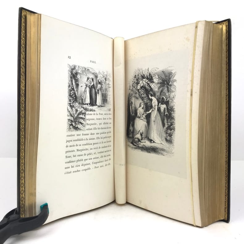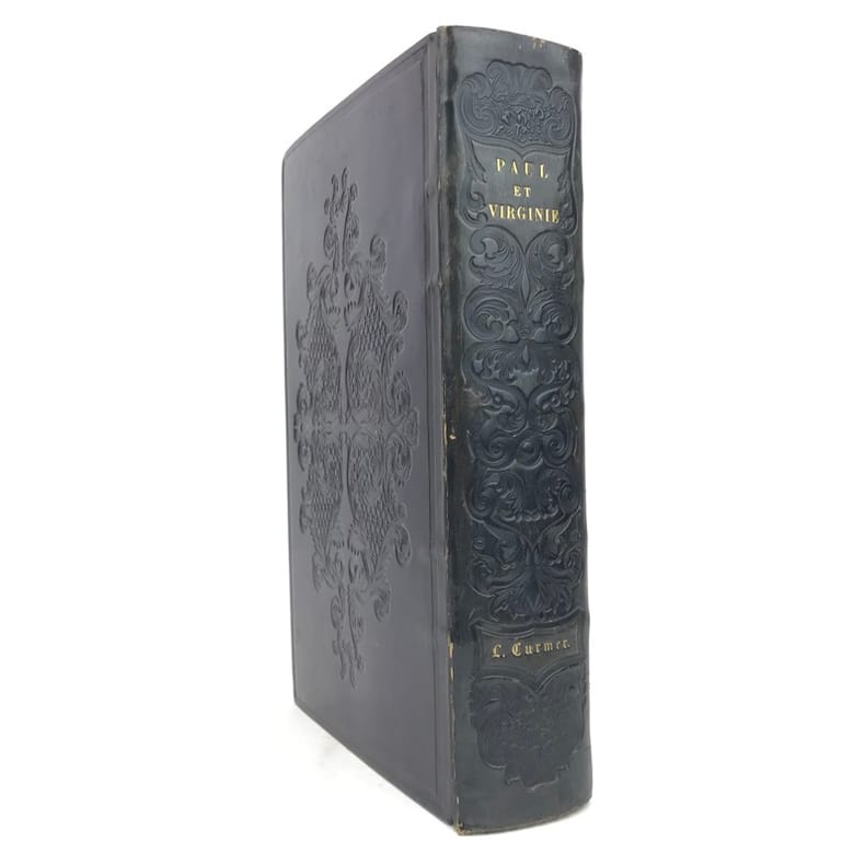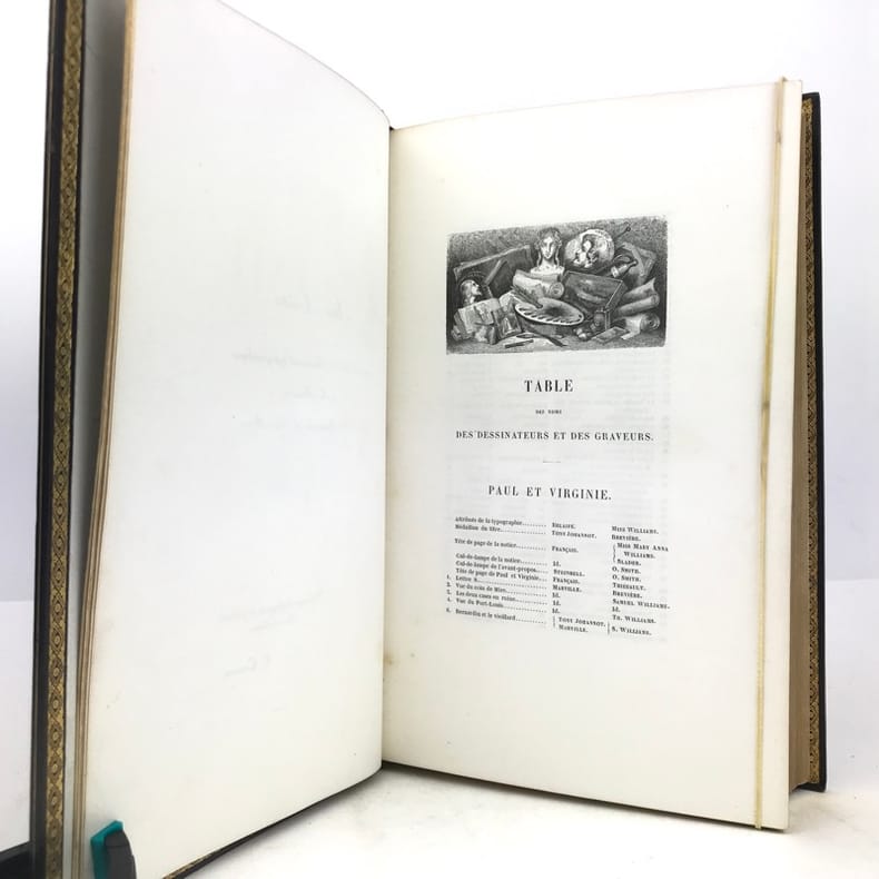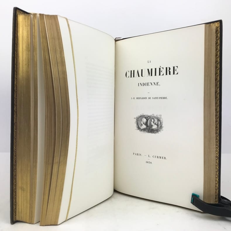Célèbre édition, la plus réussie de cet ouvrage et l'un des plus beaux livres illustrés romantiques.Elle est illustrée d'un frontispice, de sept portraits, de 29 gravures sur bois hors-texte, tous sur Chine appliqué, et environ 450 vignettes in-texte par Johannot, Français, Meissonier, Huet, ... et d'une carte de l'Île de France gravée et coloriée sur Chine appliqué, dressée par Dufour. L’ouvrage contient également une vignette représentant les attributs de l’imprimerie et de la librairie au verso de la page de faux-titre.Le portrait de Bernardin de Saint-Pierre est encadré d'un filet doré mais n'est pas à la sphère.Exemplaire de second tirage avec la nouvelle adresse de Curmer : 49 rue Richelieu, sur papier vélin. La préface se termine par 8 lignes.Nous trouvons entre les pages XII et XVII, des pages paginées IX à XVI, répétant les pages V à XII correspondant a la notice historique sur Bernardin de Saint-Pierre. Le large en-tête végétal y est du coup répété. Nous avons donc une erreur de pagination, cette notice historique passant de la page XII à XVII, sans manque de texte.Collation conforme à Vicaire hormis la gravure "Songe de Marguerite" reliée par erreur dans La Chaumière indienne.Exemplaire exempt de rousseurs. Légers frottements aux coupes et coins légèrement émoussés. Vicaire, VII, pp 42 à 68.