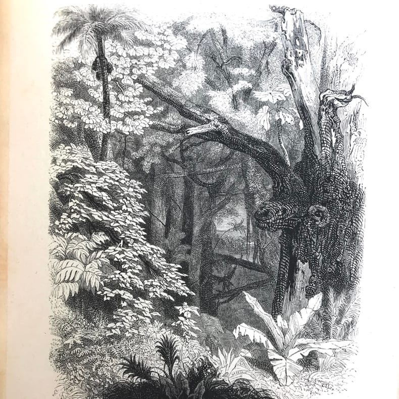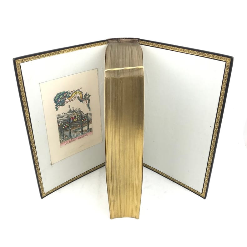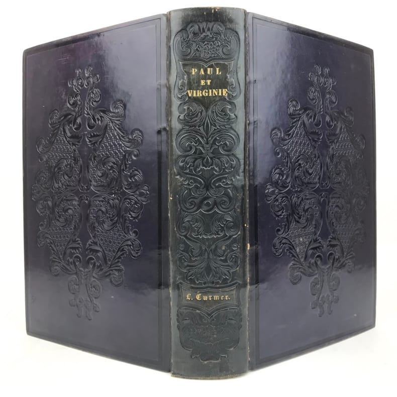 Edition célèbre de Paul et Virginie, considérée comme l’une des plus belles productions de la période romantique. Carteret, III, 532; Vicaire, VII, 42-48. On trouve à la suite de Paul et Virginie: La Chaumière indienne et la Flore de Paul et Virginie. L’abondante illustration se compose d’environ 450 vignettes dans le texte, dessinées par Meissonier, Français, Tony Johannot, Isabey, Paul Huet, Marville, Steinheil, … gravées sur bois par Lavoignat, Brévière, Porret, … de 29 planches hors texte dessinées et gravées sur bois par les mêmes artistes, de 7 portraits gravés sur acier par Cousin, Pelée, Pigeot et Revel et d’une carte coloriée de l’Ile de France. «L’éditeur avait le désir que ‘Paul et Virginie’ fût relié convenablement par des relieurs de son choix, ‘reliures très soignées, analogues à l’ouvrage, d’un prix modéré, reliures en basane, mouton, veau, maroquin, chagrin, cuir de Russie, vélin, soie, moire, velours, etc.; des demi-reliures et cartonnages, par conséquent, des reliures à tous prix, mais nous avons fait disposer une reliure magnifique et toute spéciale. M. Simier, relieur du roi, est chargé de ce travail. Hélas! presque tous ces exemplaires reliés de leur temps sont très piqués, surtout les gravures hors texte, et ces taches d’humidité sont la cause que les amateurs, avec raison d’ailleurs, préfèrent constituer un bel exemplaire en reliure moderne». (Carteret). Très bel exemplaire d’une grande fraicheur, dans une magnifique reliure en maroquin rouge à grande plaque dorée dite «à l’indienne» attribuable à Simier.